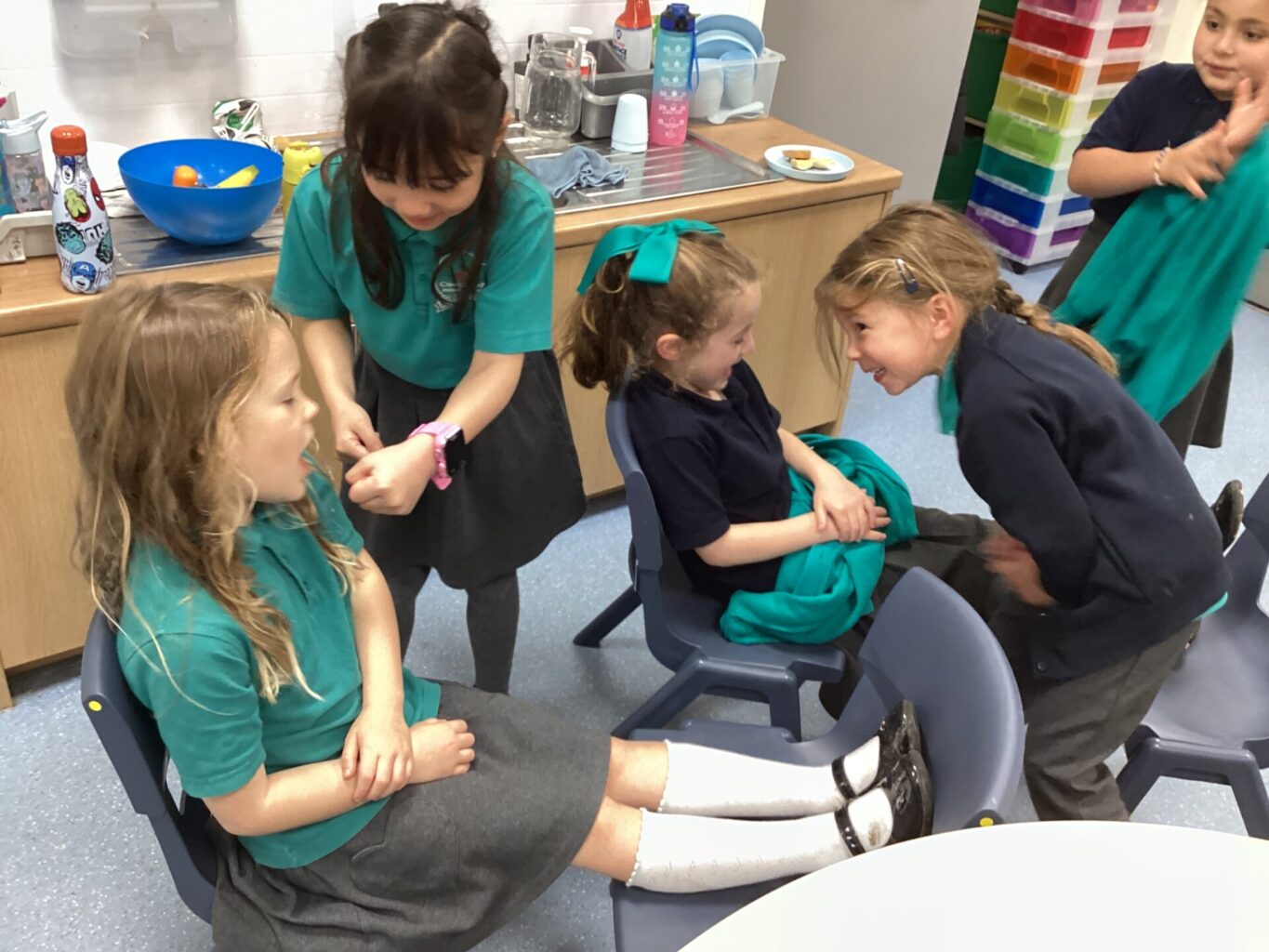 In design technology, the children have begun to make their lamps for Florence Nightingale. The chopped the tops of bottles and thought about how to stick the tissue paper around it. In food technology the children were making and tasking riata, learning to chop safely and combine ingredients.