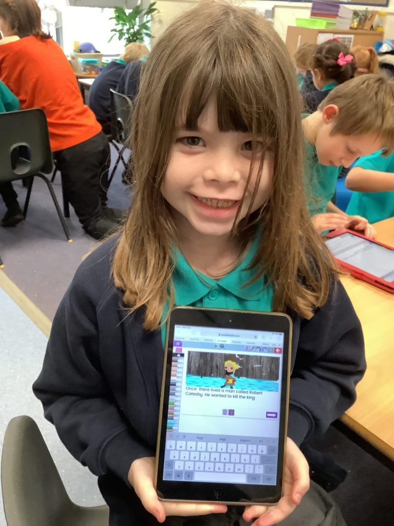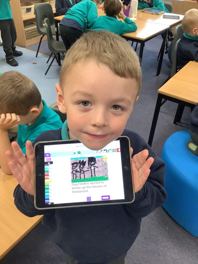 In computing, we were learning how to use technology for different purposes. We used the Simple story app on Purple mash to type sentences and draw pictures to tell the story of the Gunpowder plot.. We were able to add extra pages and then learned how to save it into a file.