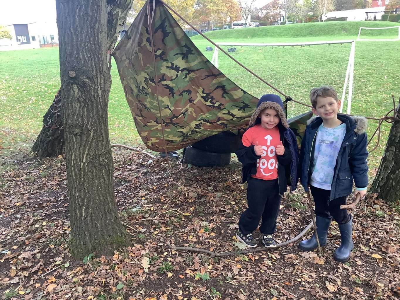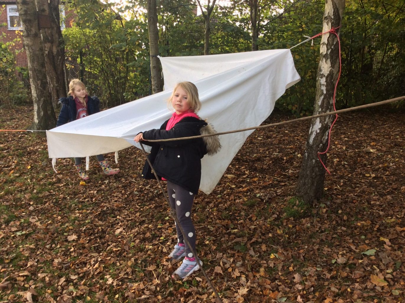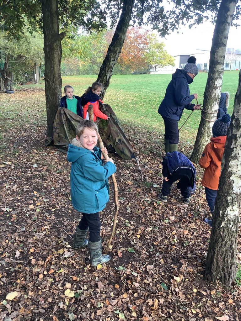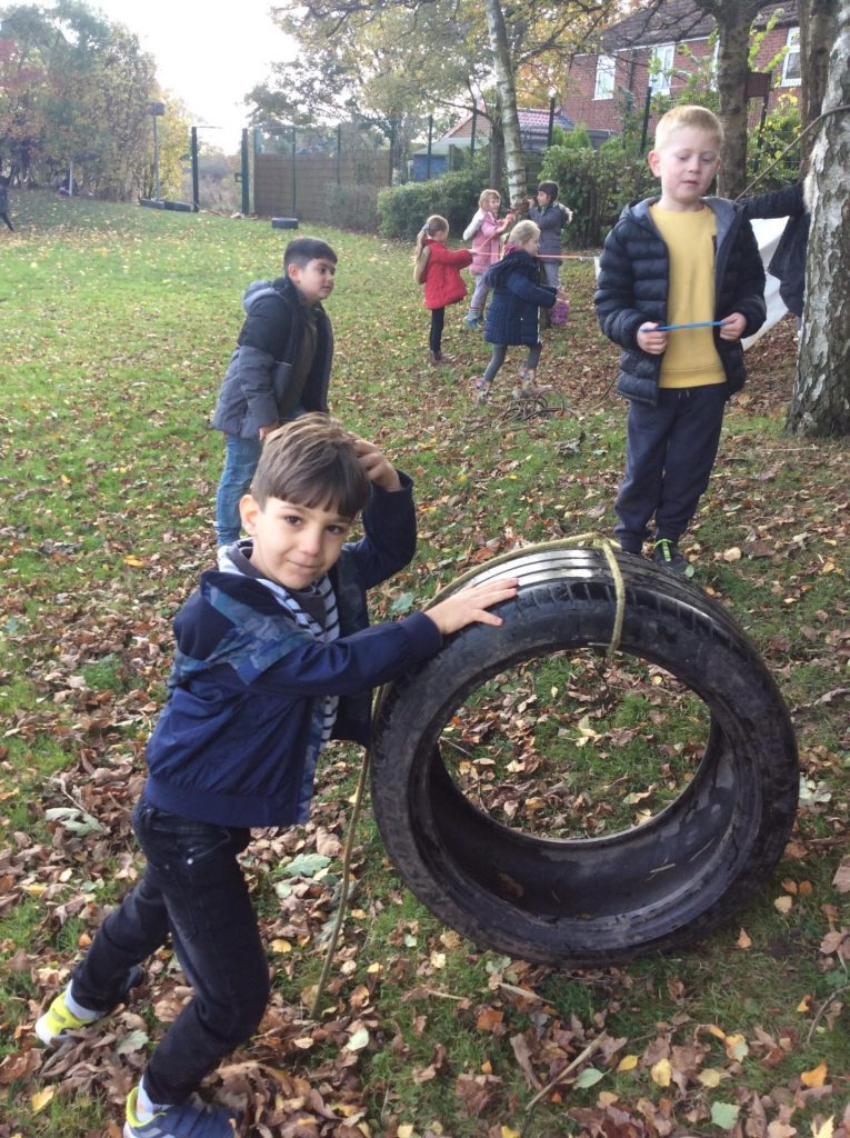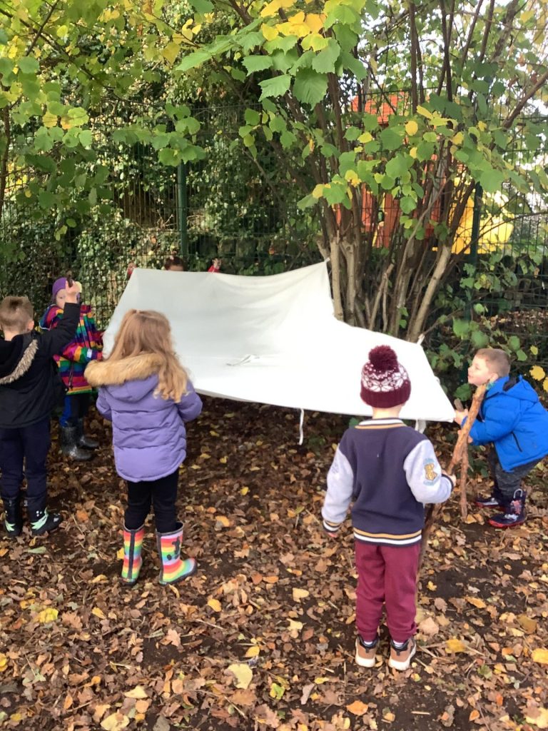 Our castles topic is in full swing now and the children are getting good at naming the different features of a castle. Our forest schools session focused around making a castle, using tarps and ropes etc… we had to ensure we had a roof, walls that could stop people coming in and then began to add features like a drawbridge.