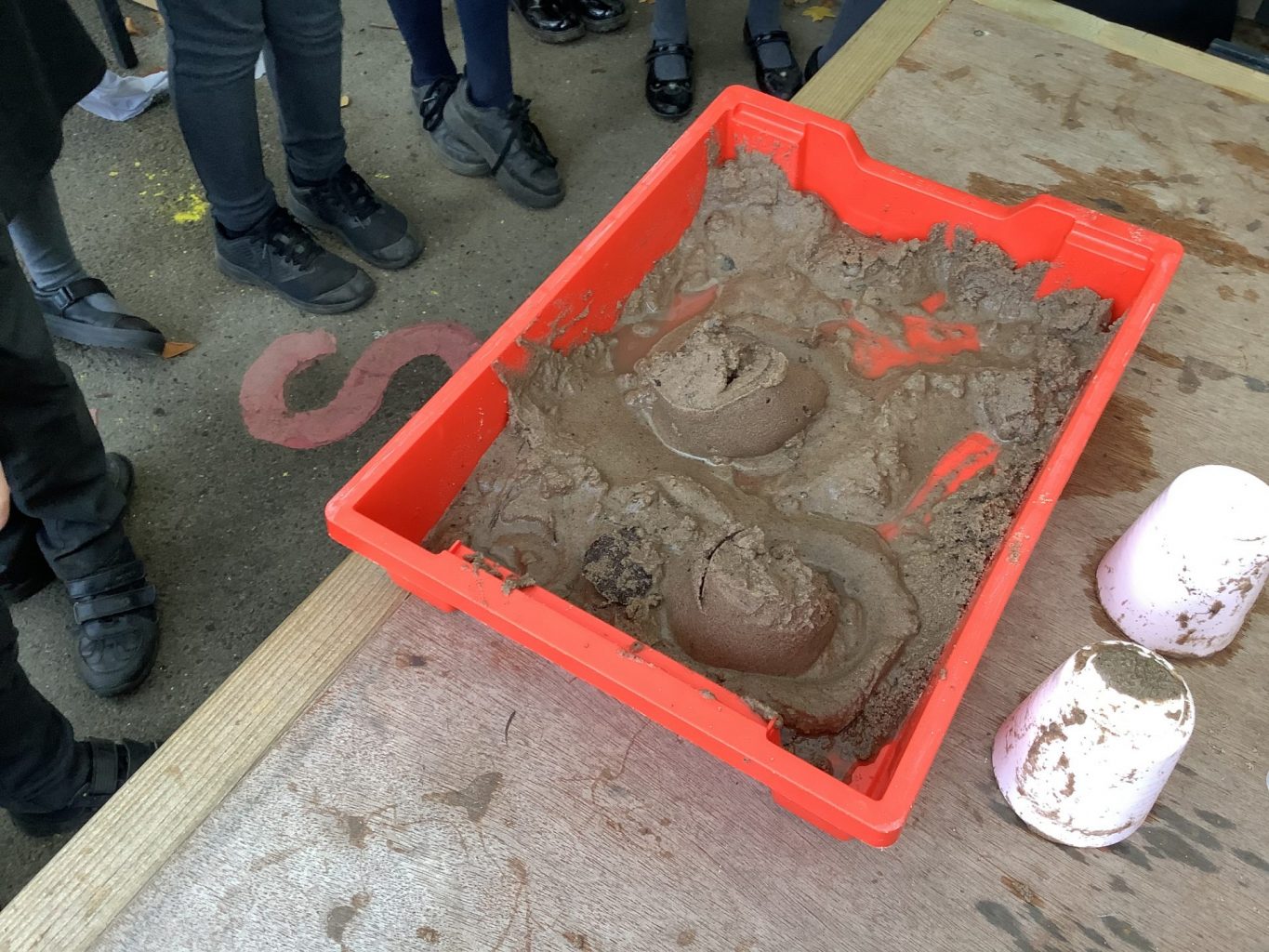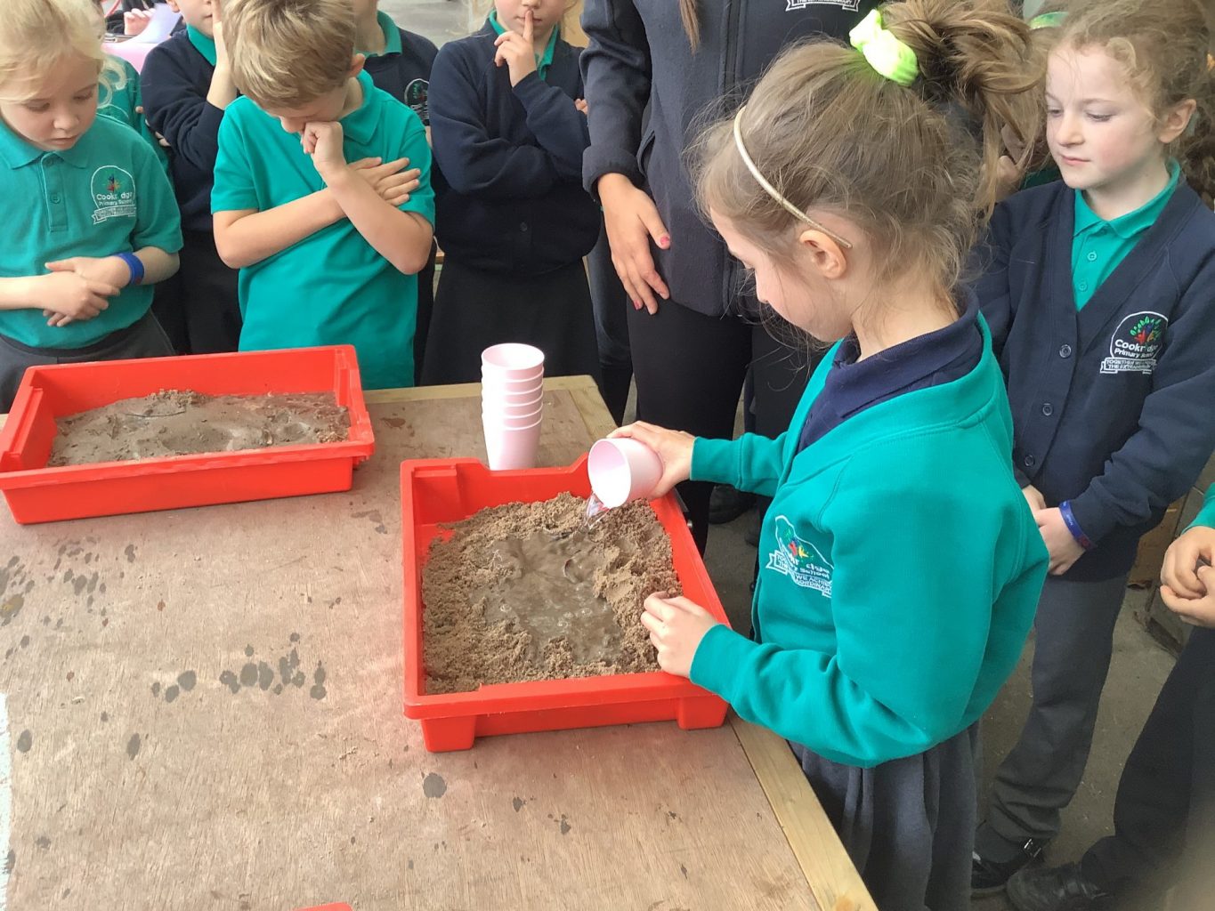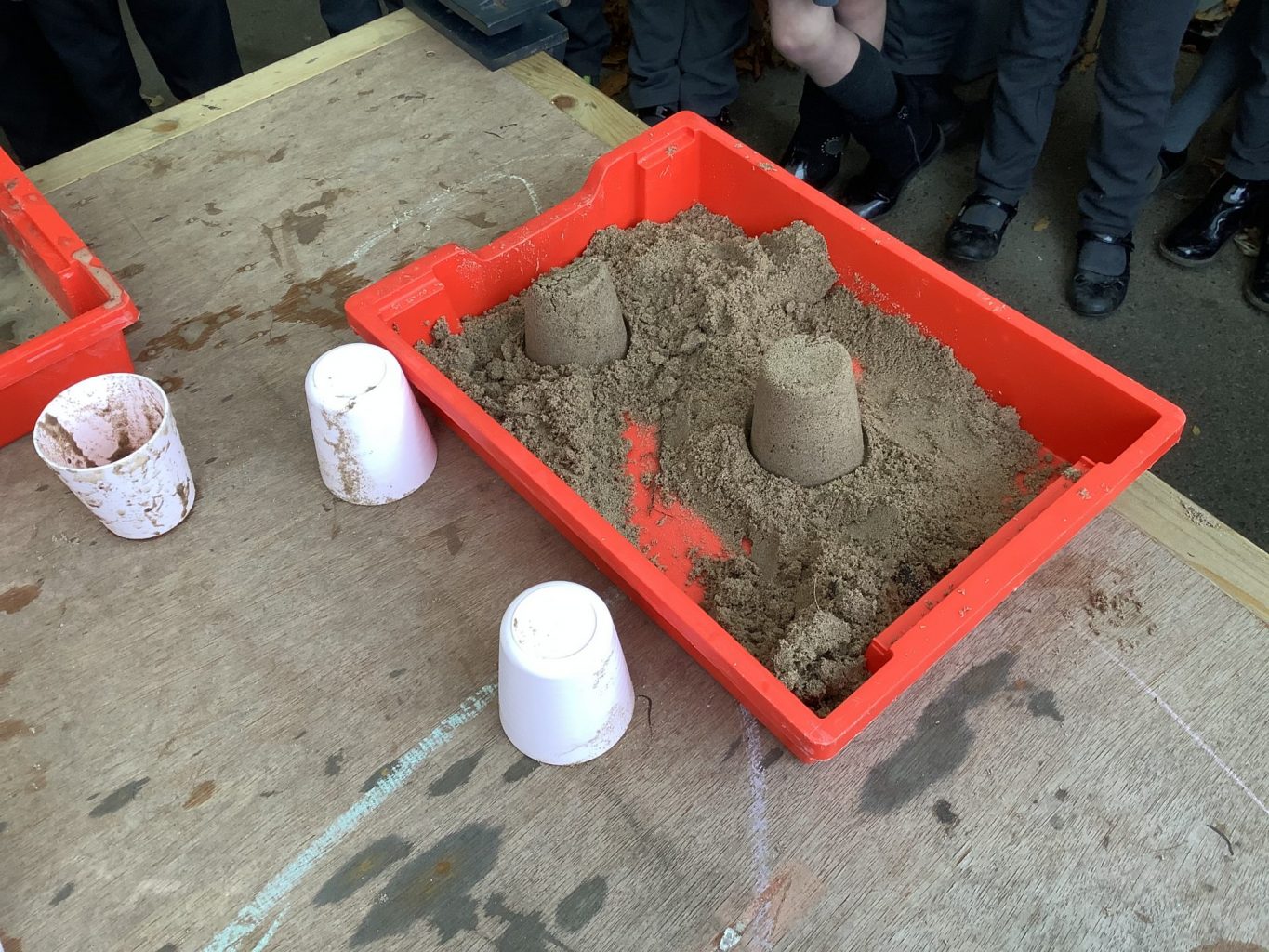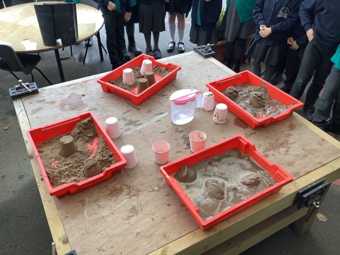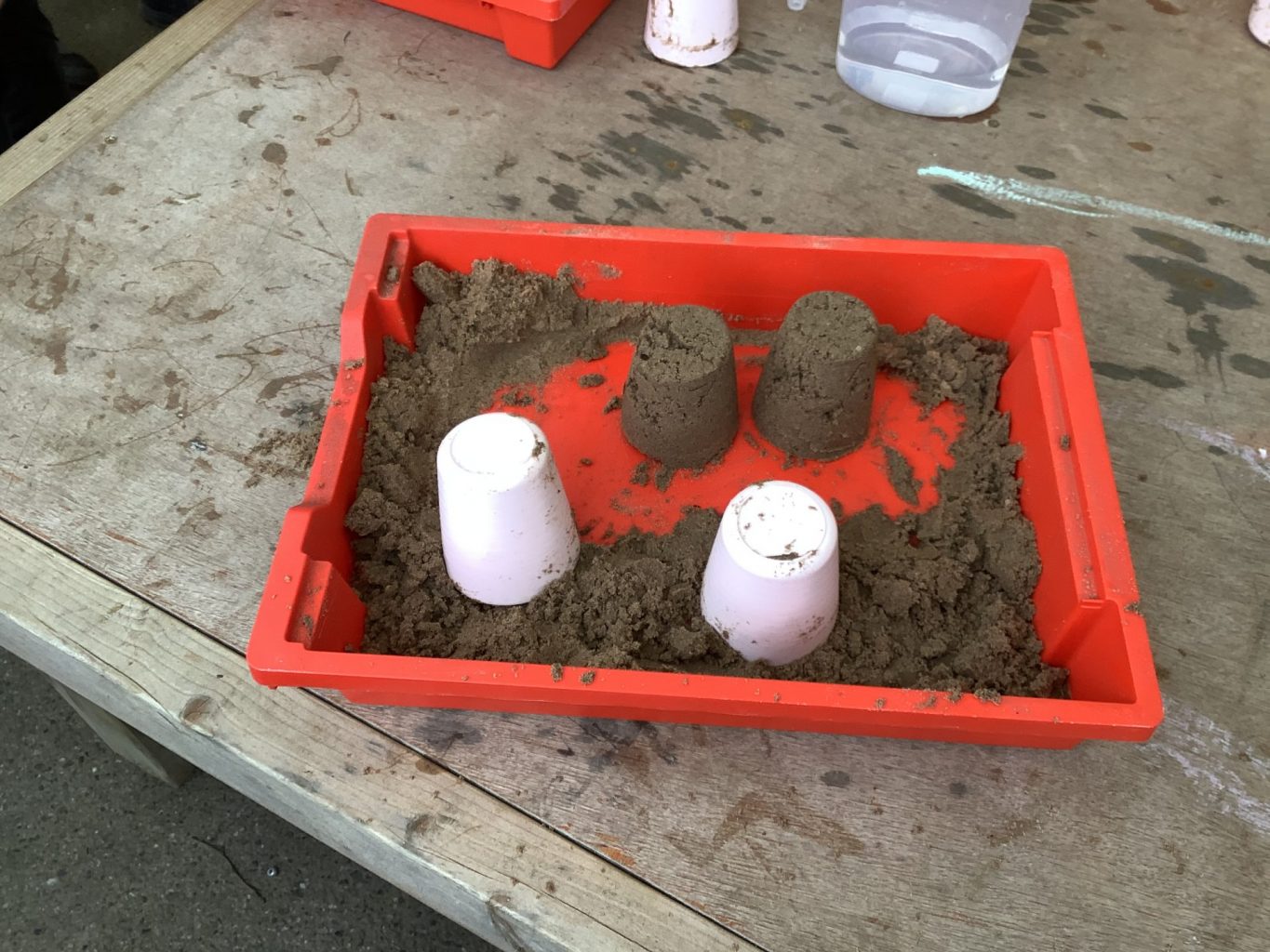 In Science, we have been performing simple experiments. We were investigating which mixture of water and sand would make the best sandcastle. We thought about how to make it a fair test and measured the amount of water we put into each portion of sand.