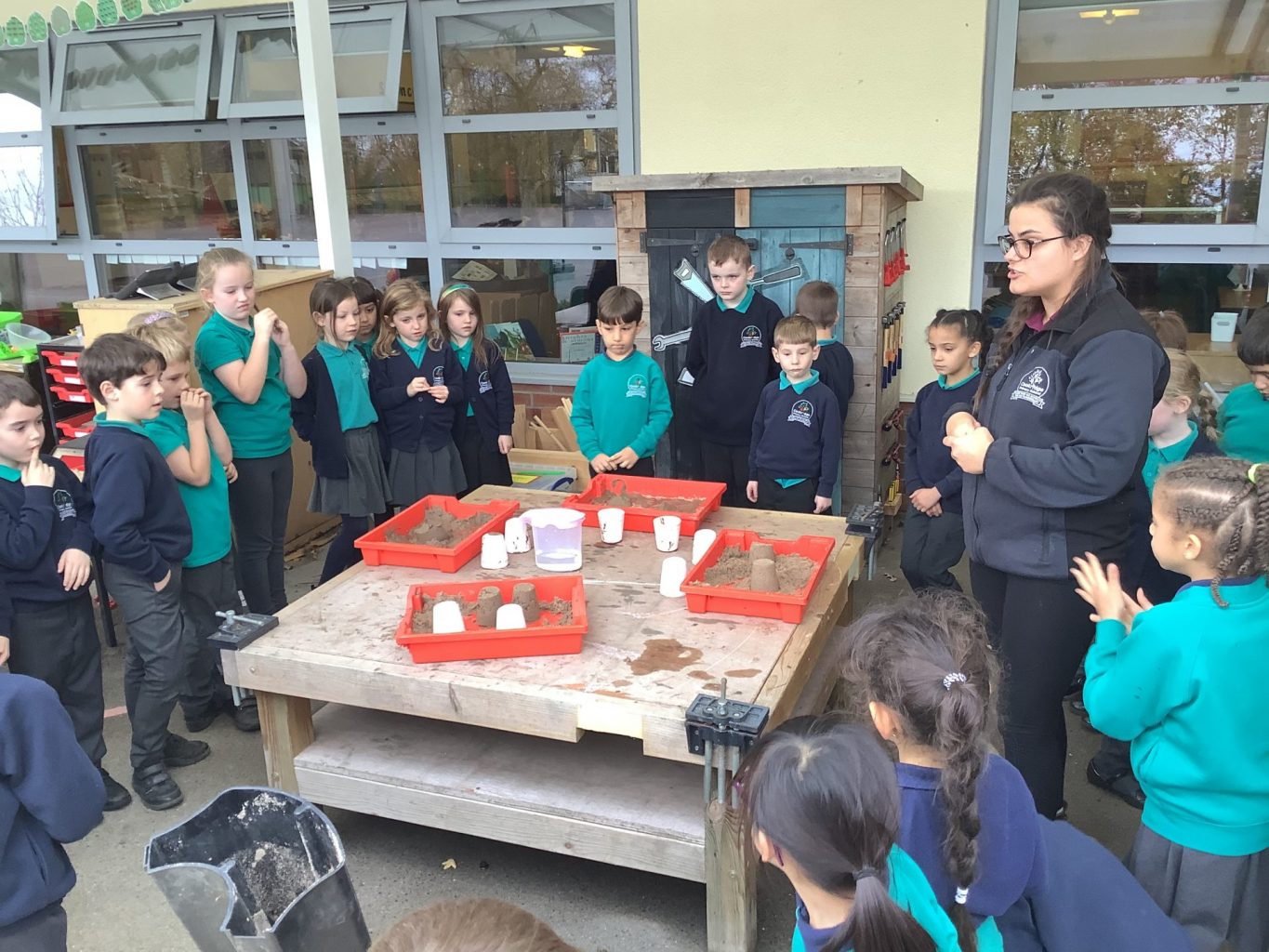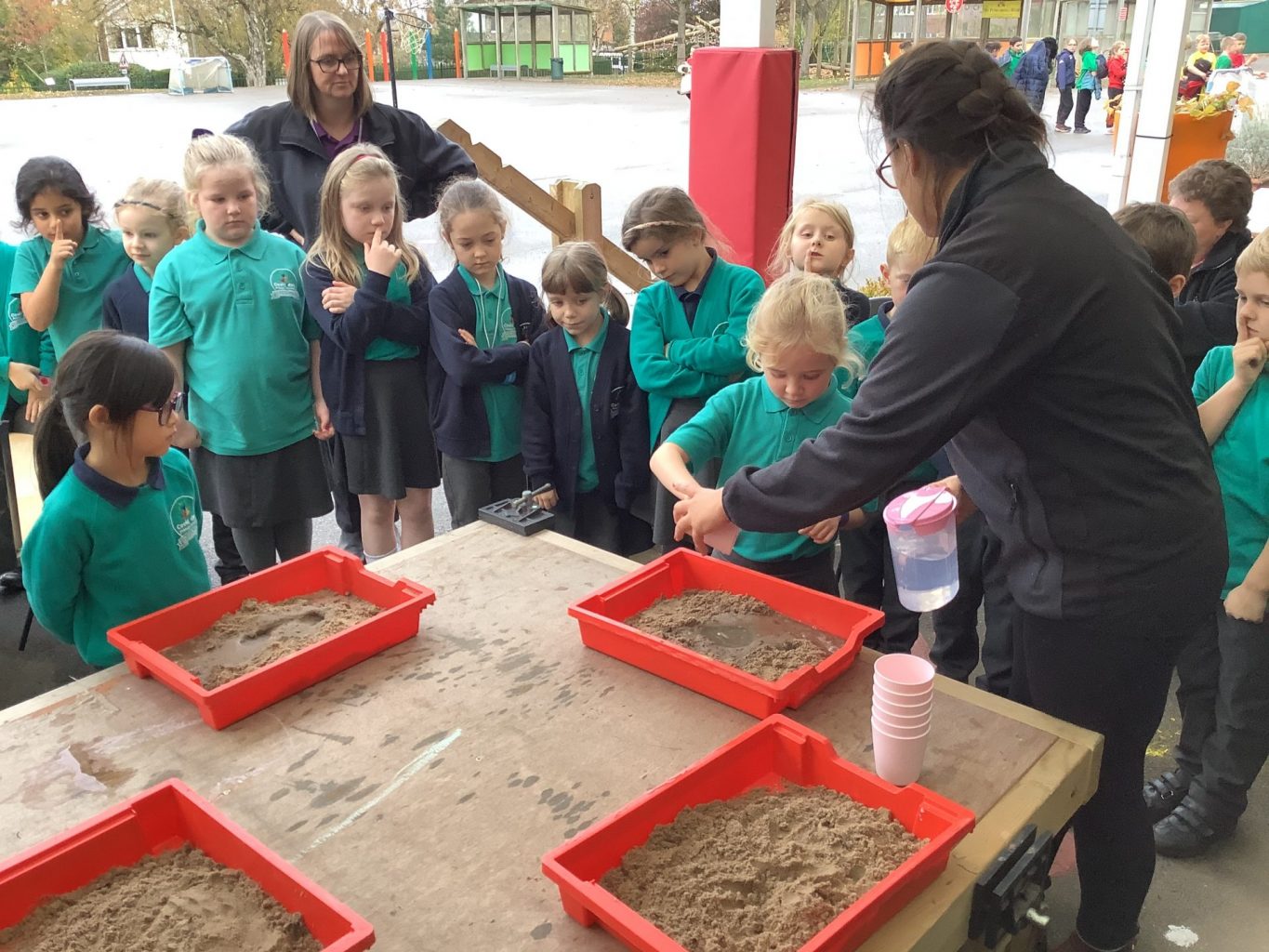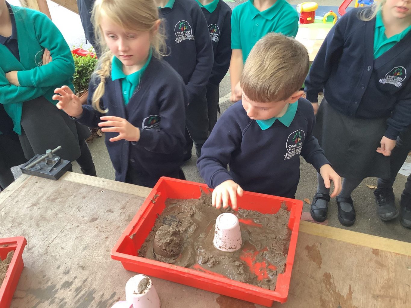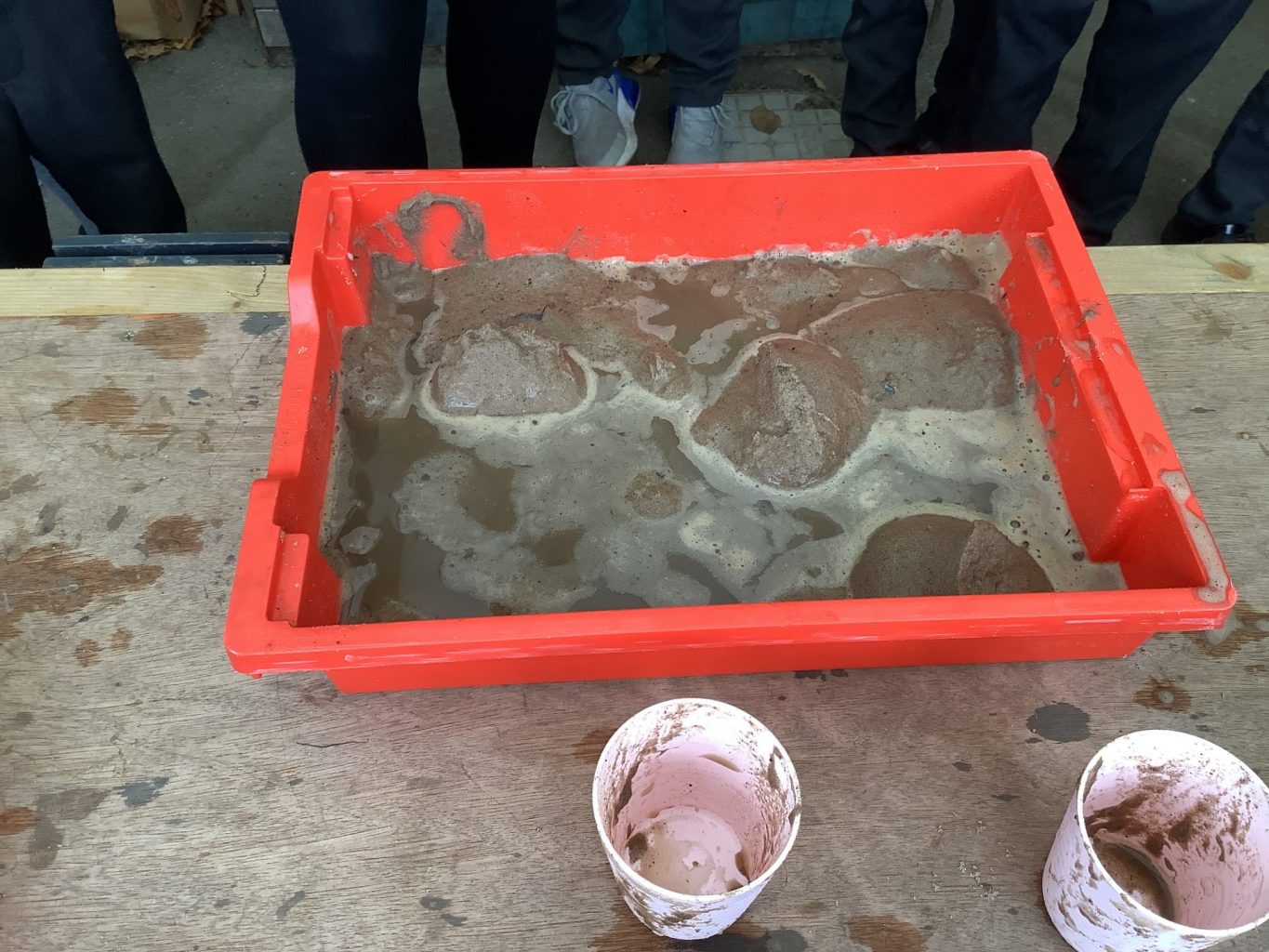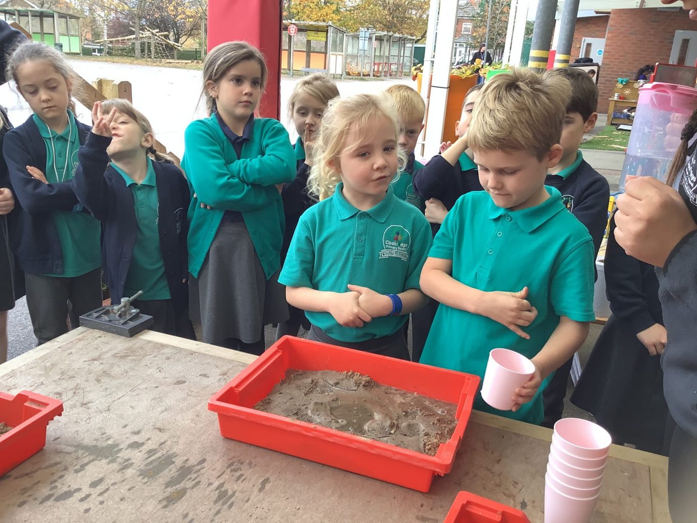 In Science, we have been performing simple experiments. We were investigating which mixture of water and sand would make the best sandcastle. We thought about how to make it a fair test and measured the amount of water we put into each portion of sand.