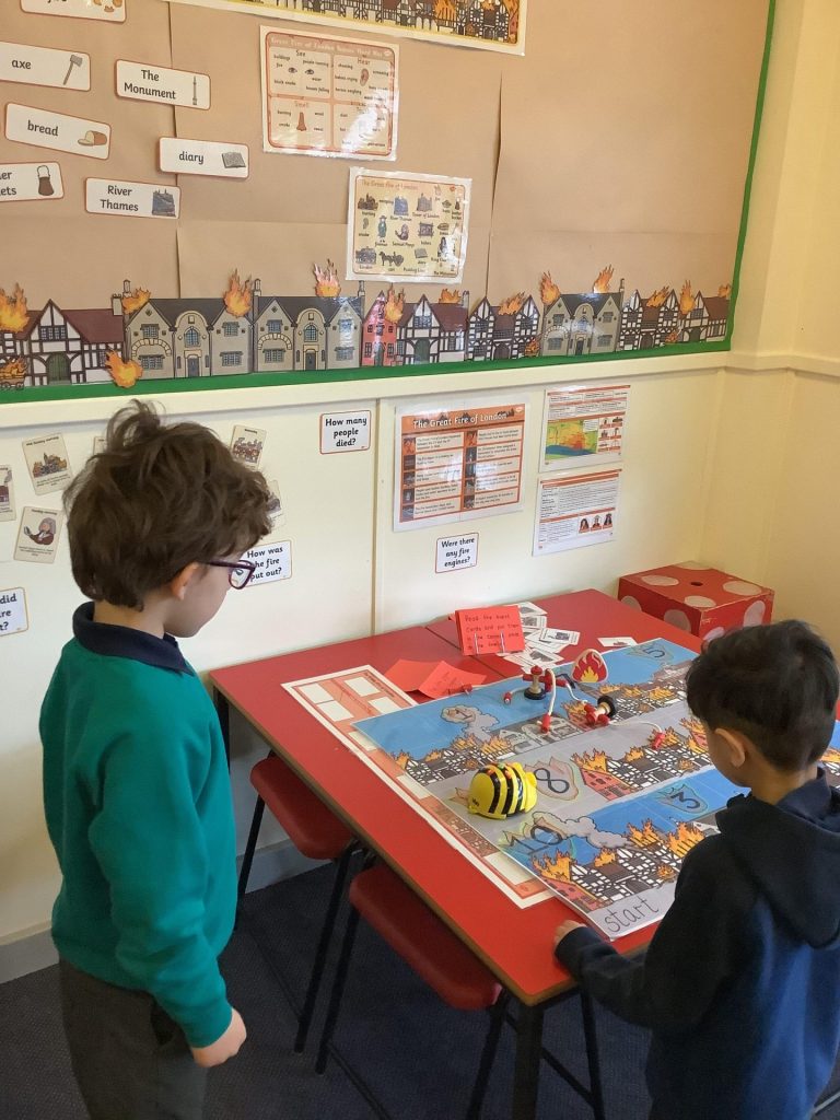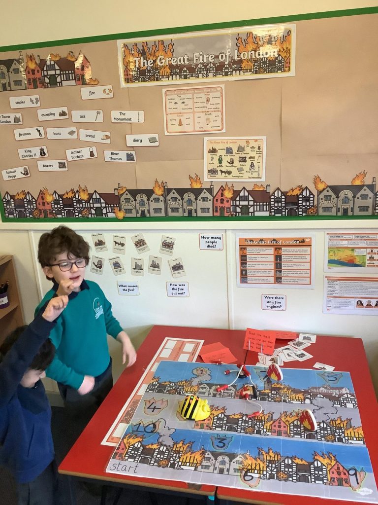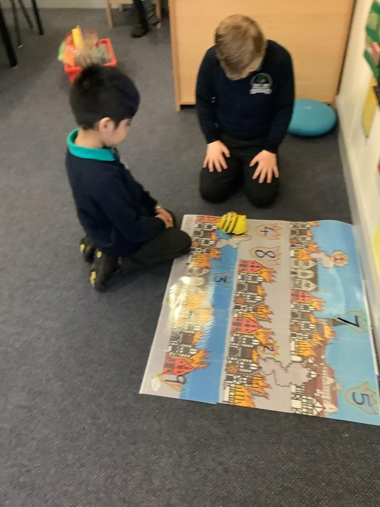 In Computing, the children have been using Beebots. They were learning/ practising the basic skills of moving the Beebot forwards, backwards, left and right. They have learnt to always cancel a set of instructions before inputting a new set and being able to move the Beebot to a given place on the chart.