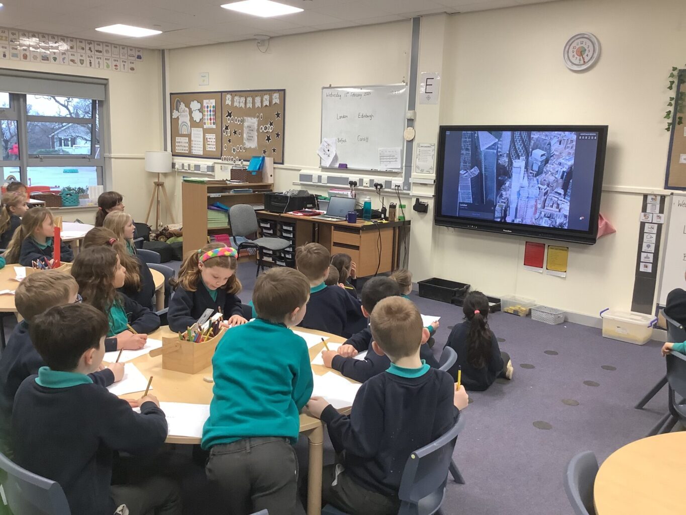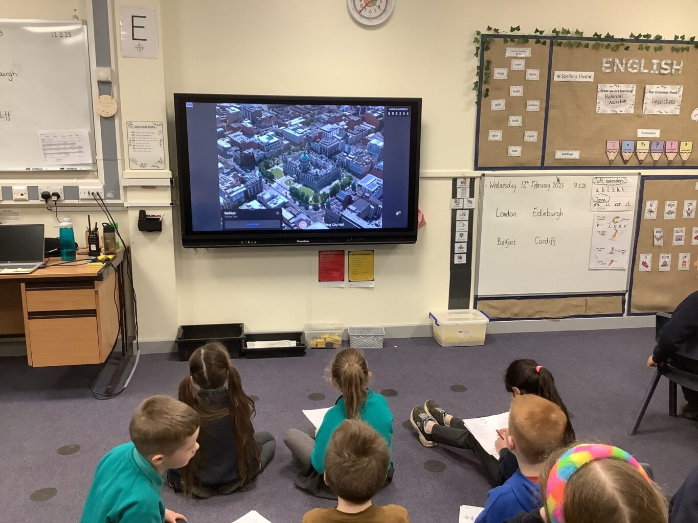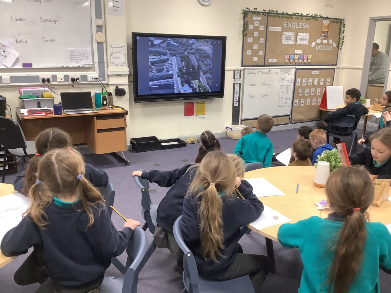 In Geography, the children were naming the capital cities in the UK. They then used the fly over tool, to watch footage of filming over the different cities. They spotted different buildings and styles of building that featured there eg. The Houses of Parliament in London and Edinburgh castle.