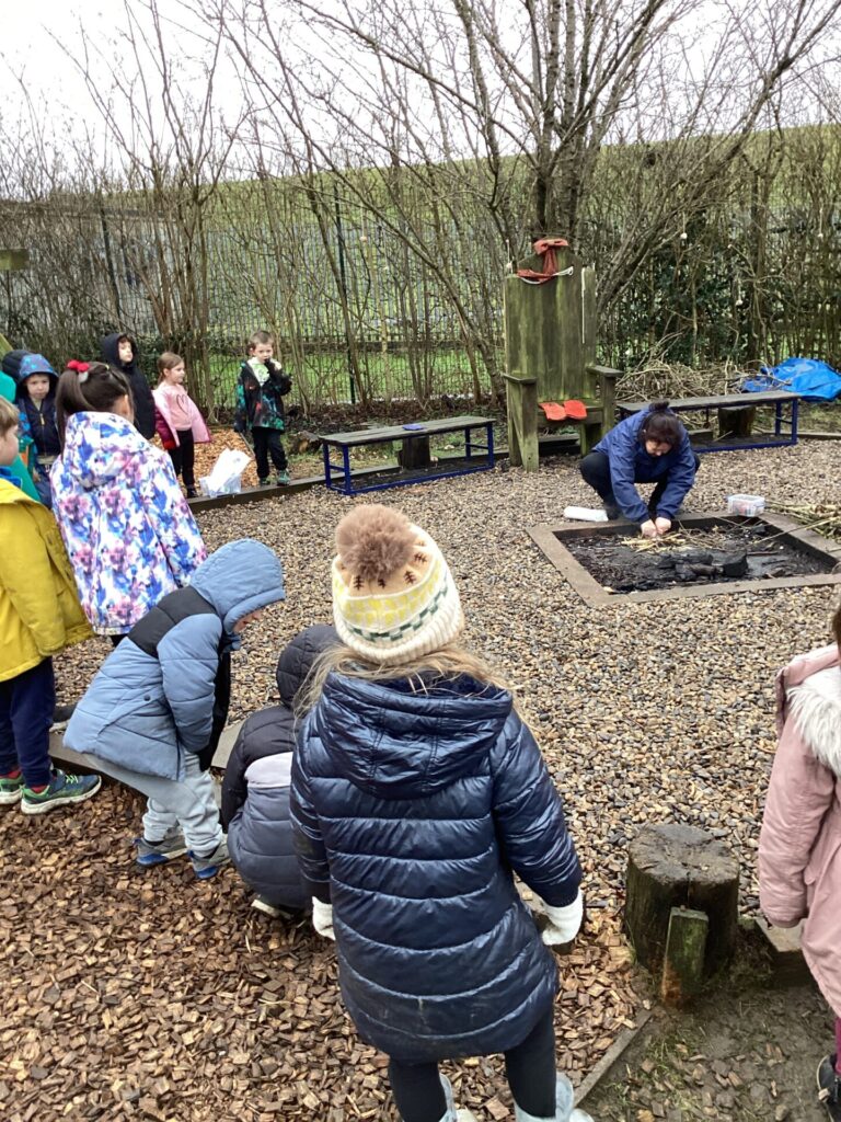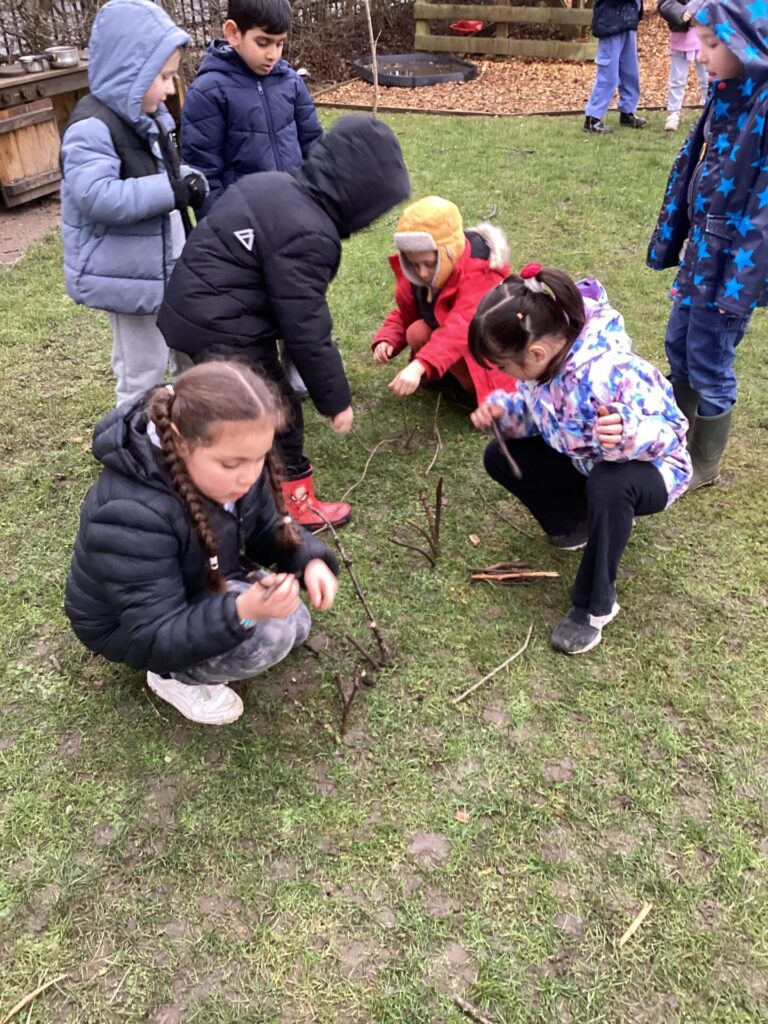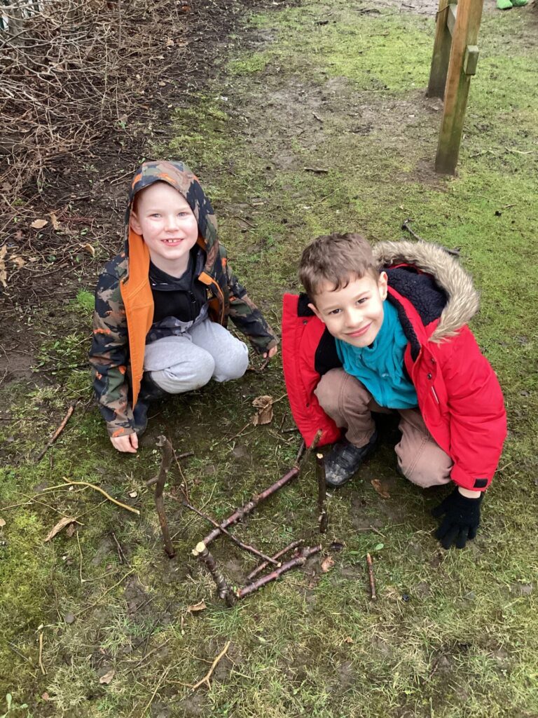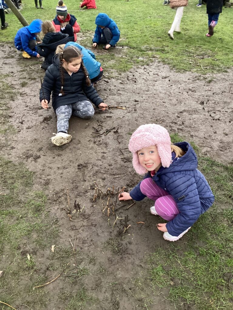 We continued thinking about the Great Fire of London during our forest school session. Mrs Koopman created a fire. We could see the difference in sticks that burnt quickly because they were dry and those that didn’t because they were damper. We used lots of little sticks to create our own houses as the streets of London and made sure we had built them right next to our friends because all the houses were built close together.