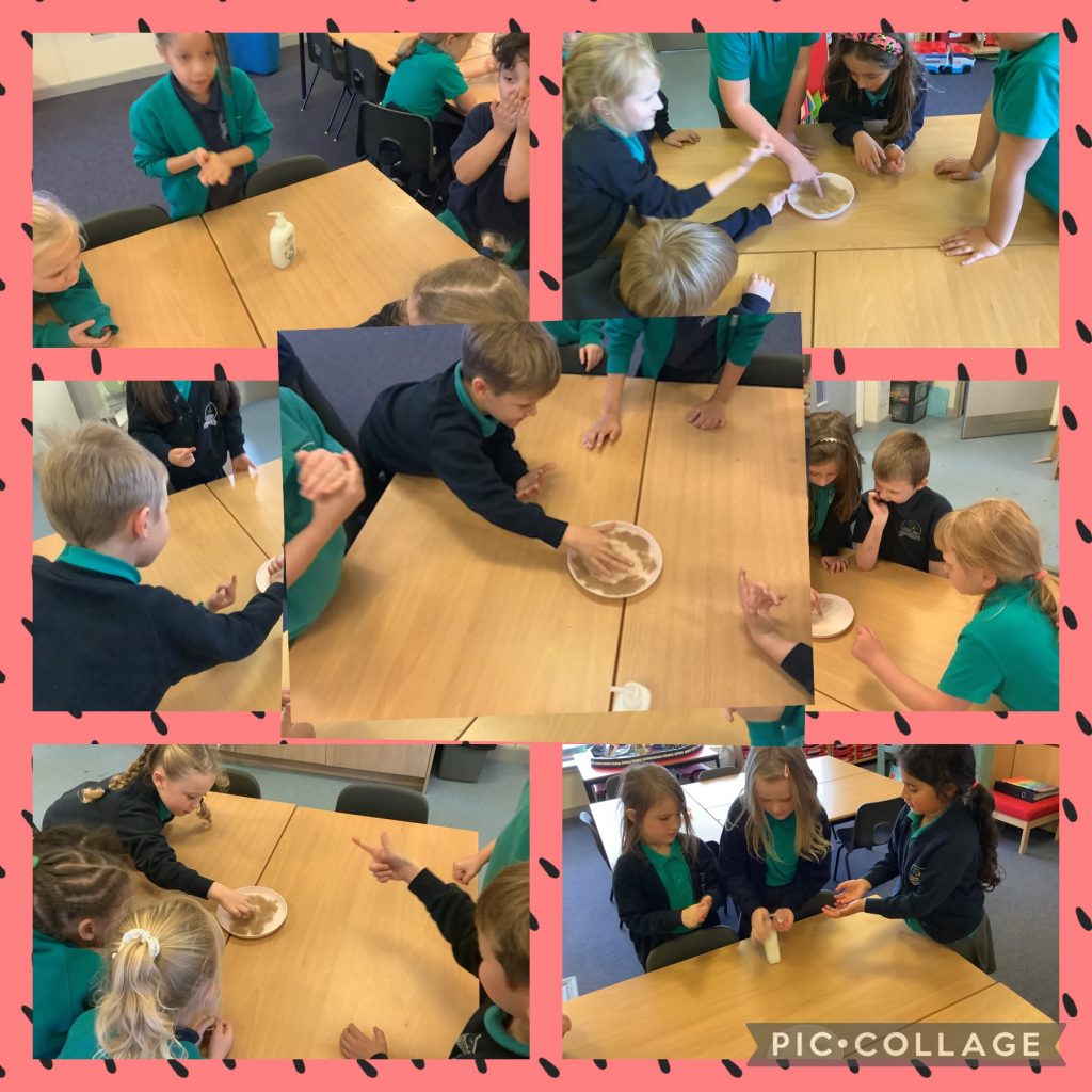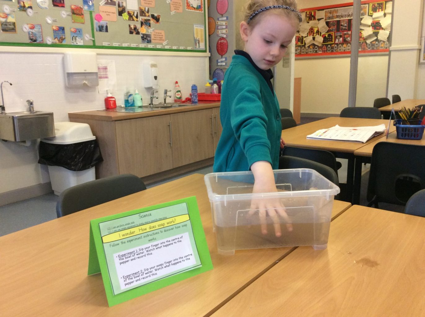 In Science this week, we linked with PHSE to think about how soap works and why it is important. We did a simple experiment where we put water into a bowl and sprinkled pepper on the top. We thought about what would happen if we put our finger into the water. When we did it, we realised the pepper stuck to our finger. We then repeated the experiment, but put liquid soap onto our finger first. Again, we predicted what would happen. This time the pepper all moved away from the soap on our finger. We talked about how this is like germs that can easily stick to the oils on our fingers, but when we use soap, we are able to wash the germs away effectively.