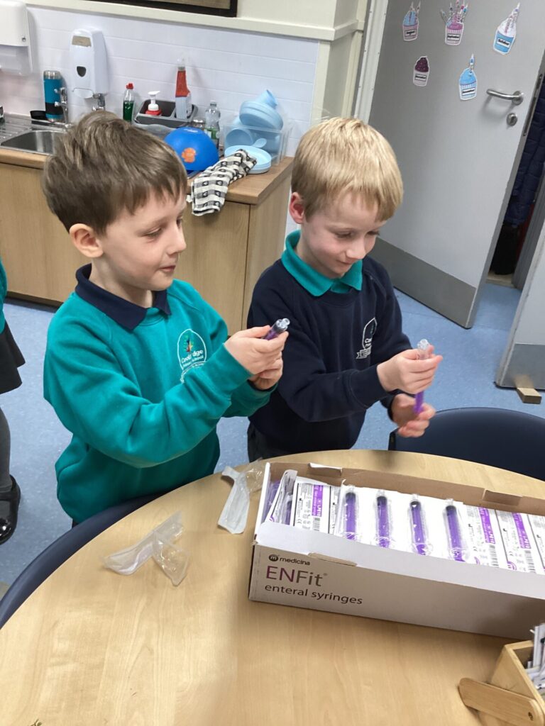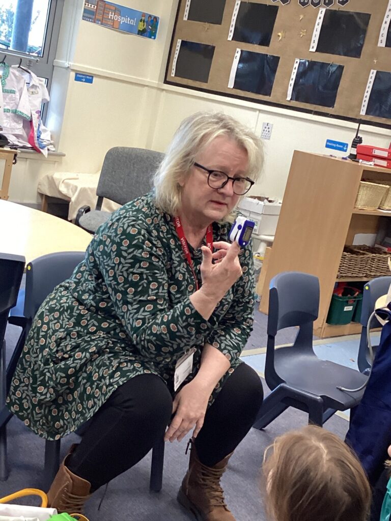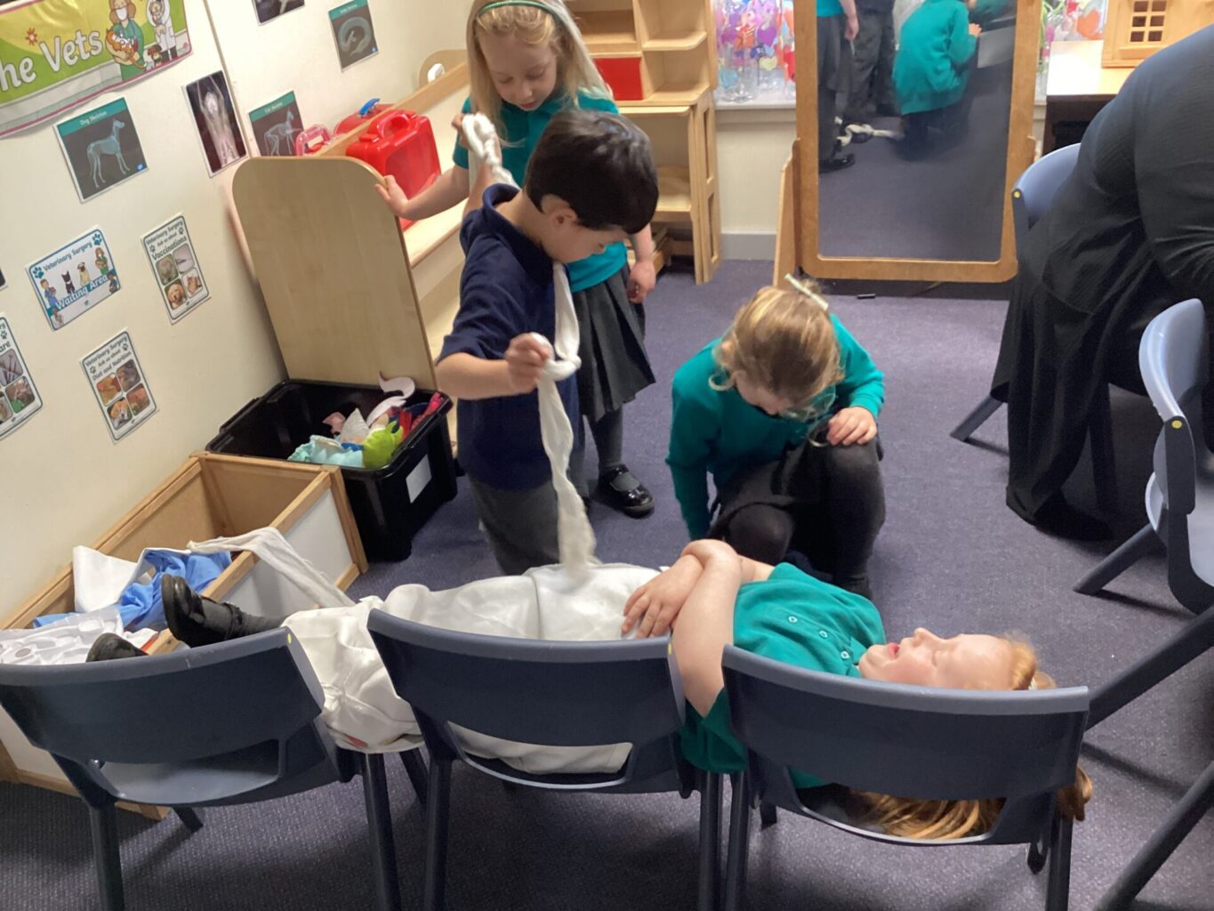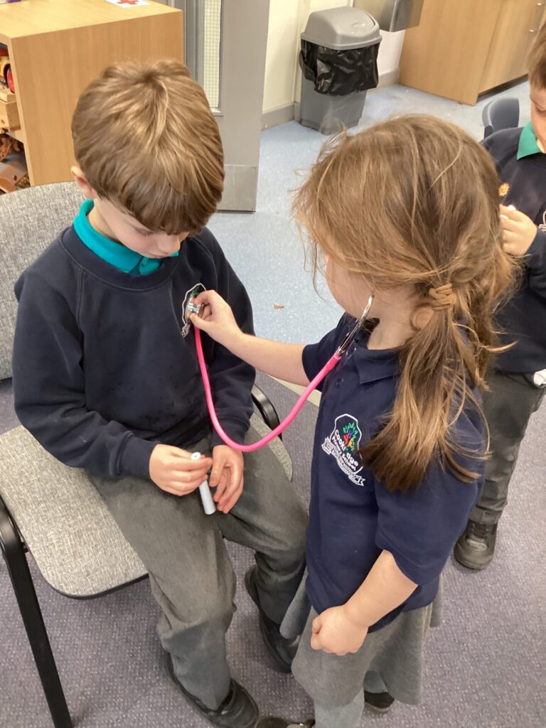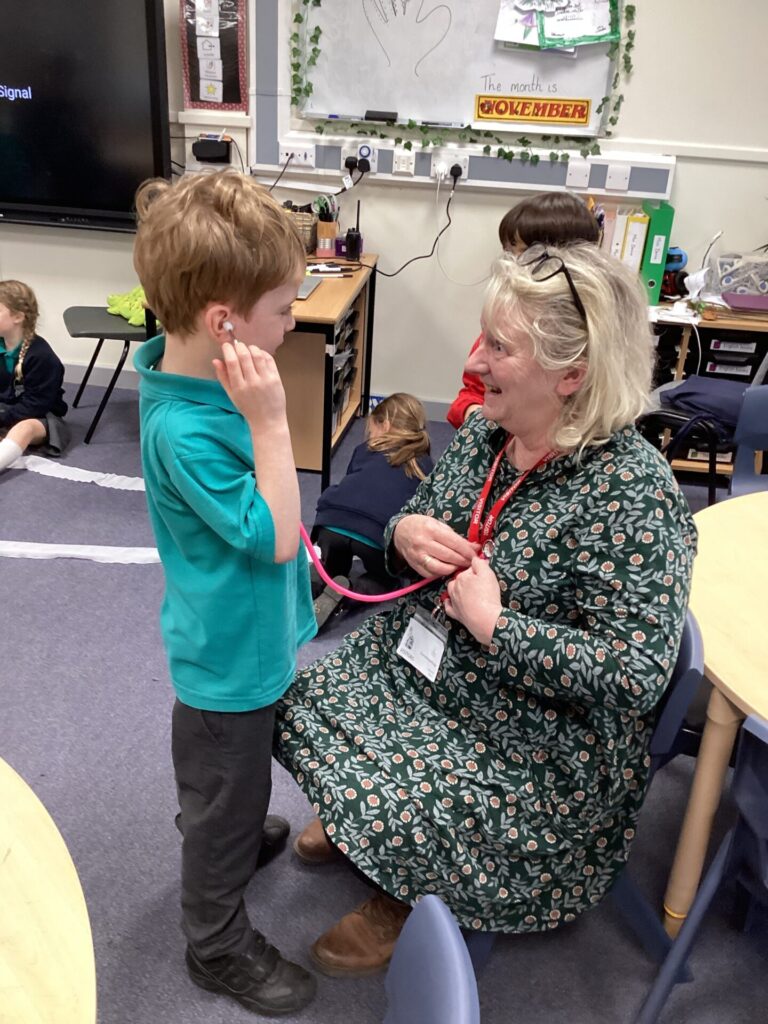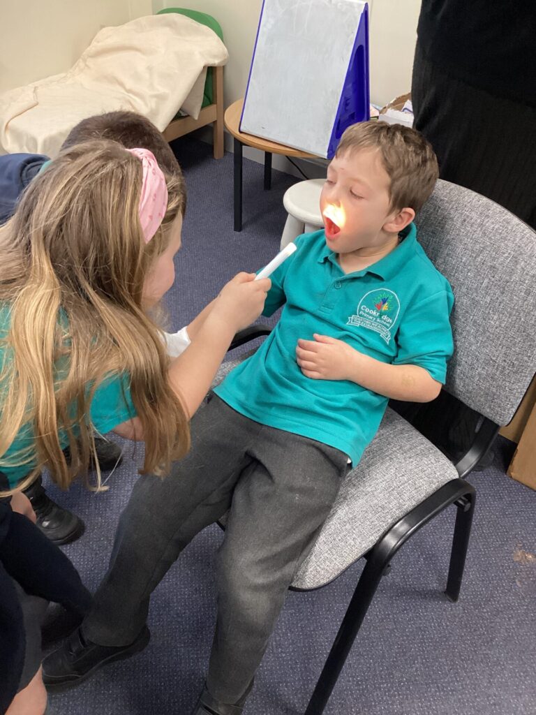 Class 2 were very lucky to have a visit from Iris’s Nanny who is a nurse. She showed them all kinds of equipment she uses when she’s nursing from thermometers and blood pressure monitors to torches and stethoscopes. She even brought in bandages and syringes (no needles!) for them to unwrap and use, explaining the importance of things being clean and used only once.