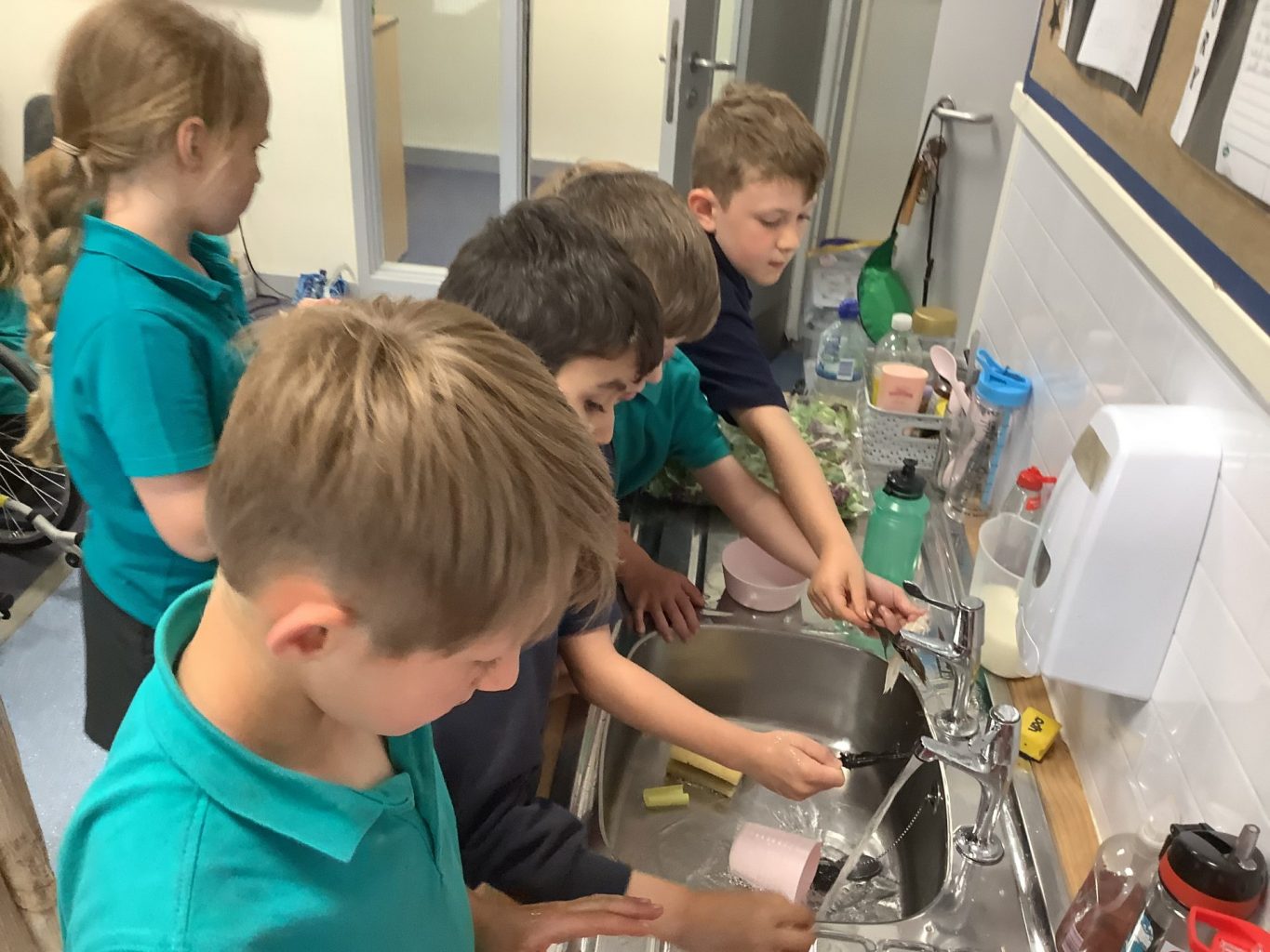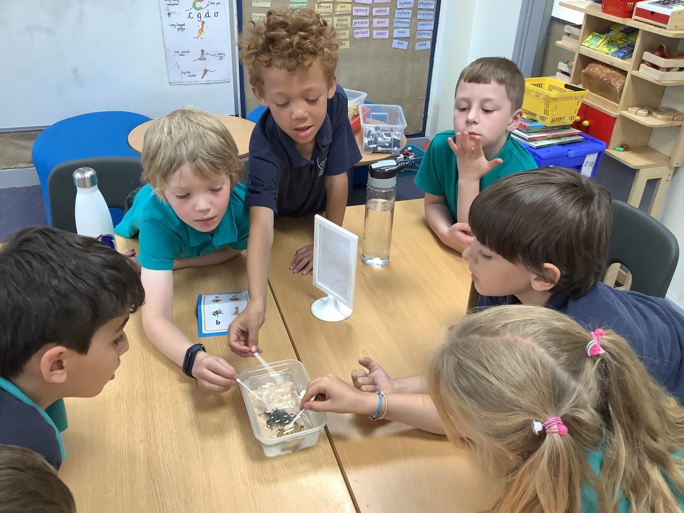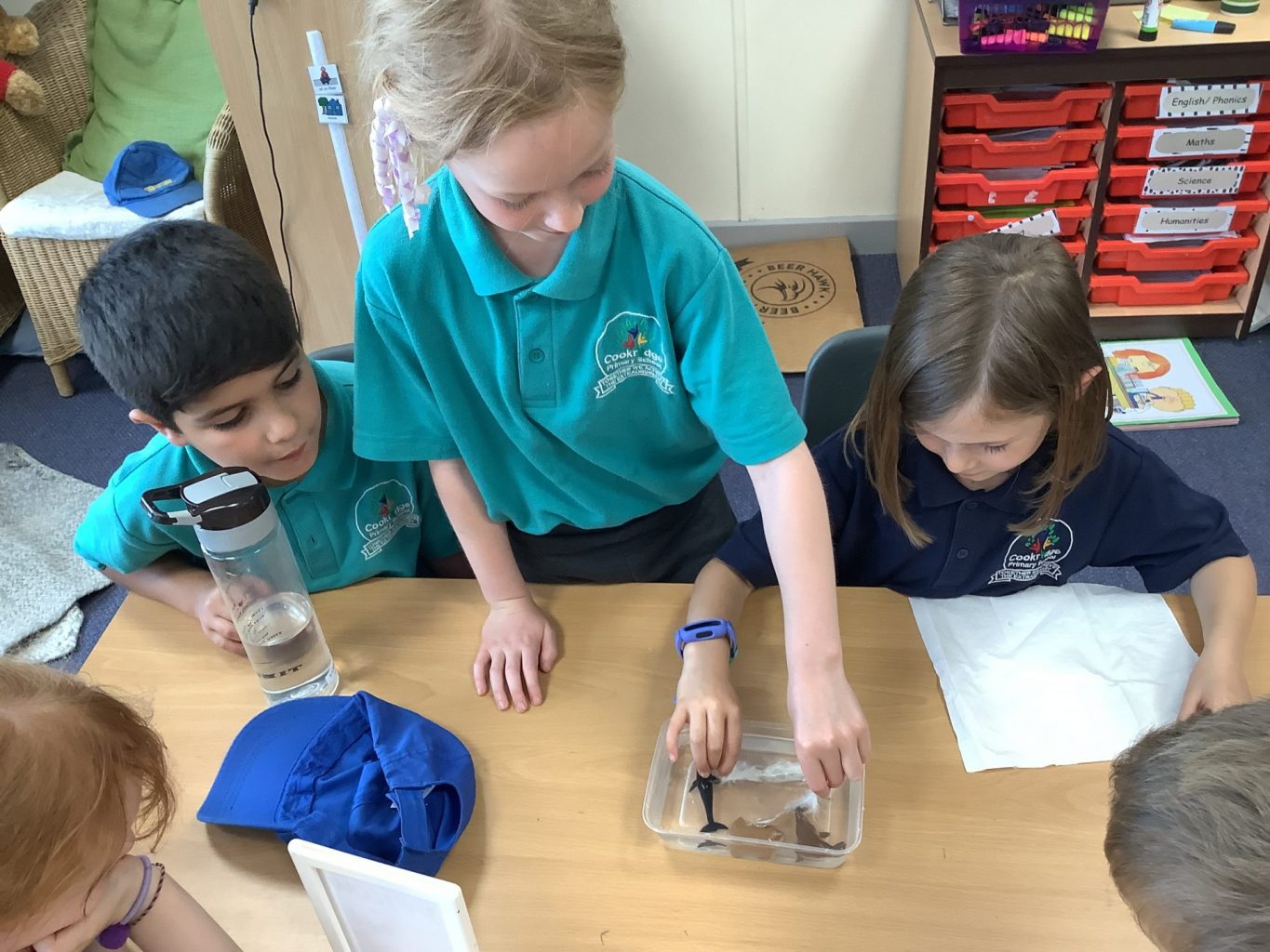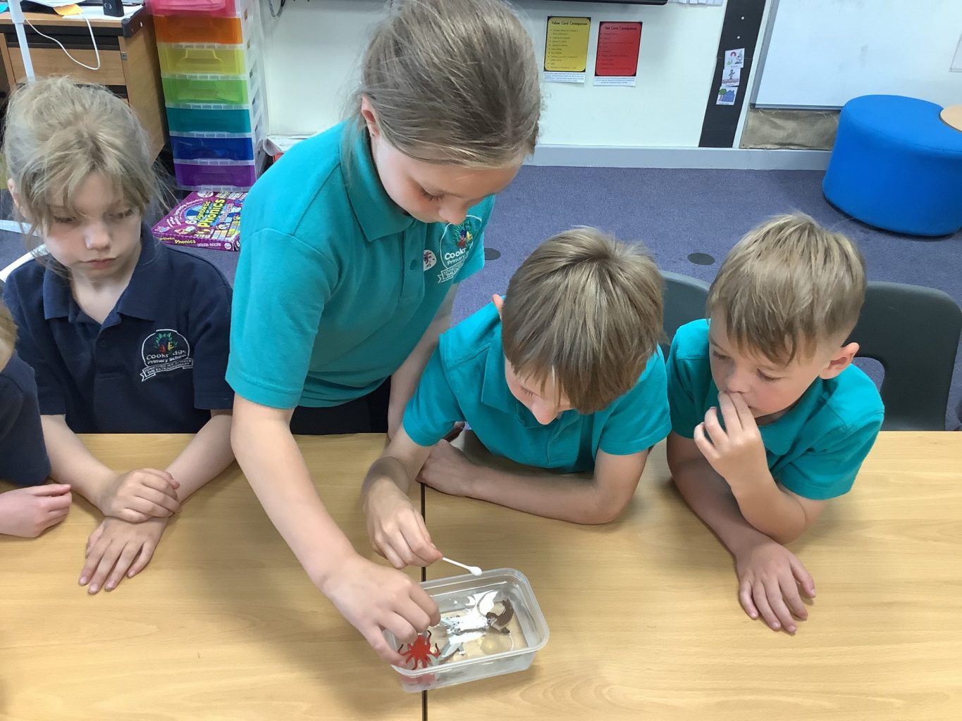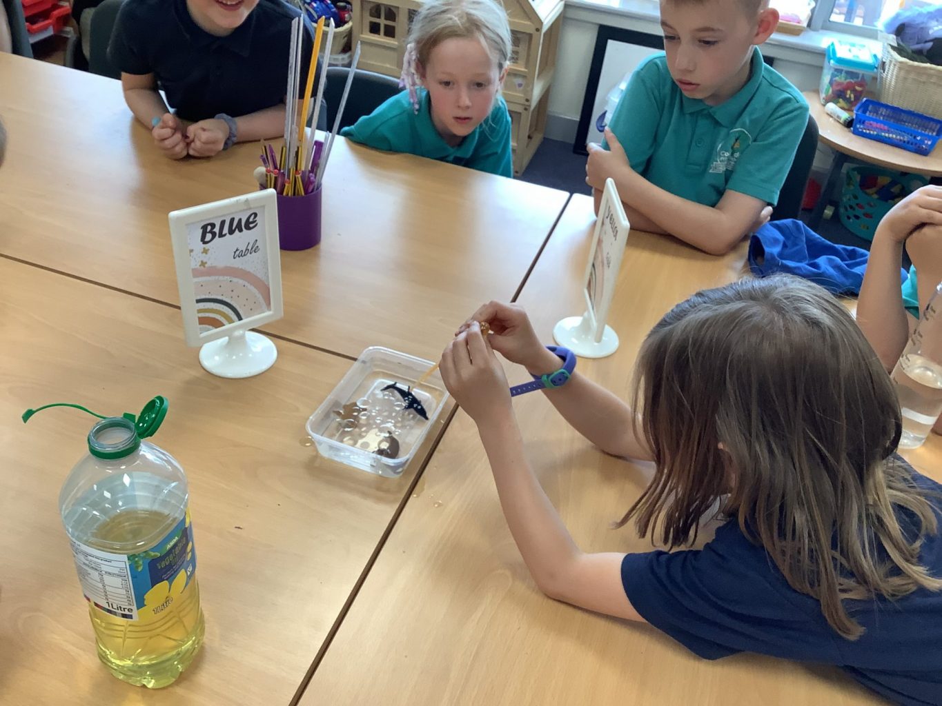 We completed a very interesting investigation in Science this week as part of ‘The Great Science share’. We looked at climate change and how humans are affecting the environment. We had bowls of water with sea creatures in. We then added oil to the water and noticed how it sits on the top. We then used things like cotton buds and large cotton pads to try and clean up the oil. We then put feathers into the water and watched what happened to them and discussed how this would affect a birds flight and ultimately what would happen to the bird.