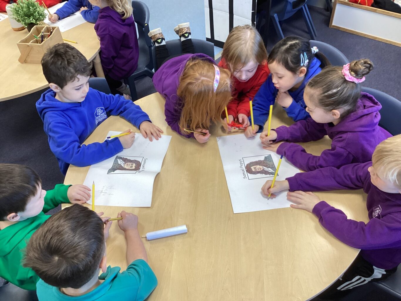 Samuel Pepys’ diary has been our focus in English this week. Year One listened to a simple extract and put pictures in order before writing sentences attached to them. Year Two were focusing on past and present tenses and changing words from the present tense into past tense. We all watched some videos about Samuel Pepys story and wrote facts about him that we could remember. We also wrote a descriptive piece as though we were Samuel Pepys looking out of the window and watching the fire. Year One’s phonic focus for this week has been /ew/ for stew. Year Two’s phonic focus this week has been /ure/ for future.