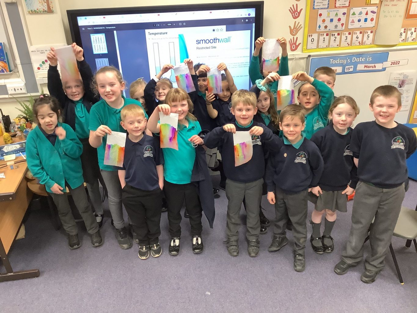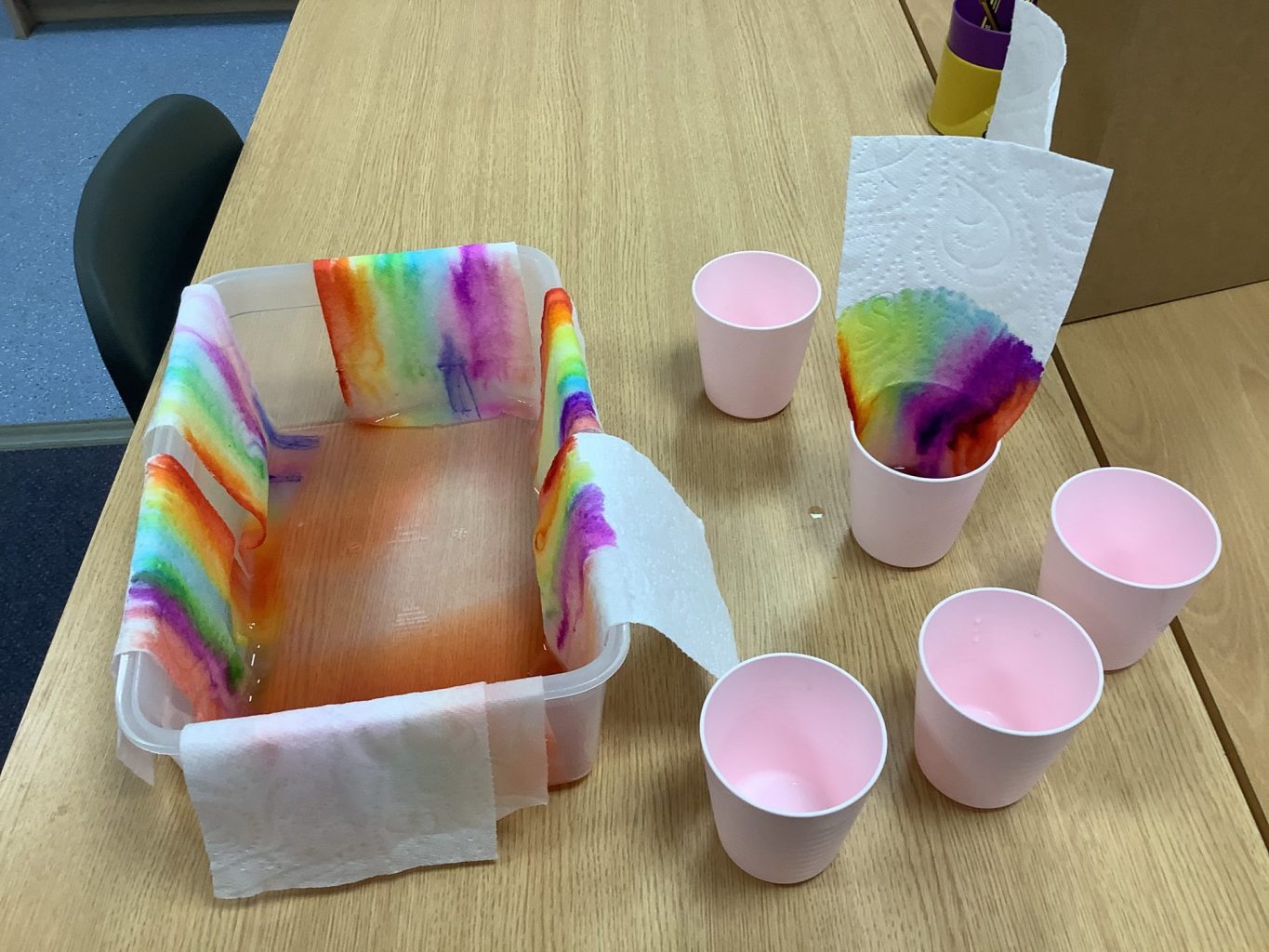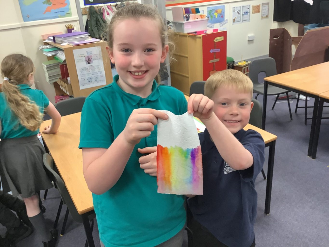 This week has been National Science week. The theme this year was on ‘Growth’. In Key Stage one, we did an experiment to look at how a rainbow could grow! We used Felt tips to colour each of the colours of the rainbow onto the bottom of a piece of paper towel. We then put this into water and watched how the colours spread up and across the paper towel. We also continued with our Science topic on materials. We looked at how we could change the shape of different objects and materials, but twisting, bending, squashing and stretching them. Mr Milson also wrote a phonics song, and played it on his guitar, to help the children to understand growth.