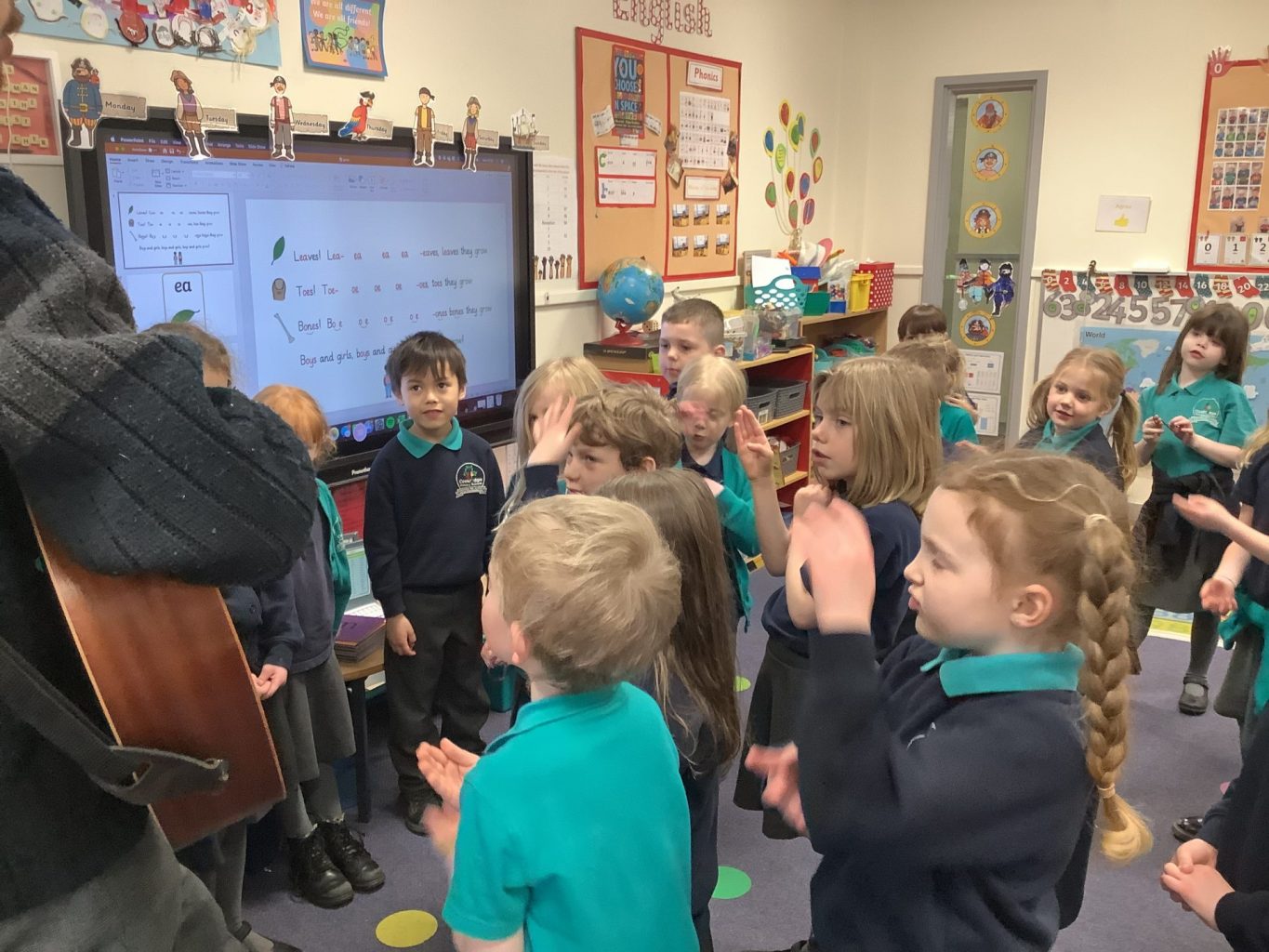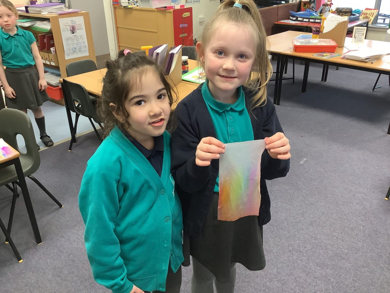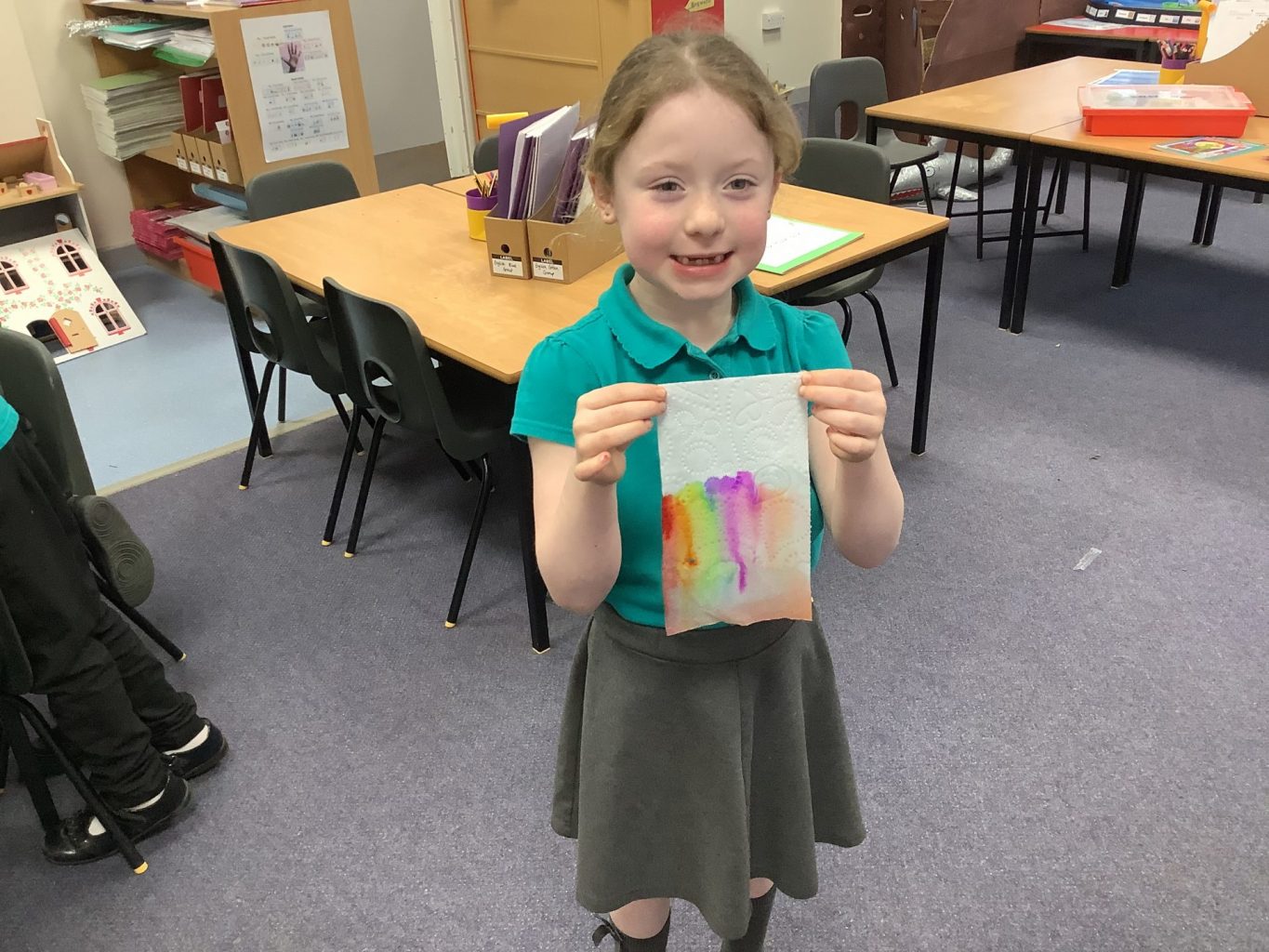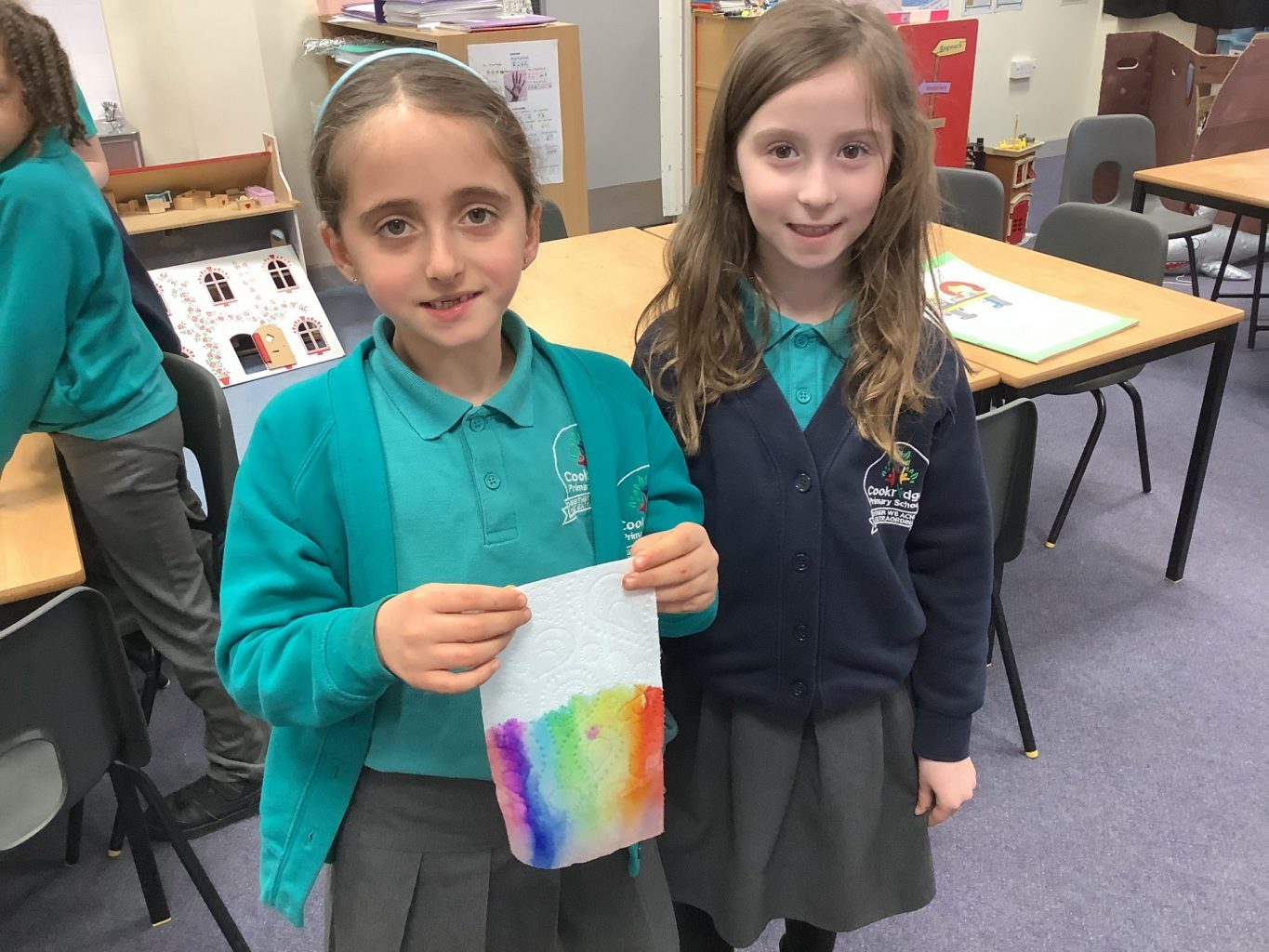 This week has been National Science week. The theme this year was on ‘Growth’. In Key Stage one, we did an experiment to look at how a rainbow could grow! We used Felt tips to colour each of the colours of the rainbow onto the bottom of a piece of paper towel. We then put this into water and watched how the colours spread up and across the paper towel. We also continued with our Science topic on materials. We looked at how we could change the shape of different objects and materials, but twisting, bending, squashing and stretching them. Mr Milson also wrote a phonics song, and played it on his guitar, to help the children to understand growth.