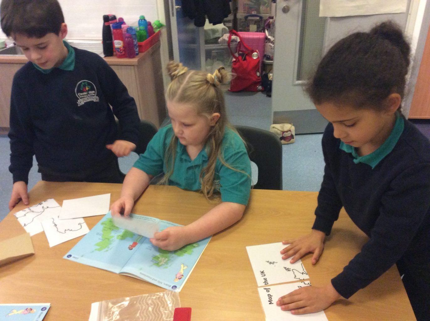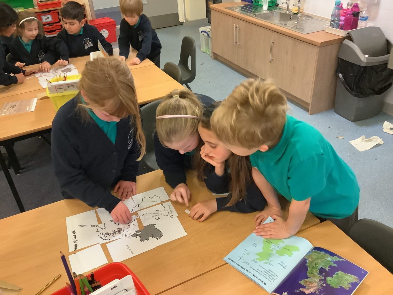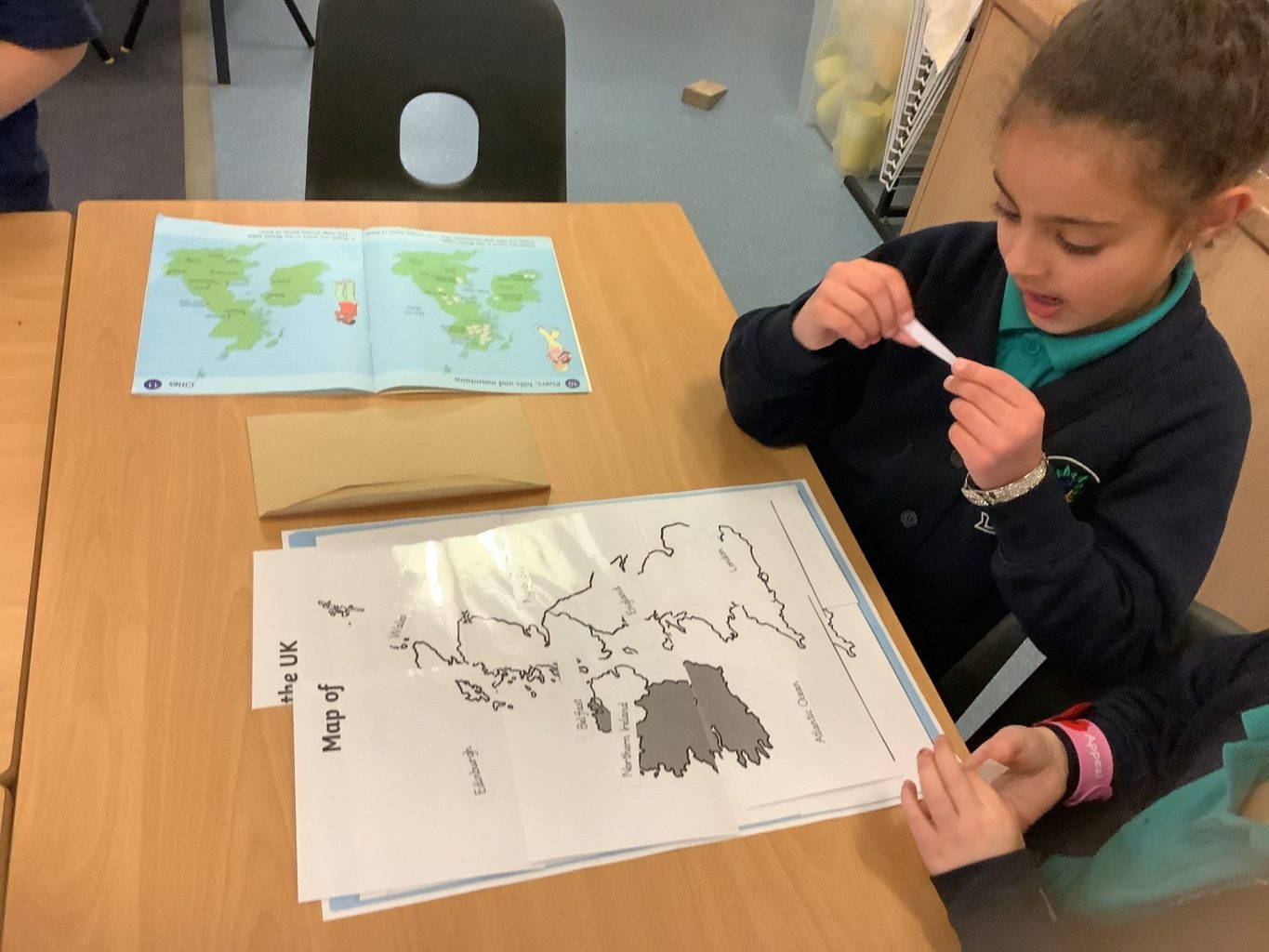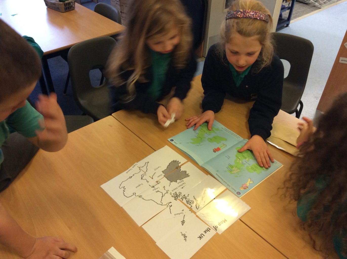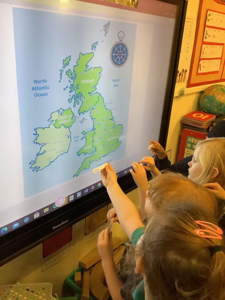 In Geography, we have introduced the use of Atlases. We are building on our knowledge of the four countries that make up the United Kingdom, their capital cities and naming the waters around the UK. This week, we put together a map of the UK in a jigsaw style. We then used the Atlases to label the Countries, Capital cities and seas on the map.