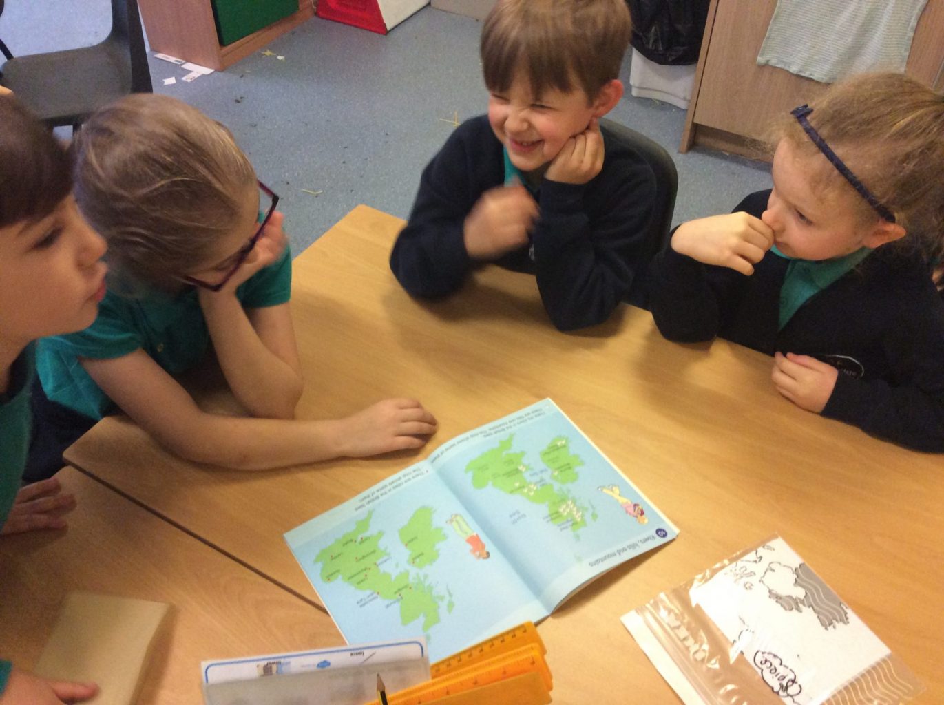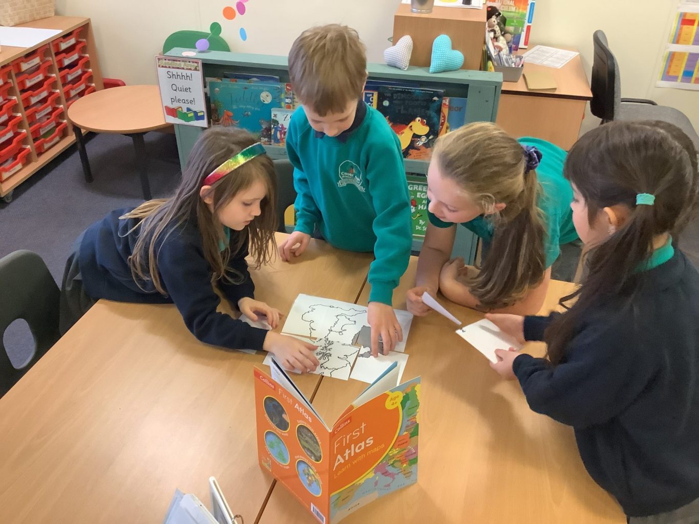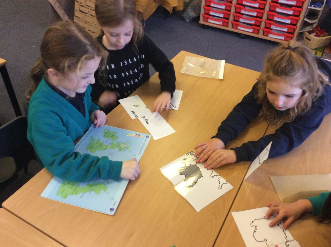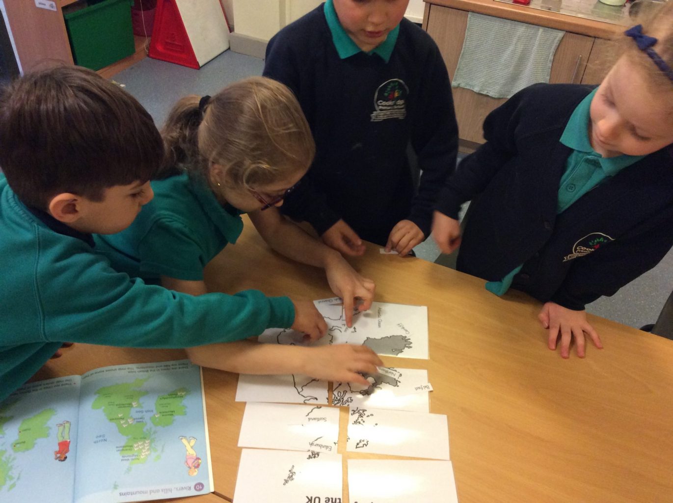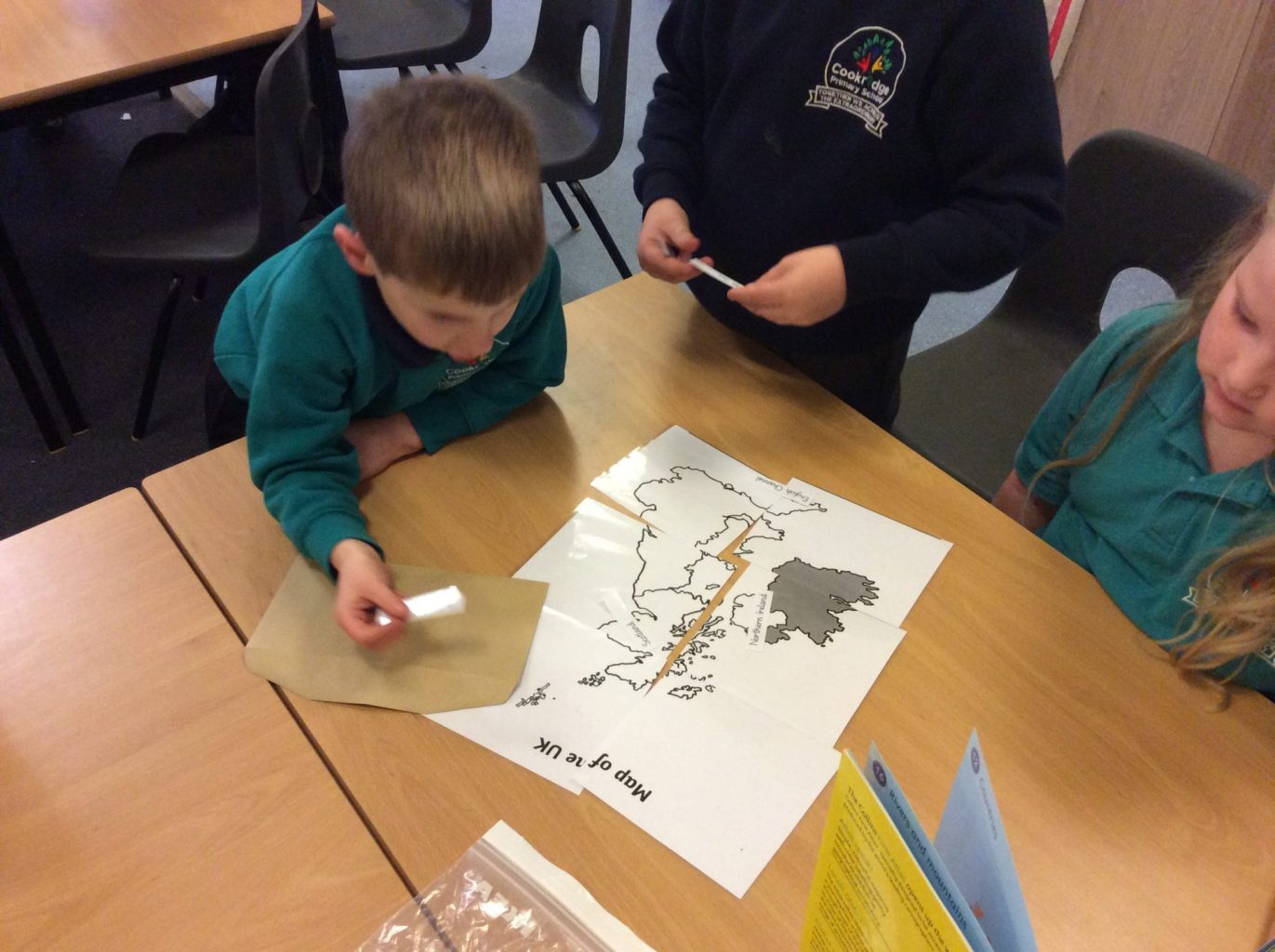 In Geography, we have introduced the use of Atlases. We are building on our knowledge of the four countries that make up the United Kingdom, their capital cities and naming the waters around the UK. This week, we put together a map of the UK in a jigsaw style. We then used the Atlases to label the Countries, Capital cities and seas on the map.