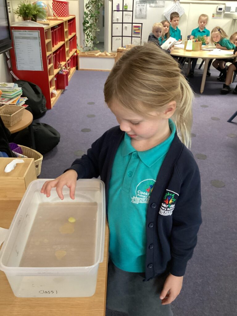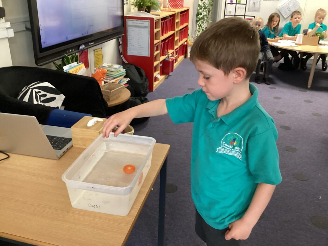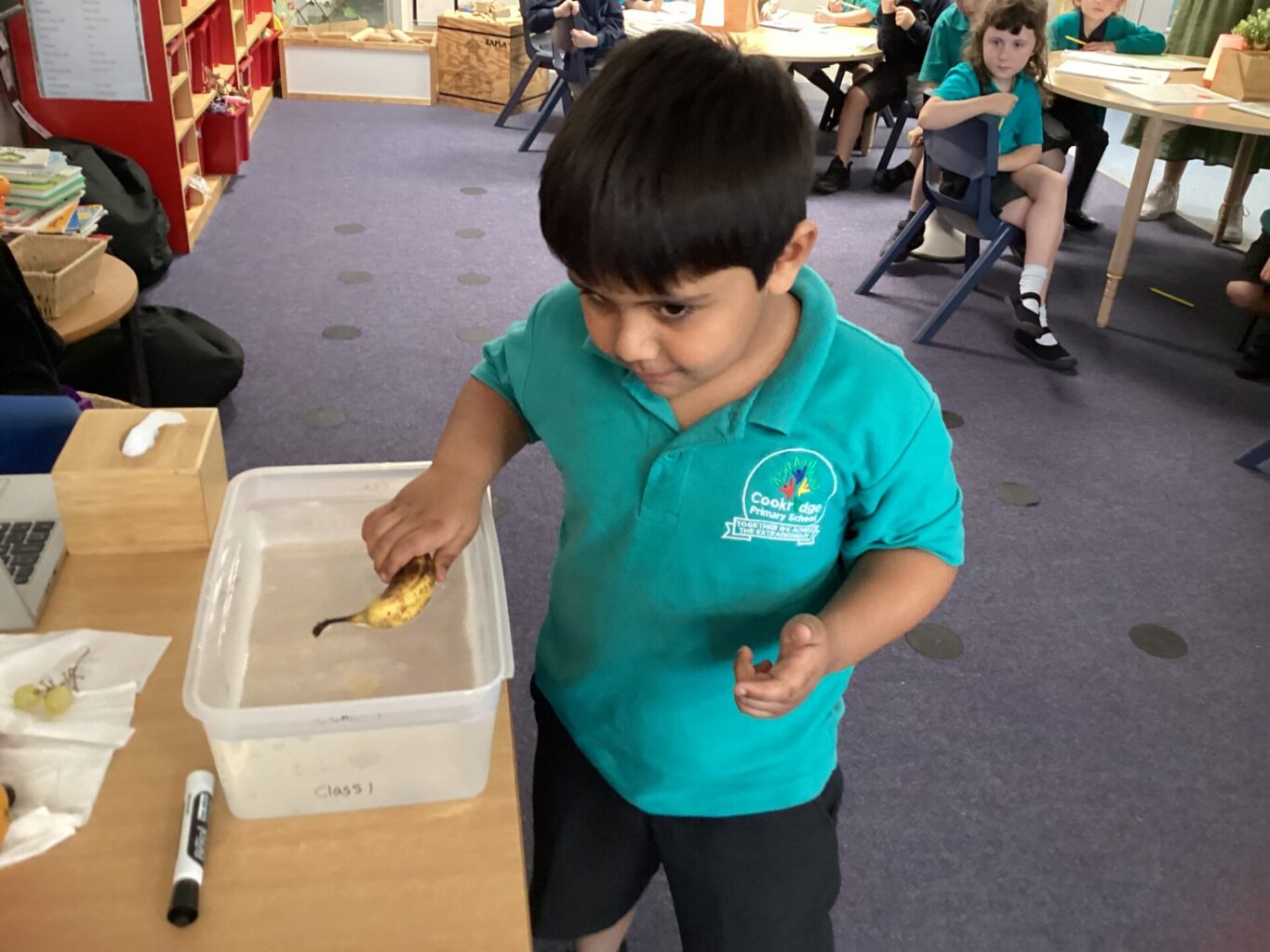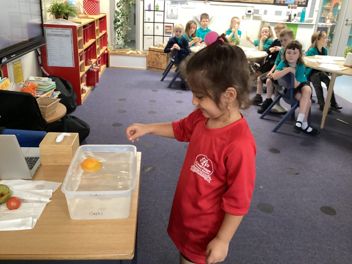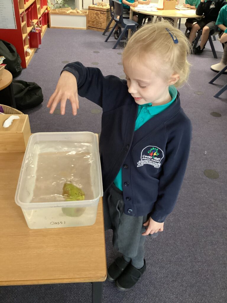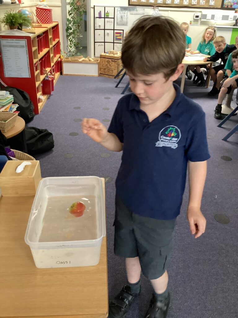 In science, we have been thinking about what things float and what sinks. We completed an experiment using different fruits to see which would float and which would sink and why. We made predictions before carrying out the experiment and then looked to see if we were correct afterwards.