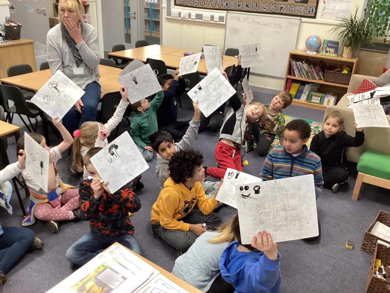 In English this week, we have all begun to read a new story called ‘The hunter’. Year One have been doing some role play work around the story. They wrote questions to ask the characters from the story and then practised hot seating. They found out more facts about their chosen animal to write about and finished the week planning a story for next week. Their phonic sound has been /ow/ and /oe/ saying /oa/ eg show and toe. Year two have also been doing planning for their descriptive narrative. They having been thinking about different conjunctions and how they can use them to join sentences together. Their phonic sound this week has been /mb/ saying /m/ eg thumb.