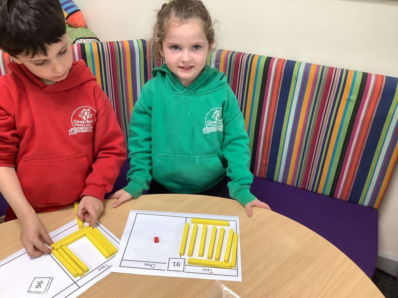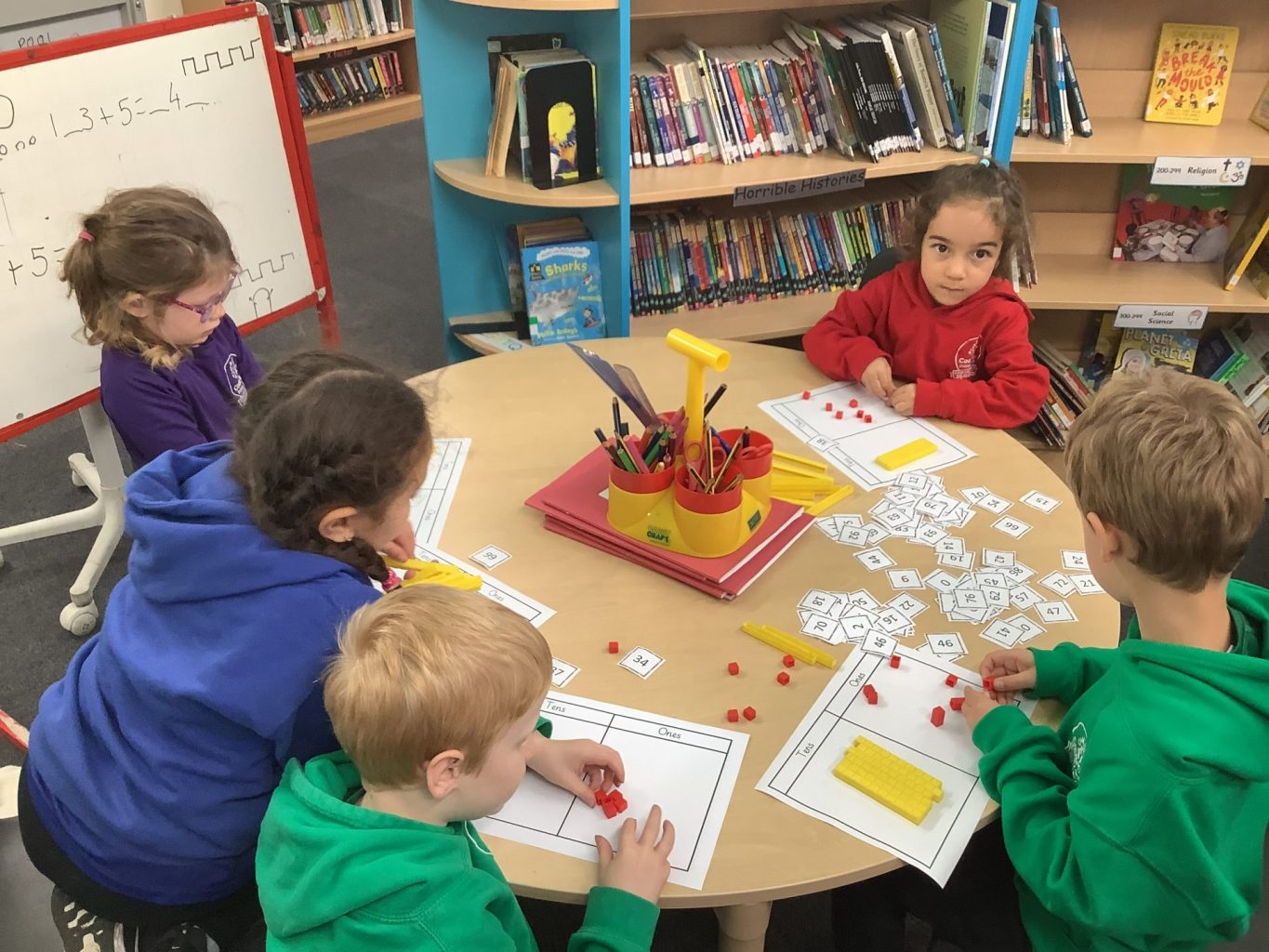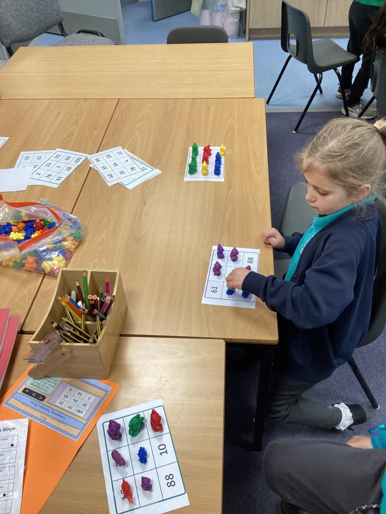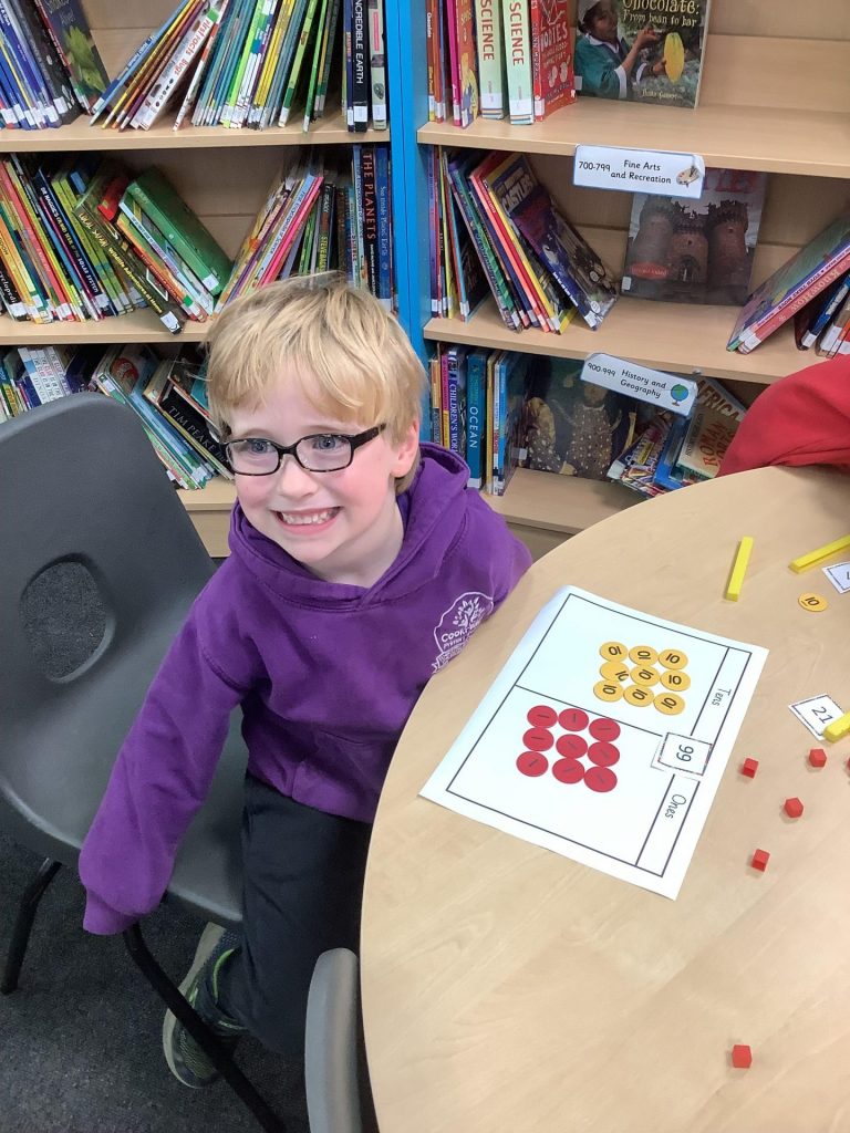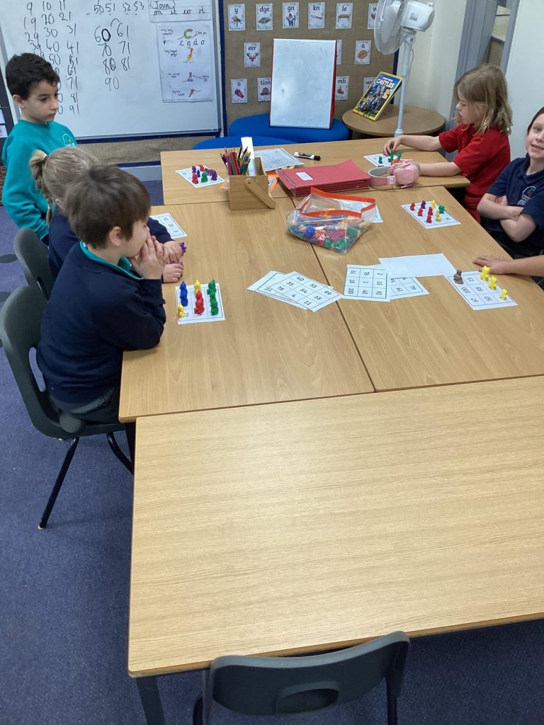 In Maths, Year one have been focusing on place value using tens and ones. They have been identifying two digit and representing them using the Base ten. They have also begun to partition numbers into tens and ones. In Year two one group has continued looking at greater than and less than. They have been playing Bingo games and identifying the greater and less than number and using Base 10 with the signs < > =. The other group have continued their addition work, using tens and ones and doing column addition.