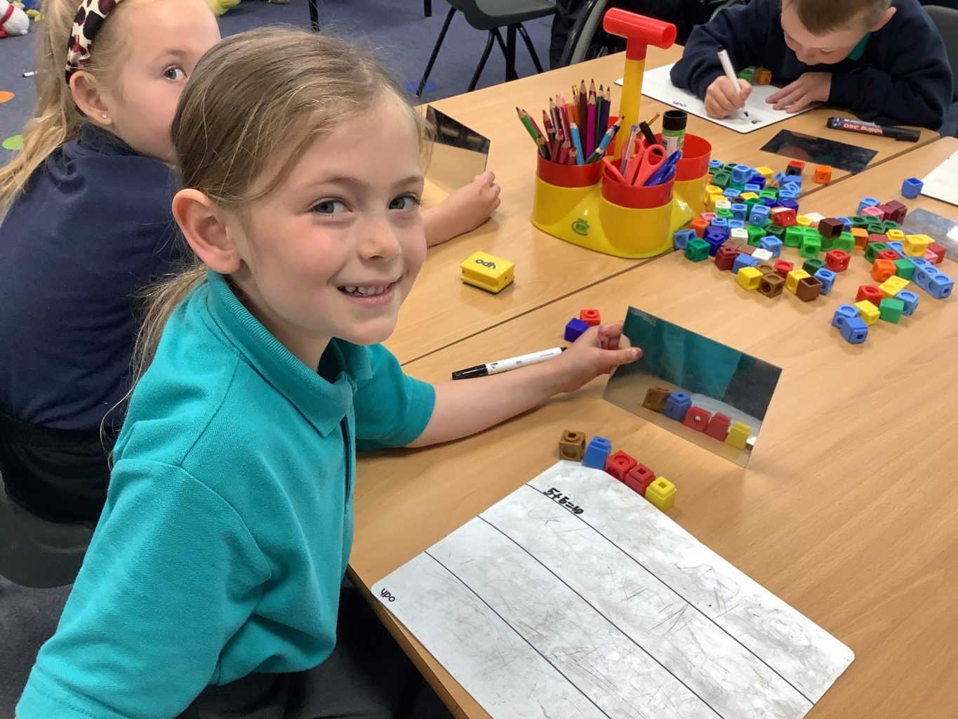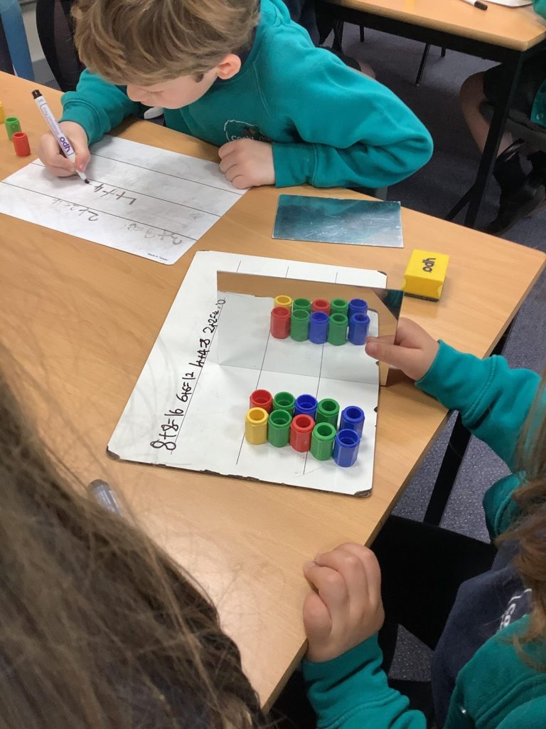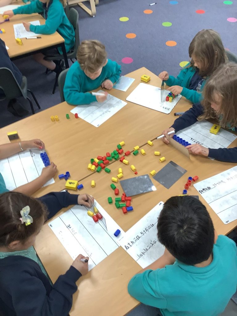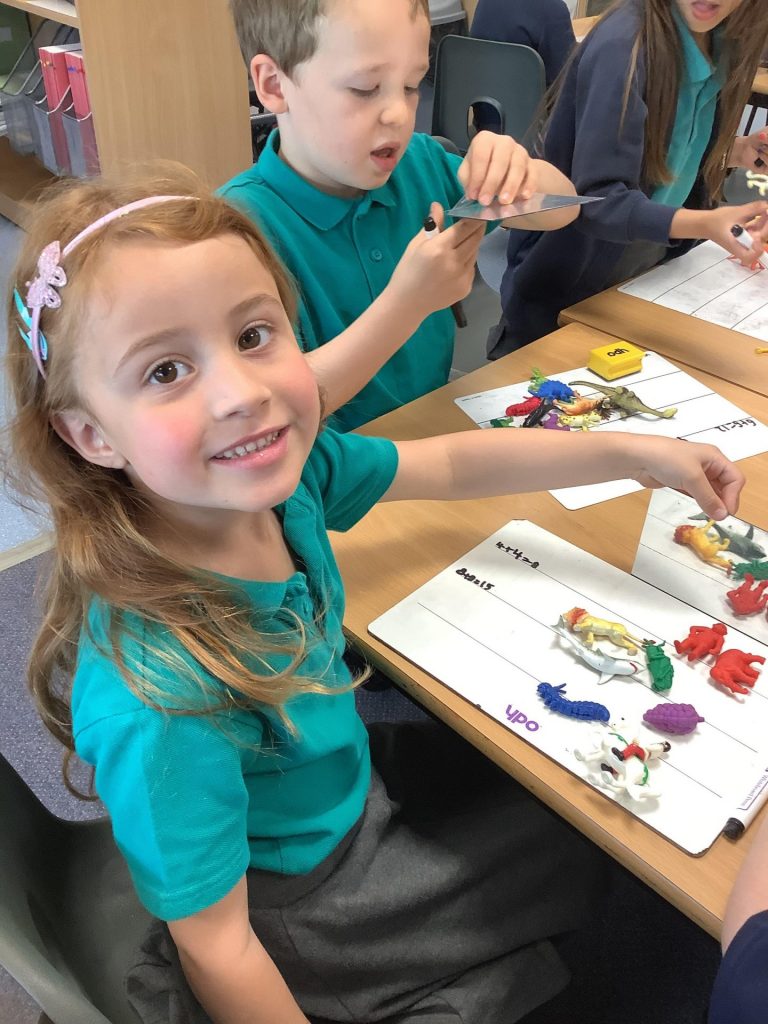 In Maths, Class 1 have been learning about halves and have been using fruit to demonstrate a half. Class 2 have continued learning how to make and use arrays. They have been learning about groups of objects and have begun to divide and learned the importance of sharing amounts into equal groups.