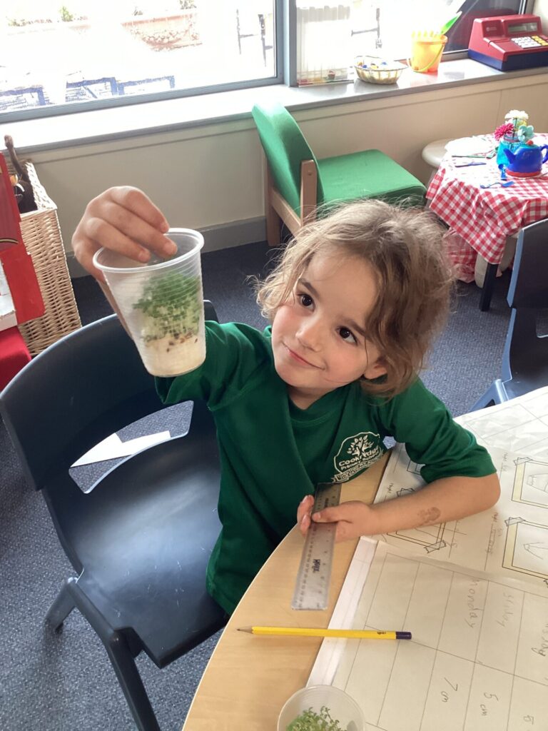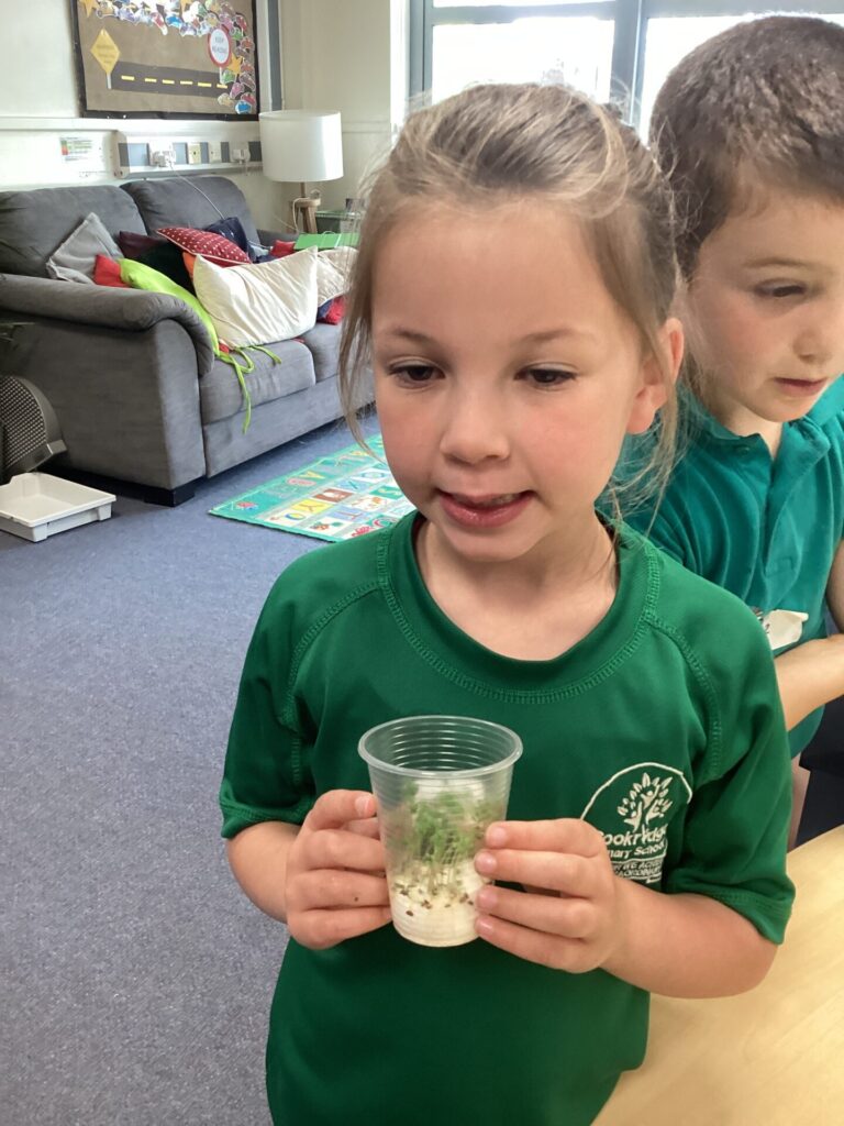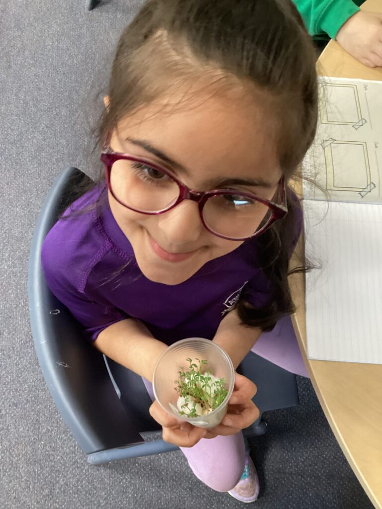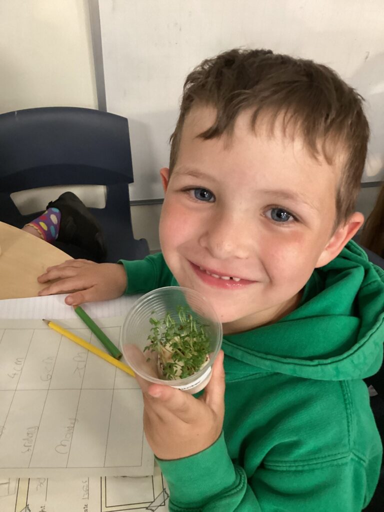 We have been observing our cress plants in science. We have been ensuring that they have water and remain in the sunlight each day. We have been measuring their growth and noticed that it grows quite quickly. We have recorded the height each day and drawn pictures to show the rapid growth.