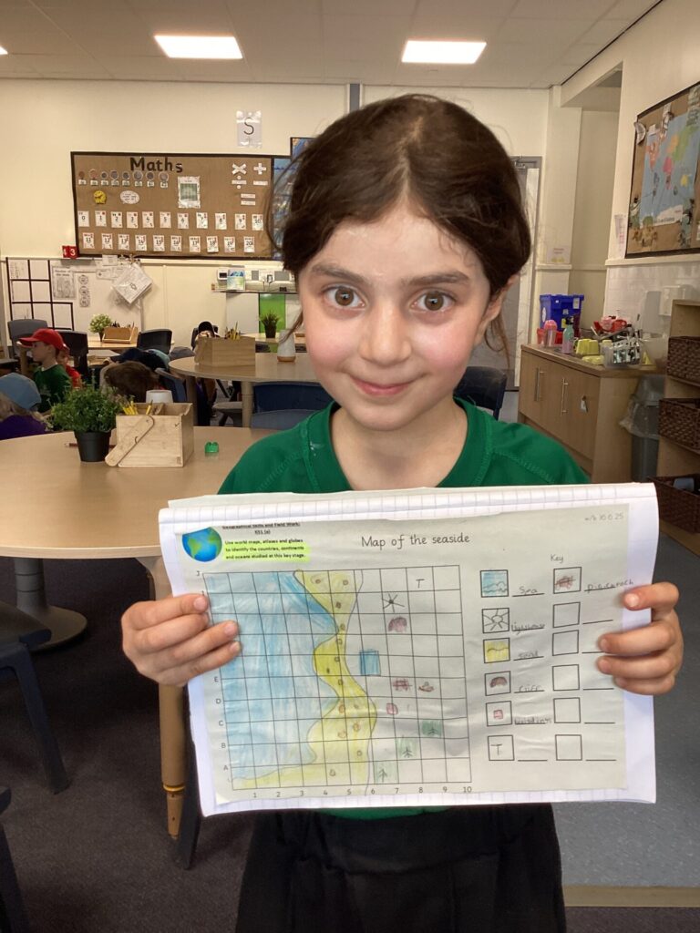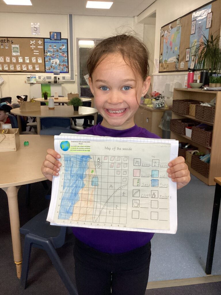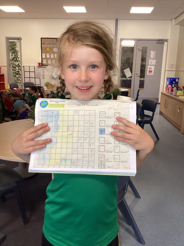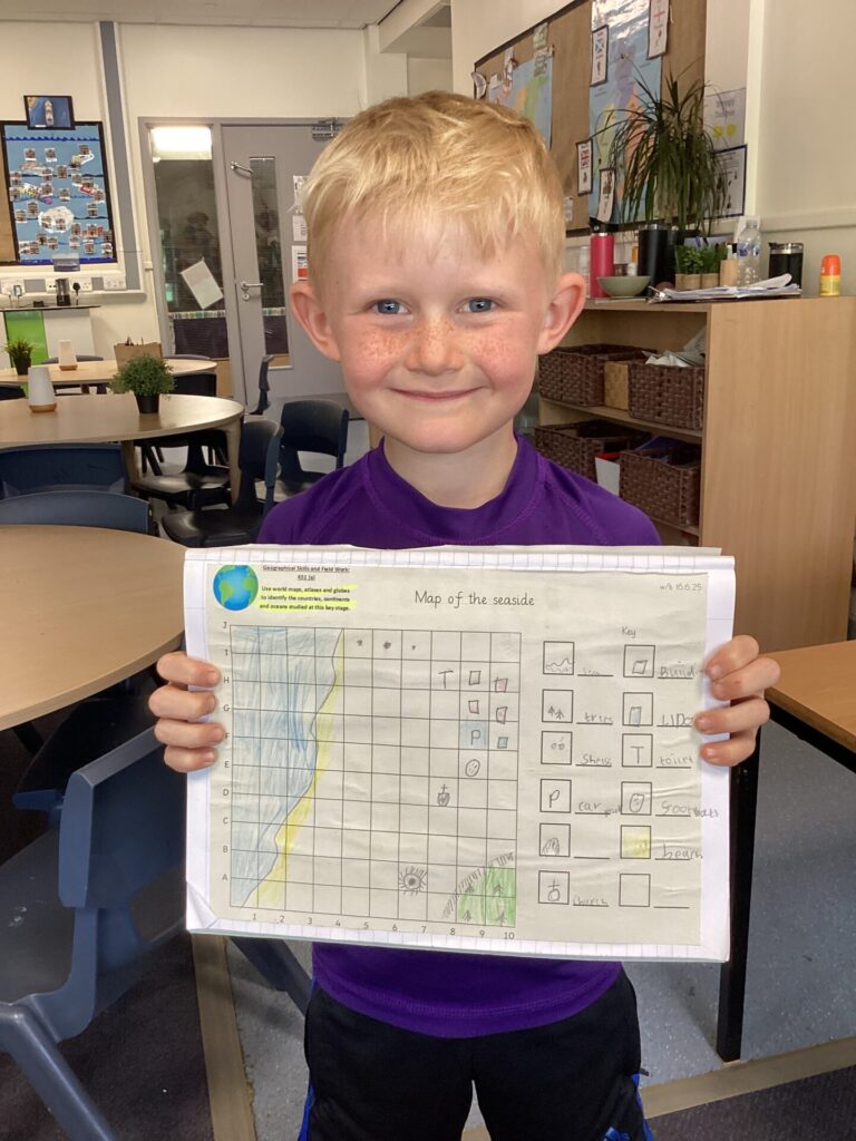We have been focusing on human and physical features in Geography again. This time, we used a map to draw on some human and physical features. We thought about which human features clustered together and why eg houses, shops, schools etc..