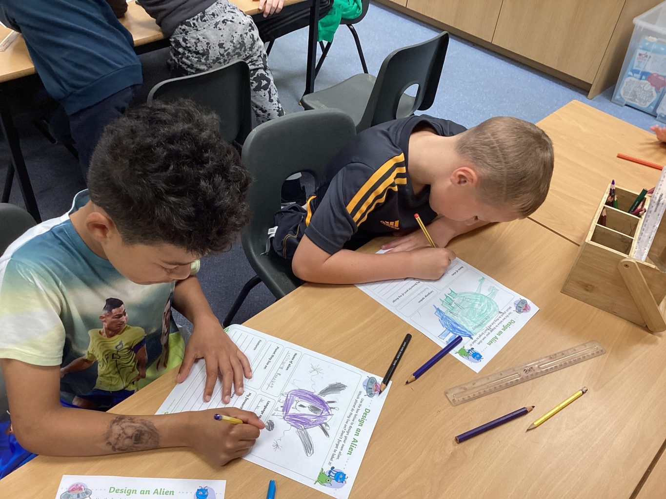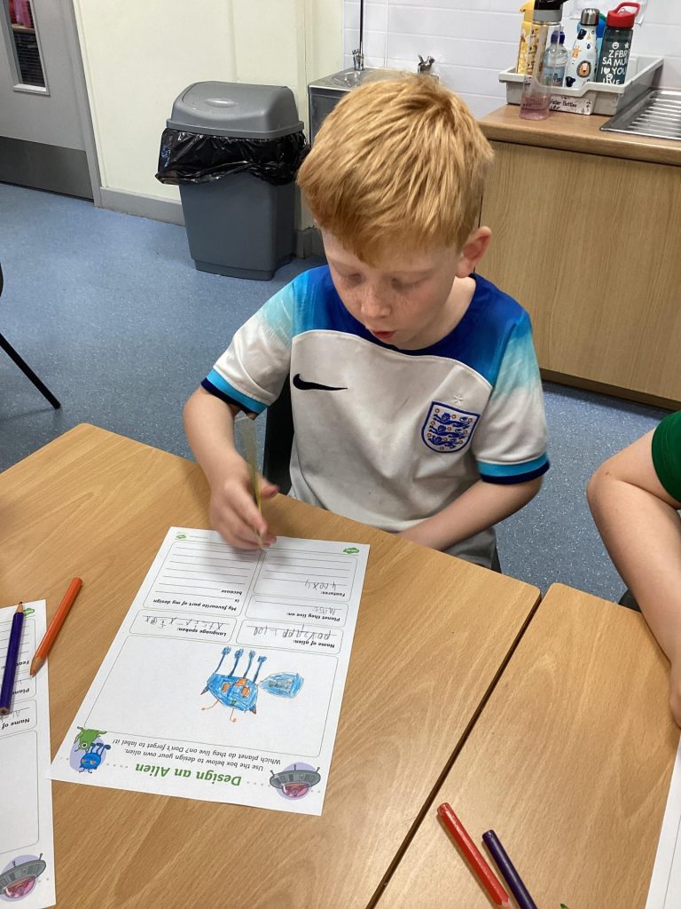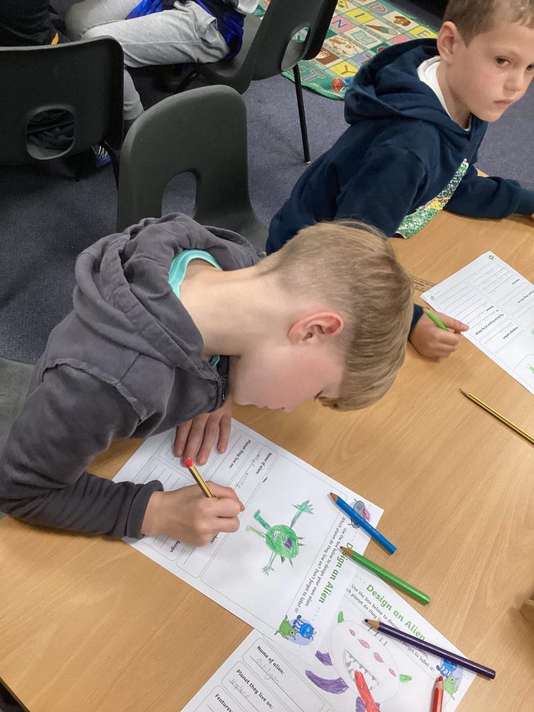 We have all been reading the story of ‘Beegu’ this week and Year One have completed a reading comprehension about it. They have also been practising using suffixes, writing sentences about Beegu and have also completed a diary entry. Their phonic focus this week has been on a adding -ing to verbs which mean the action is happening singing and adding -er which changes a verb to a noun eg sing – singer. Year Two have done a cold write about visiting another planet and have begun to learn how to join their handwriting. Their phonic focus for this week was homophones.