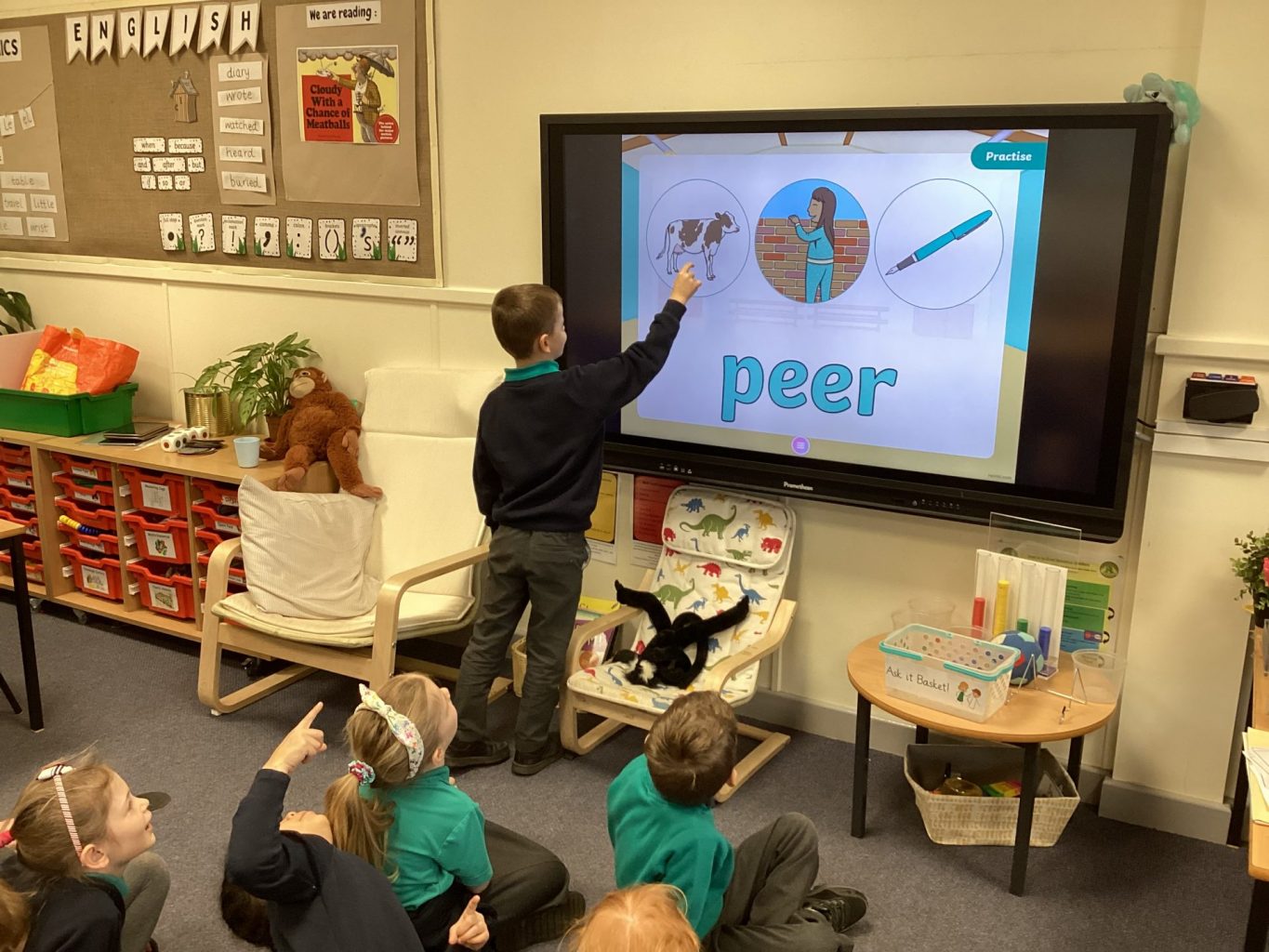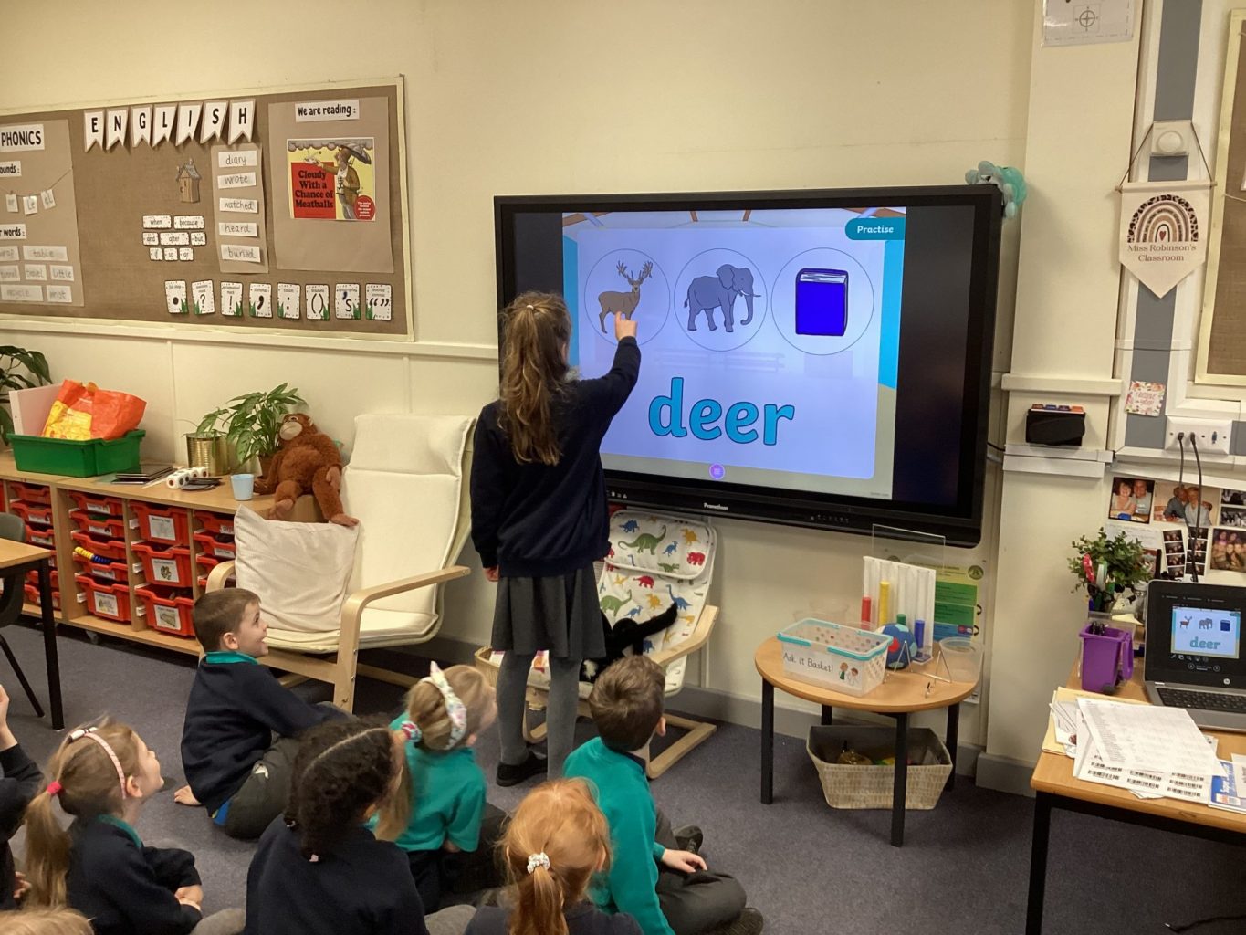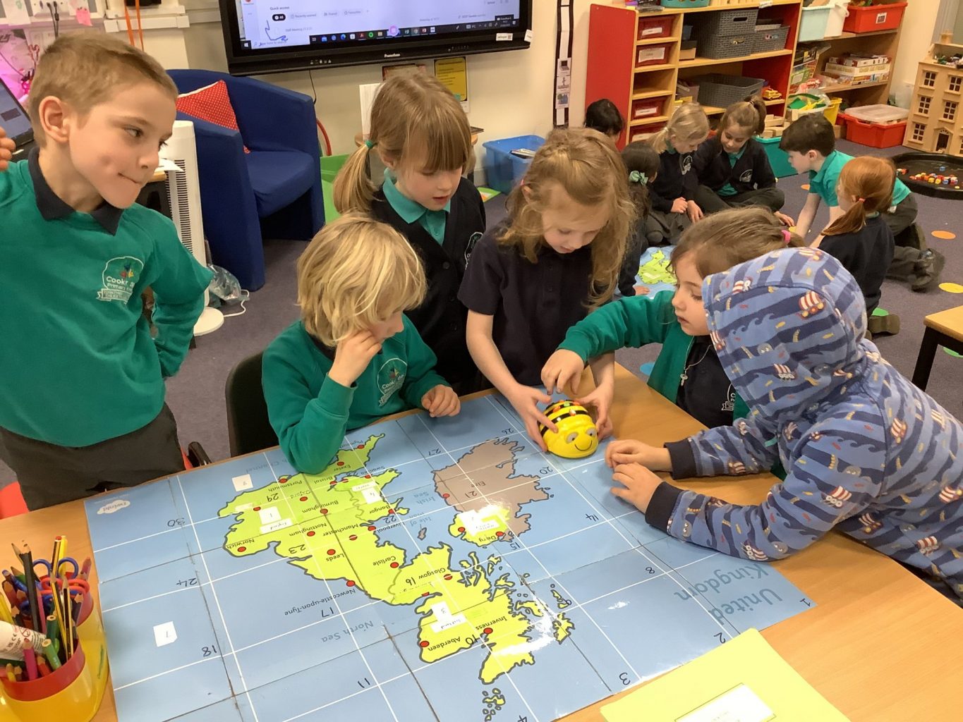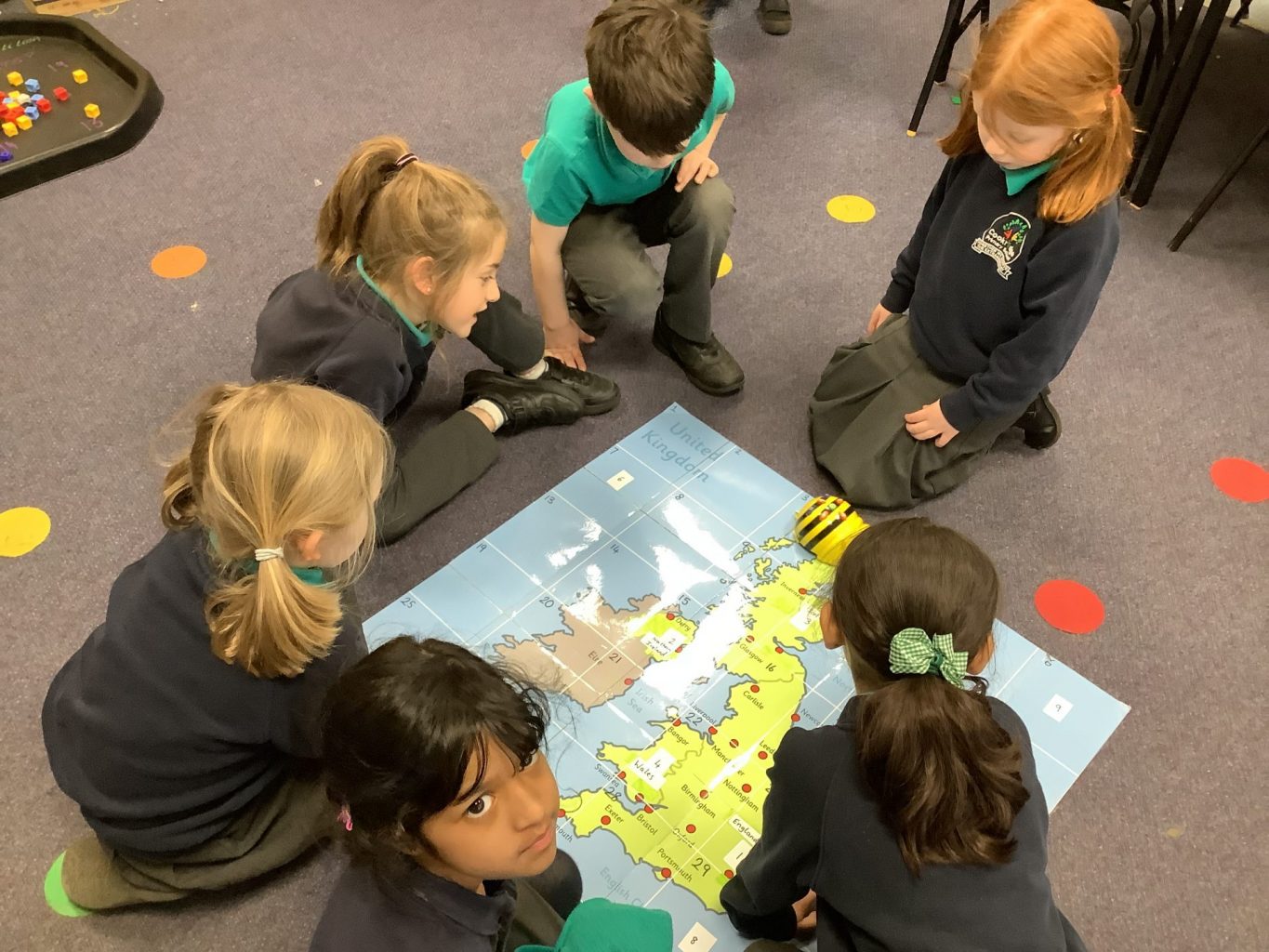 We have had the Beebots out in computing this week. We linked it to Geography and looked at how to program the Beebot to travel from one place on the UK map to another place. Year one were focusing on basic operations of how to make the Beebot move and turn.
