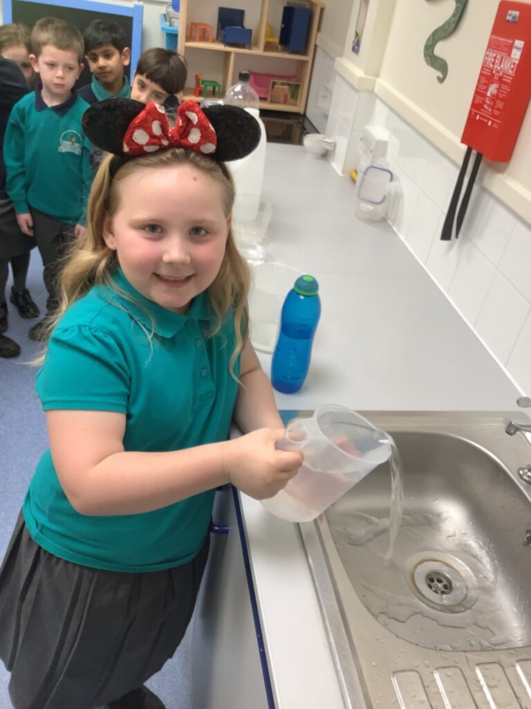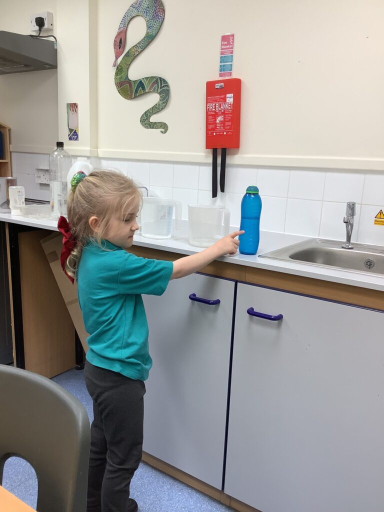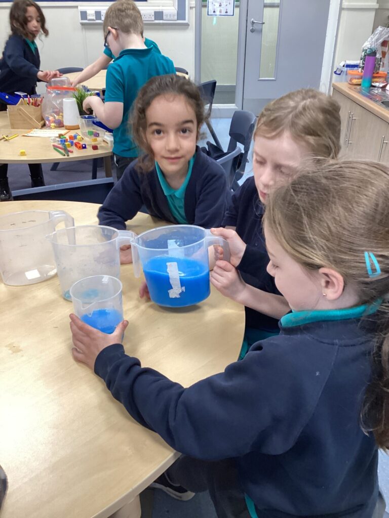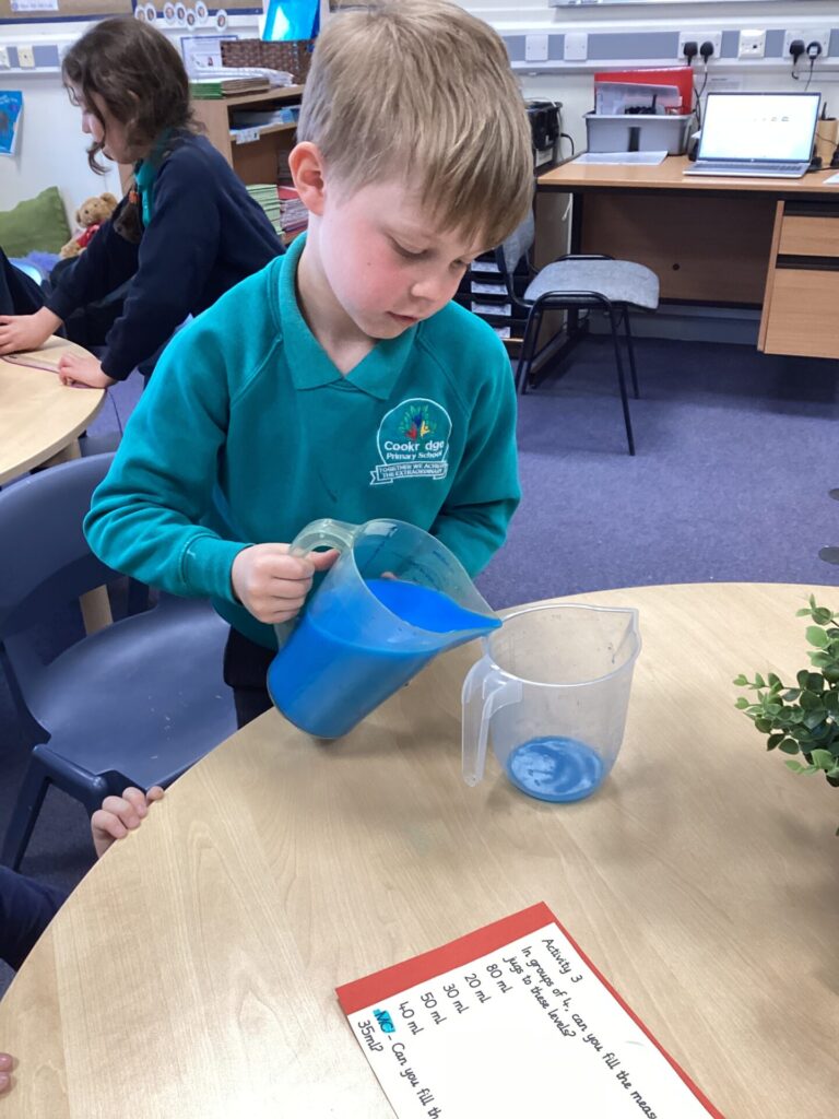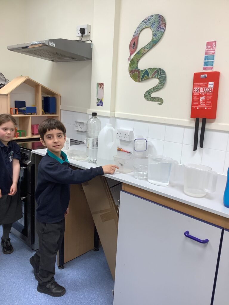In Maths, Year One have been learning about capacity and volume. They have used basic language of full, half full, empty and nearly full/ nearly empty. They have compared the capacity of different containers and thought about which ones could hold more. They have also worked out how many cups would fit into another. In Year Two, one group have finished their multiplication work and have begun looking at measurements. They have looked at measuring in length, weights and capacity. The other group have continued with division, focusing on inverse relationship with multiplication and the reasoning about it.
