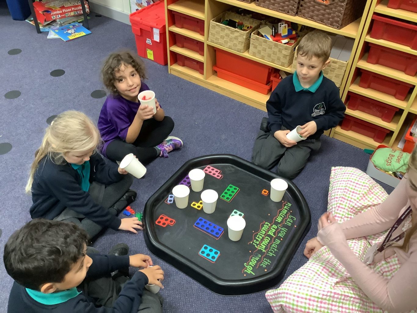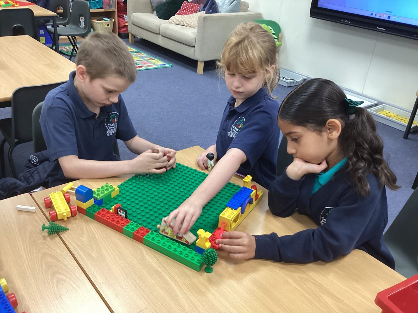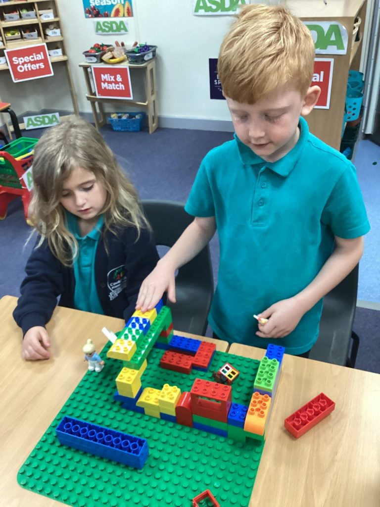 In Science, we have been looking at categorising. The children were able to think of all kinds of different ways that they could sort their toys. For example, colours, hard and soft, plastic and wooden, those that connect onto other things and those that don’t. We used venn diagrams and learnt how to use them when they overlap to incorporate both the categories eg a till that was made out of wood and plastic.