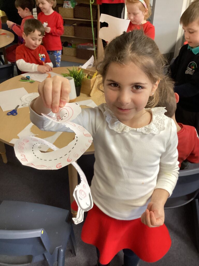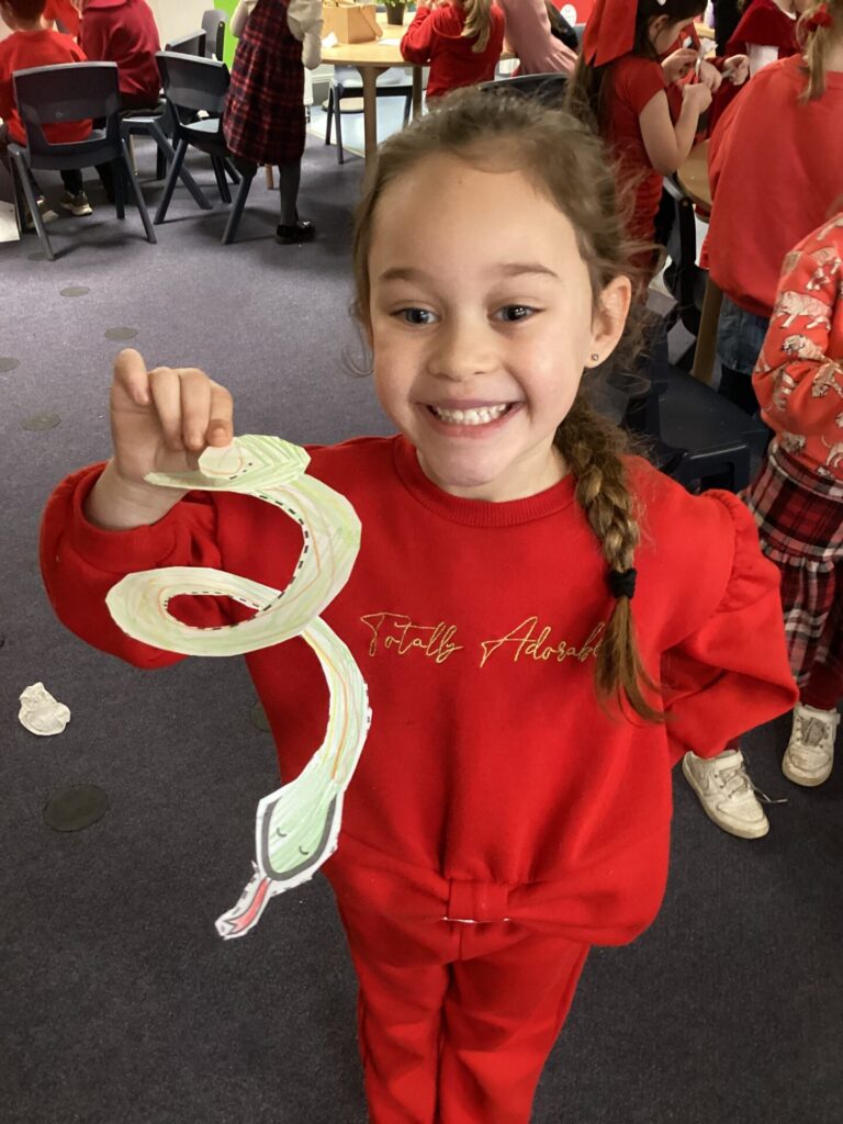 We have had a fantastic week in Key Stage One, learning about and celebrating Chinese New Year. It began with Forest schools where we listened to the story of Chinese New Year around the firepit and acted it out. We talked about how each year is then named after an animal and what animal their birth year was named. As this year is the year of the snake, the children worked together to use natural materials to make the longest snake they could.