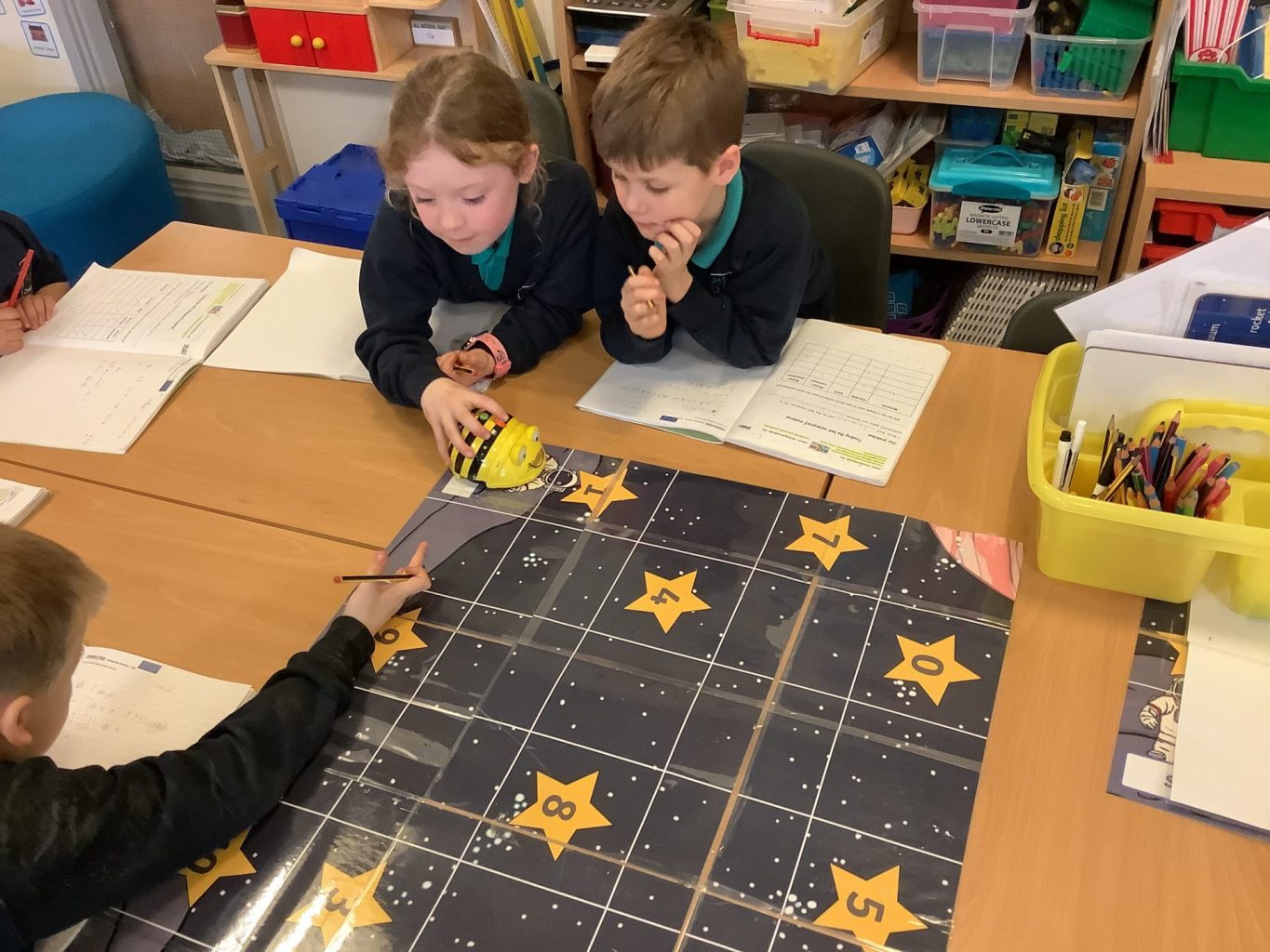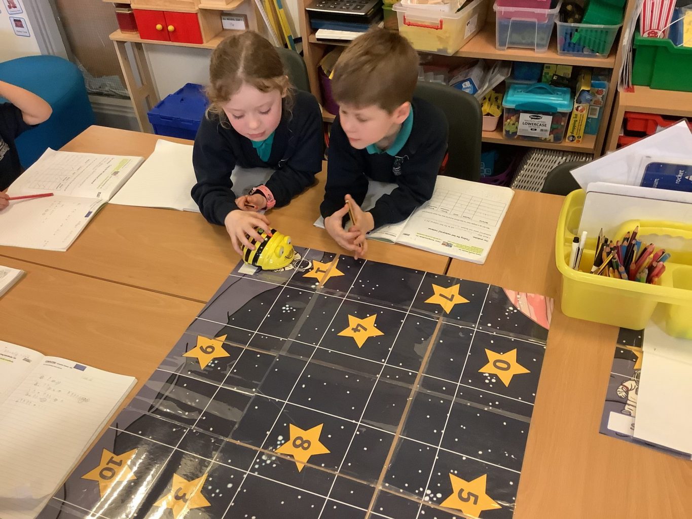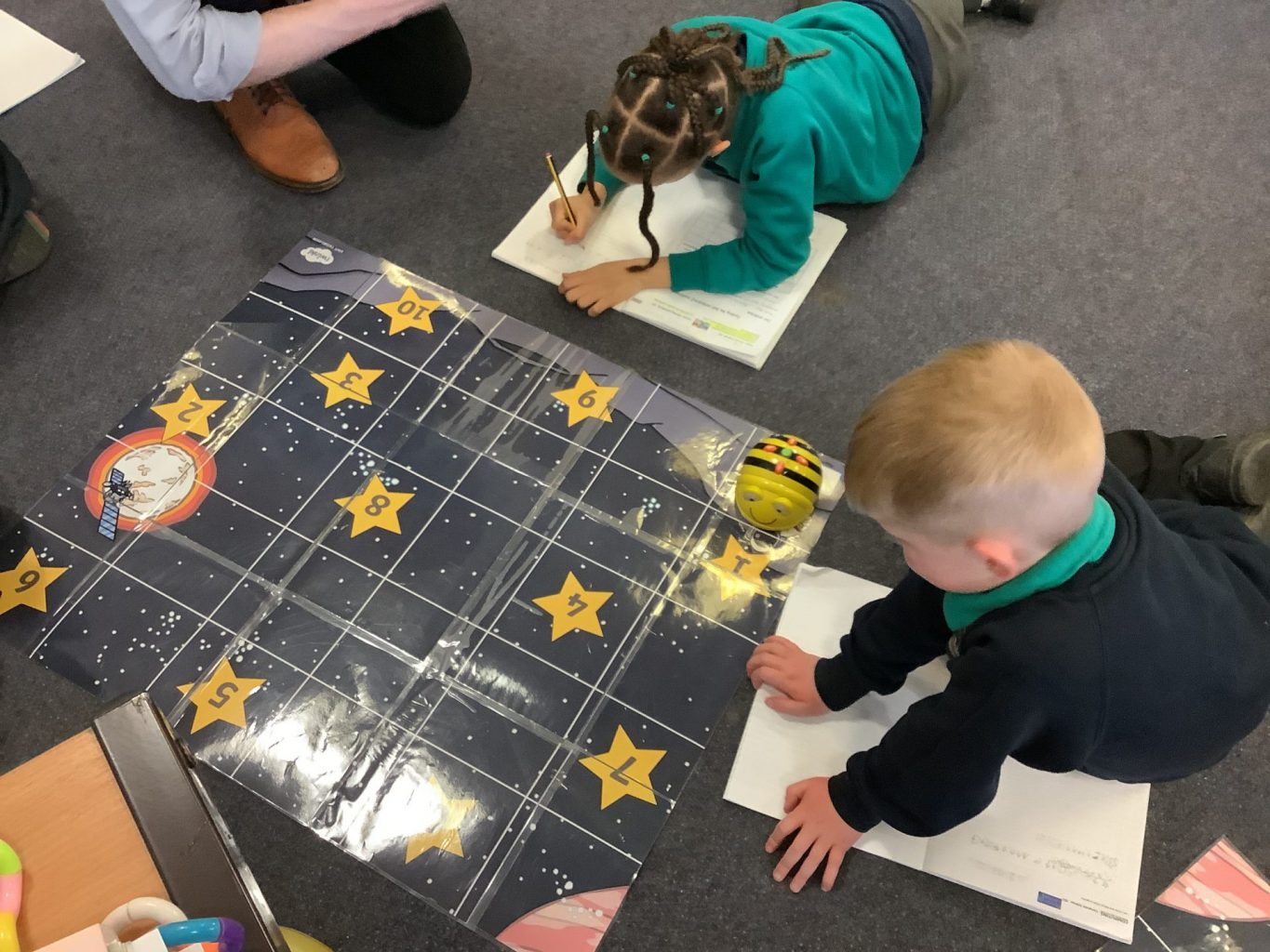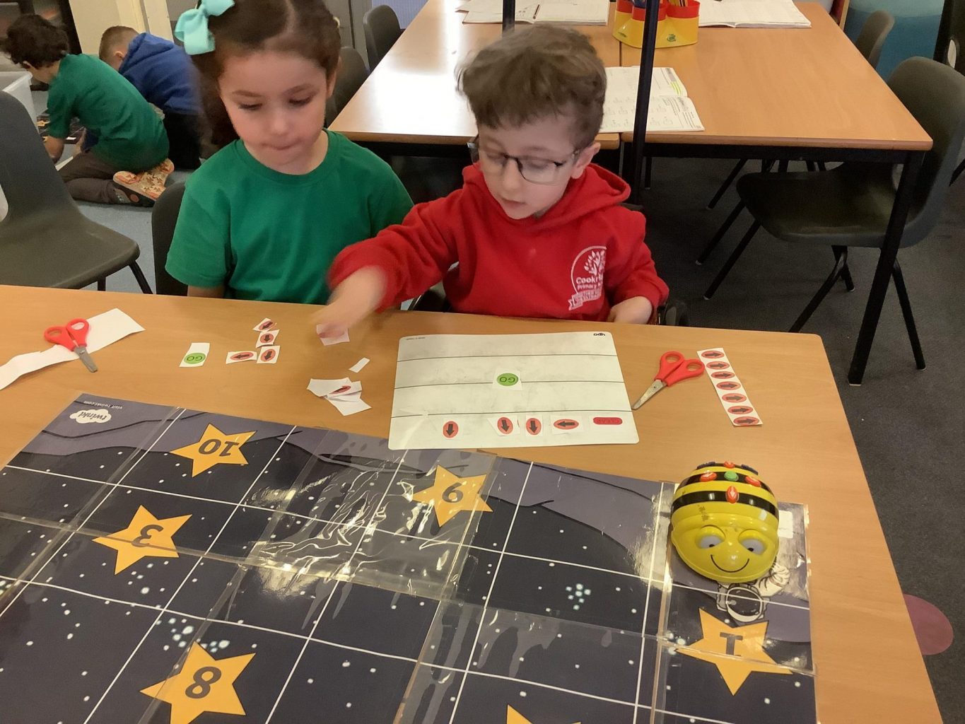 The Beebots were out again for computing this week. After learning how to program the Beebots last time, this time we began to think about writing our own instructions to direct the Beebot. We worked in groups to get the Beebot from the start to different numbers on our space map. We then had to cut out the instruction buttons and stick them in the correct order to show what we needed to press to form the correct alogorithm to get us to each number.