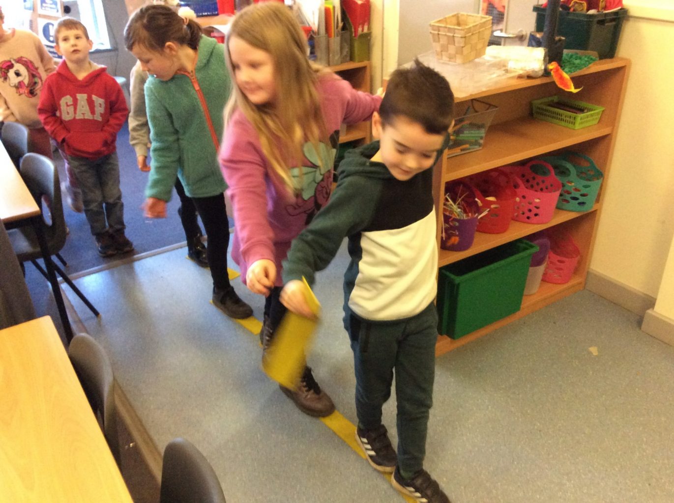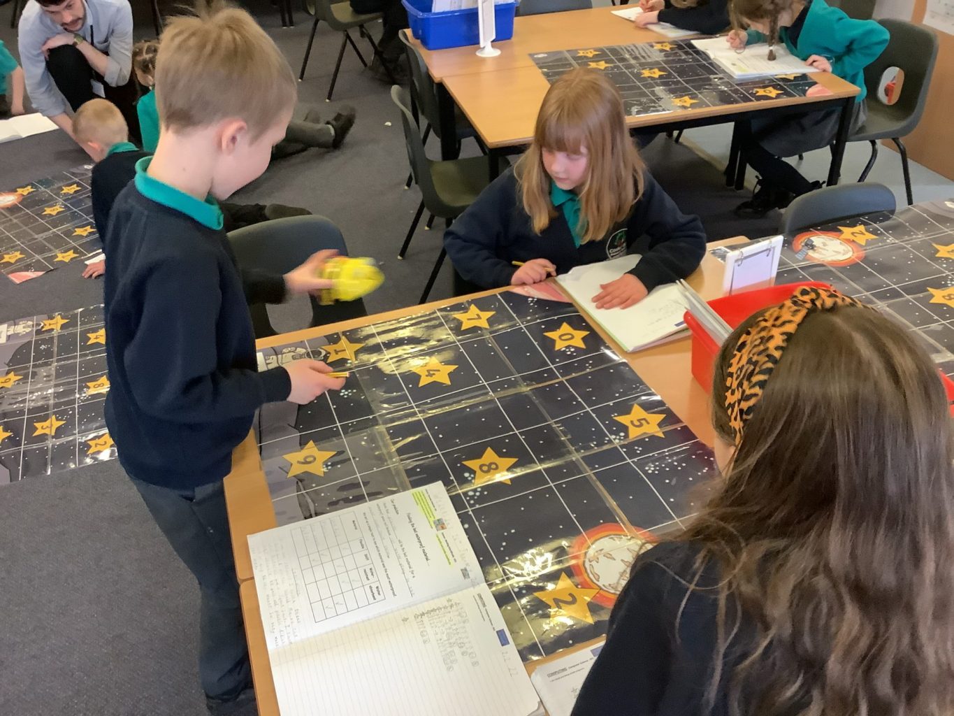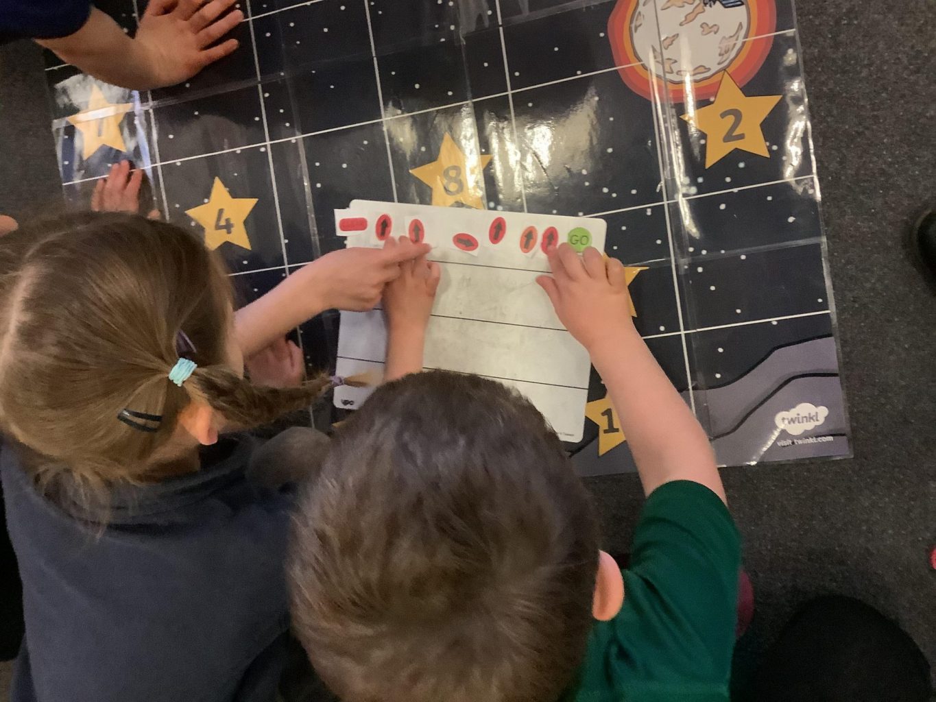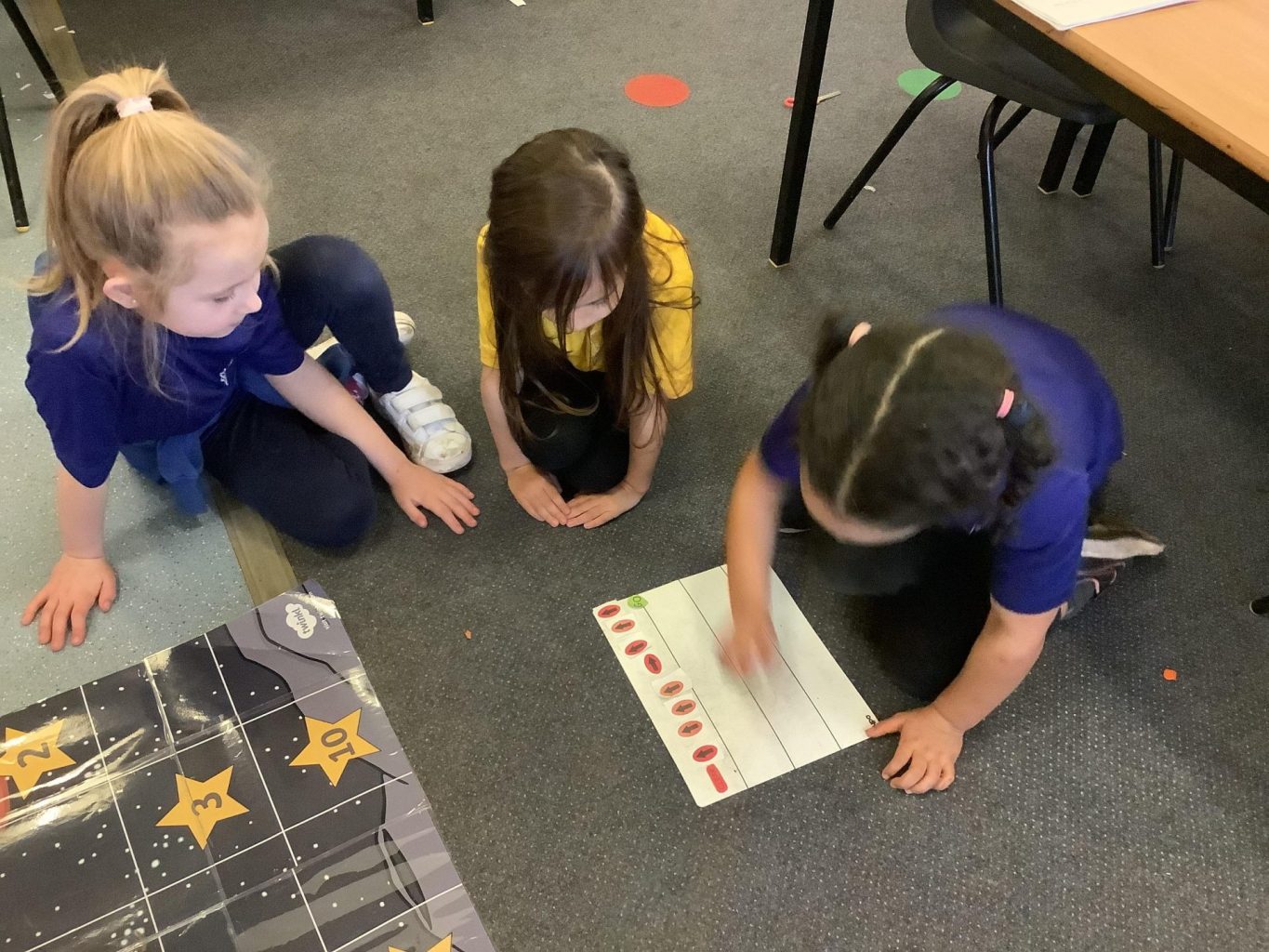 The Beebots were out again for computing this week. After learning how to program the Beebots last time, this time we began to think about writing our own instructions to direct the Beebot. We worked in groups to get the Beebot from the start to different numbers on our space map. We then had to cut out the instruction buttons and stick them in the correct order to show what we needed to press to form the correct alogorithm to get us to each number.