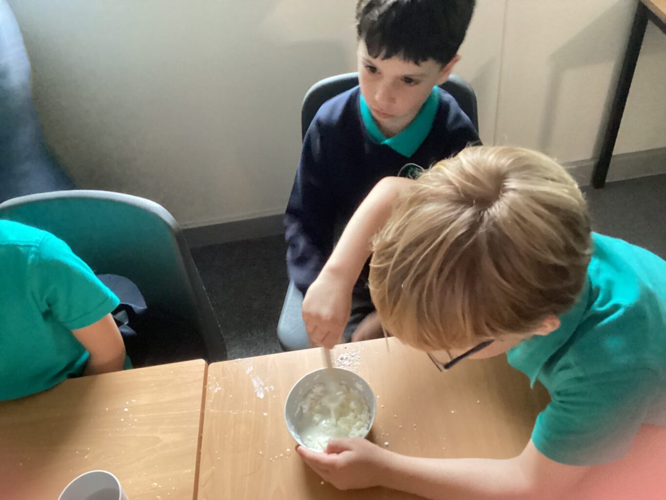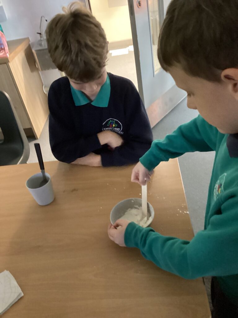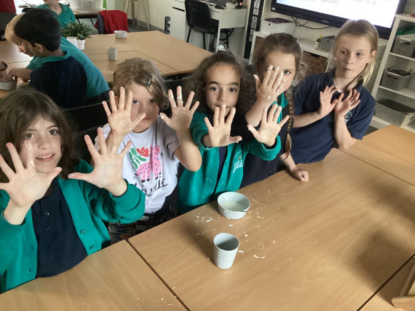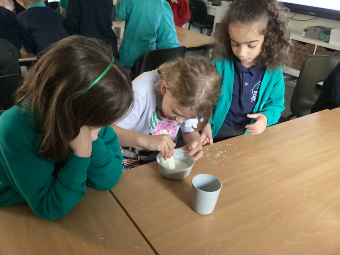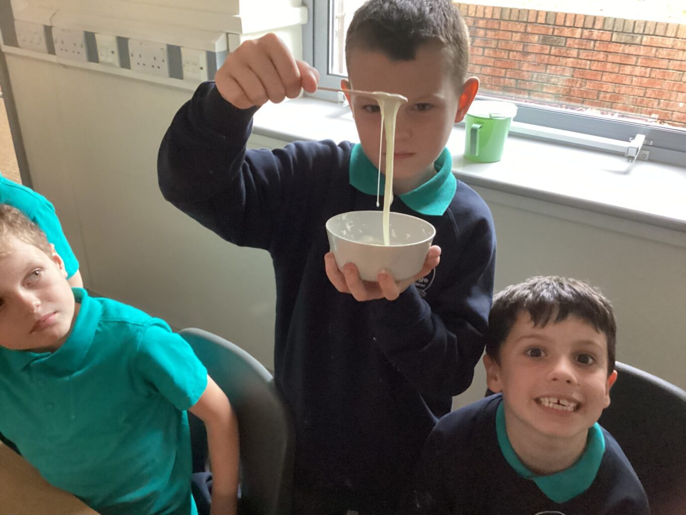 Today in science, we thought carefully about how to conduct an experiment. First, we considered what makes something an experiment, and learnt that it is to test something, record what happens, and use your observations to answer a question. We followed careful instructions to set up our own practical experiment by investigating whether cornflour and water make a solid or a liquid. We realised that the mixture could both be a solid and a liquid. This was because it is a ‘non-Newtonian liquid’ which means that the same material may appear more thick or runny in different situations – depending on the force or pressure applied to it.