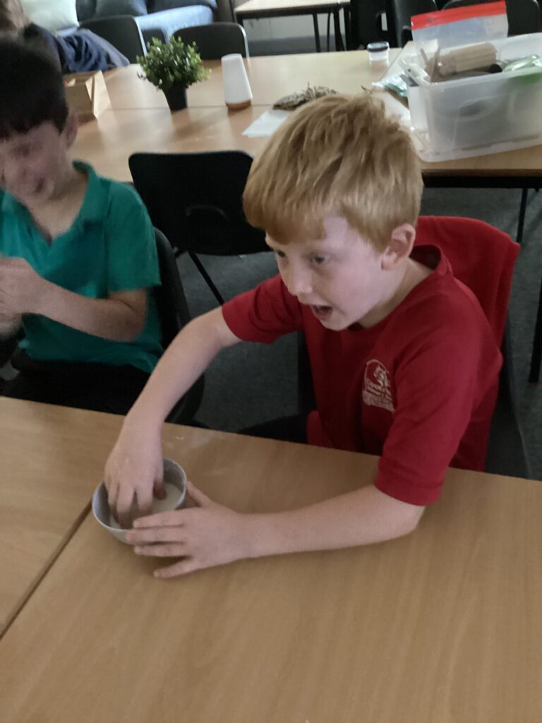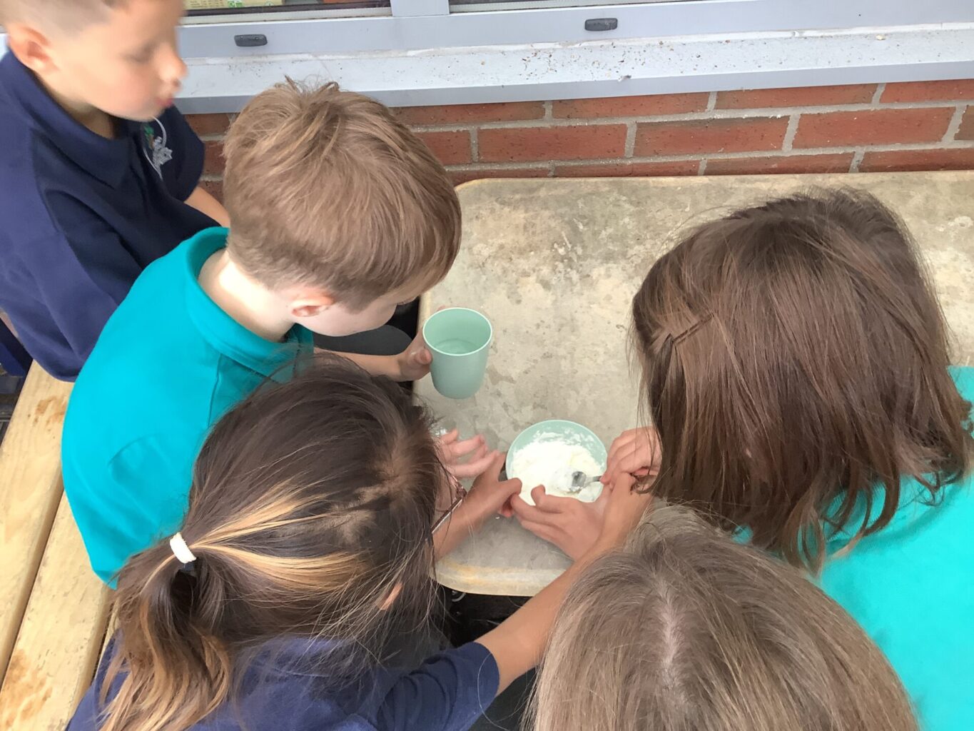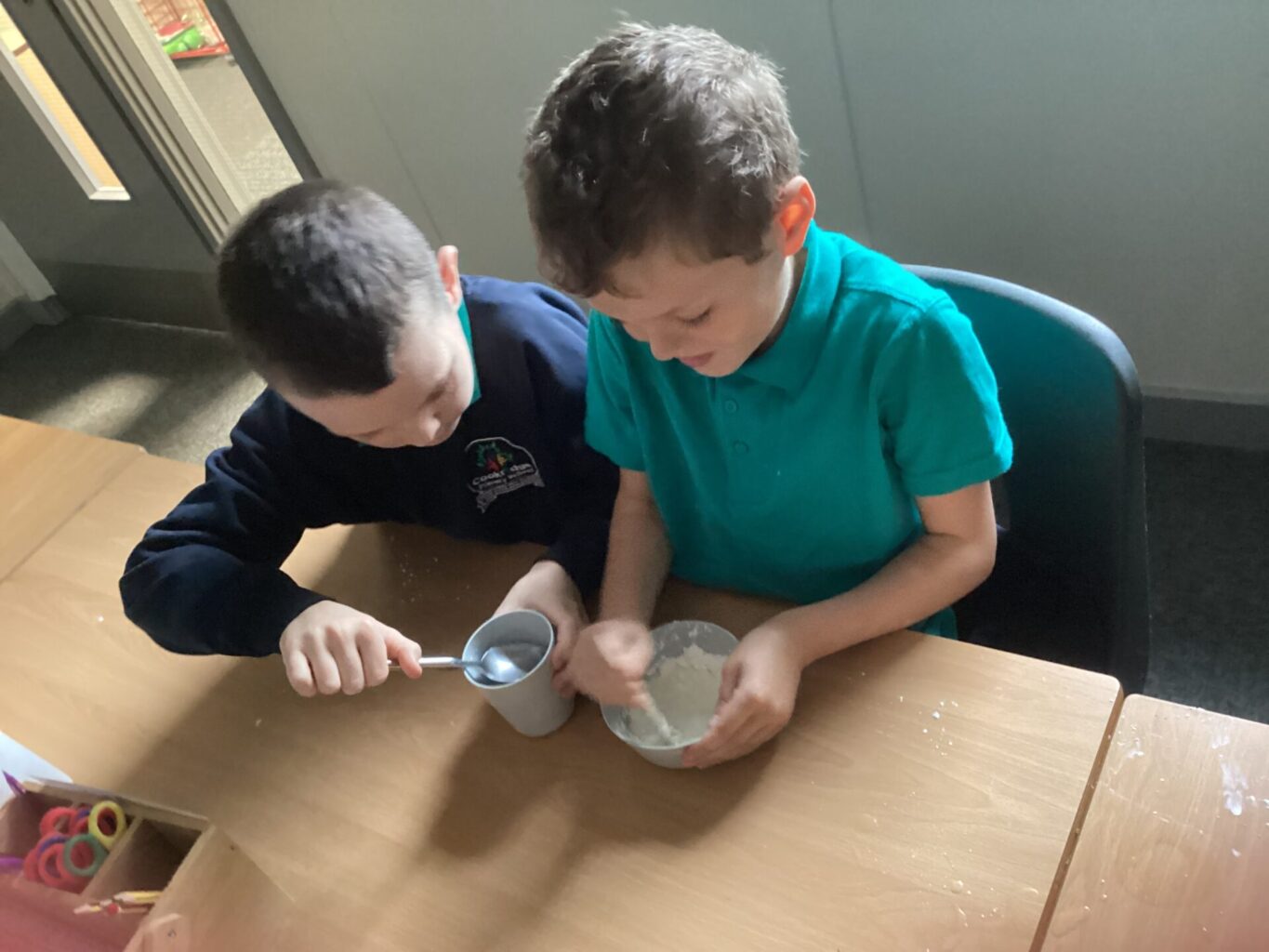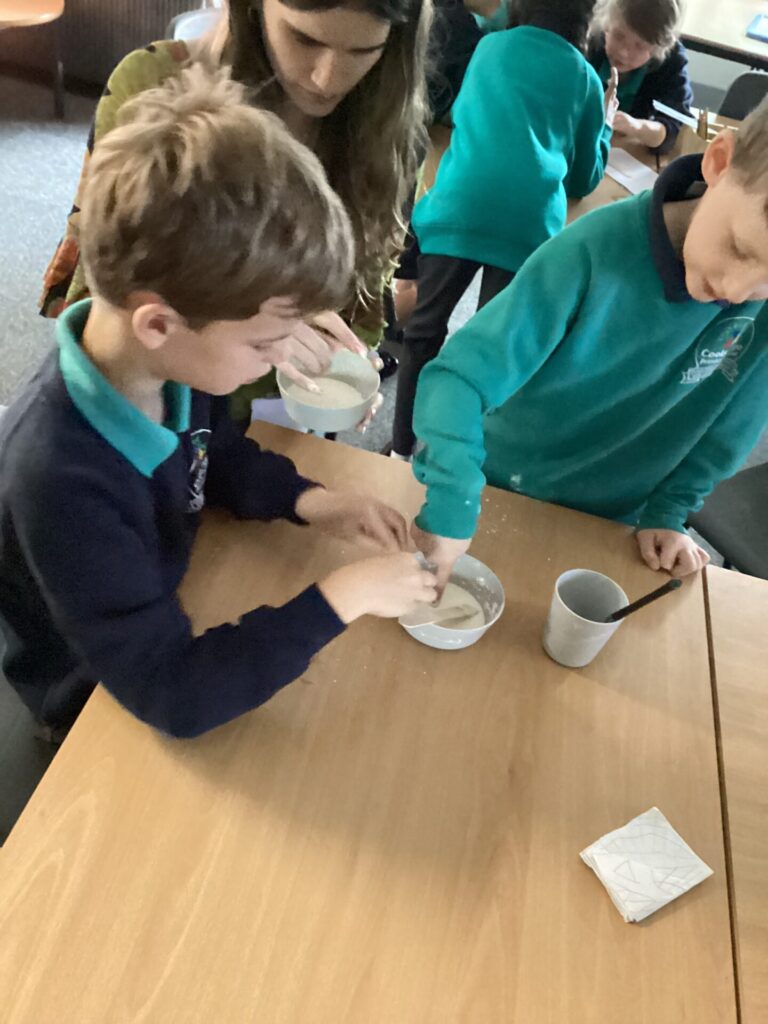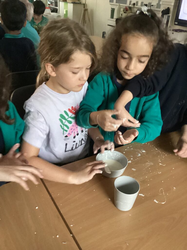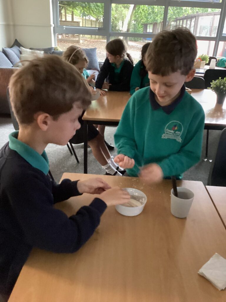 Today in science, we thought carefully about how to conduct an experiment. First, we considered what makes something an experiment, and learnt that it is to test something, record what happens, and use your observations to answer a question. We followed careful instructions to set up our own practical experiment by investigating whether cornflour and water make a solid or a liquid. We realised that the mixture could both be a solid and a liquid. This was because it is a ‘non-Newtonian liquid’ which means that the same material may appear more thick or runny in different situations – depending on the force or pressure applied to it.