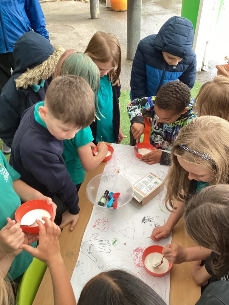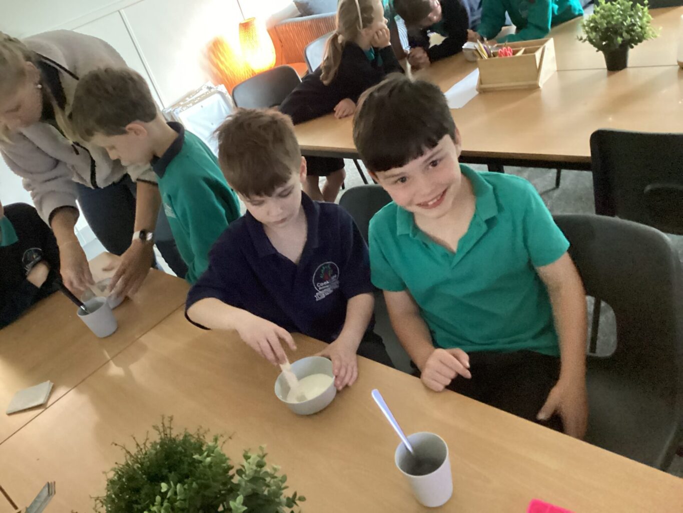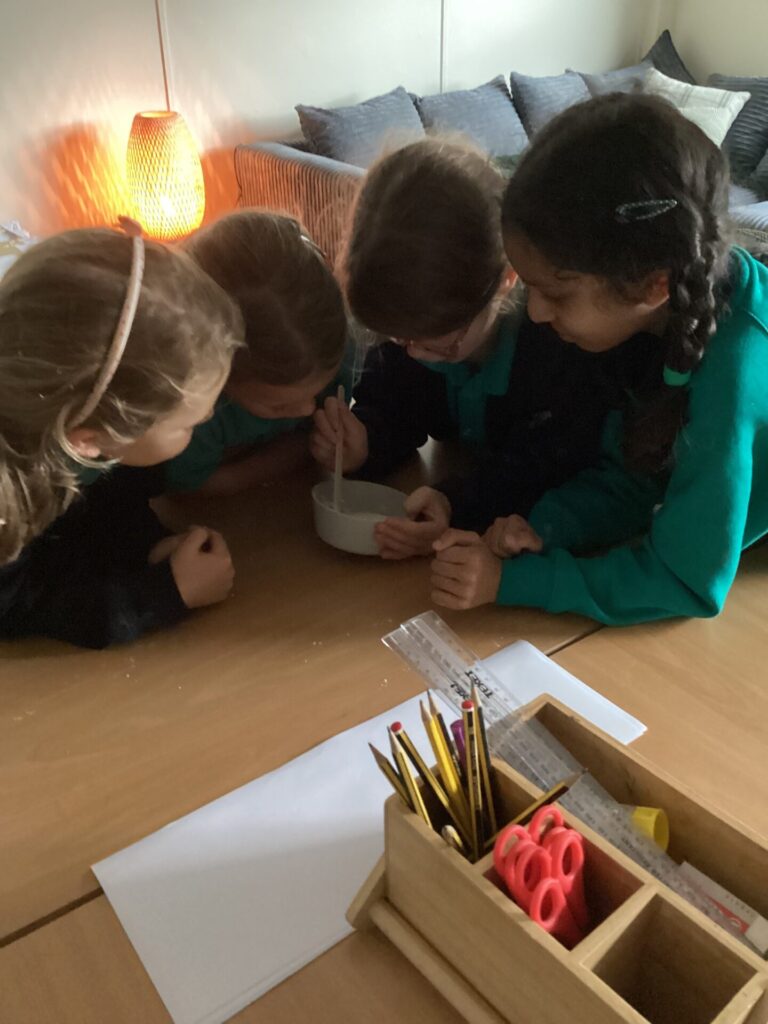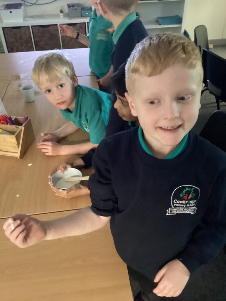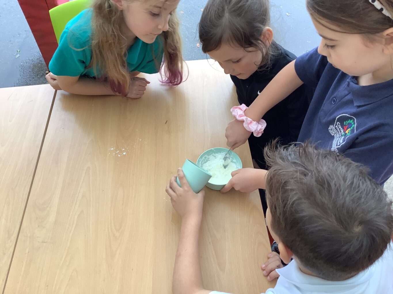 Today in science, we thought carefully about how to conduct an experiment. First, we considered what makes something an experiment, and learnt that it is to test something, record what happens, and use your observations to answer a question. We followed careful instructions to set up our own practical experiment by investigating whether cornflour and water make a solid or a liquid. We realised that the mixture could both be a solid and a liquid. This was because it is a ‘non-Newtonian liquid’ which means that the same material may appear more thick or runny in different situations – depending on the force or pressure applied to it.