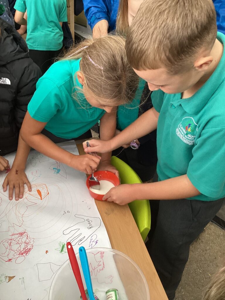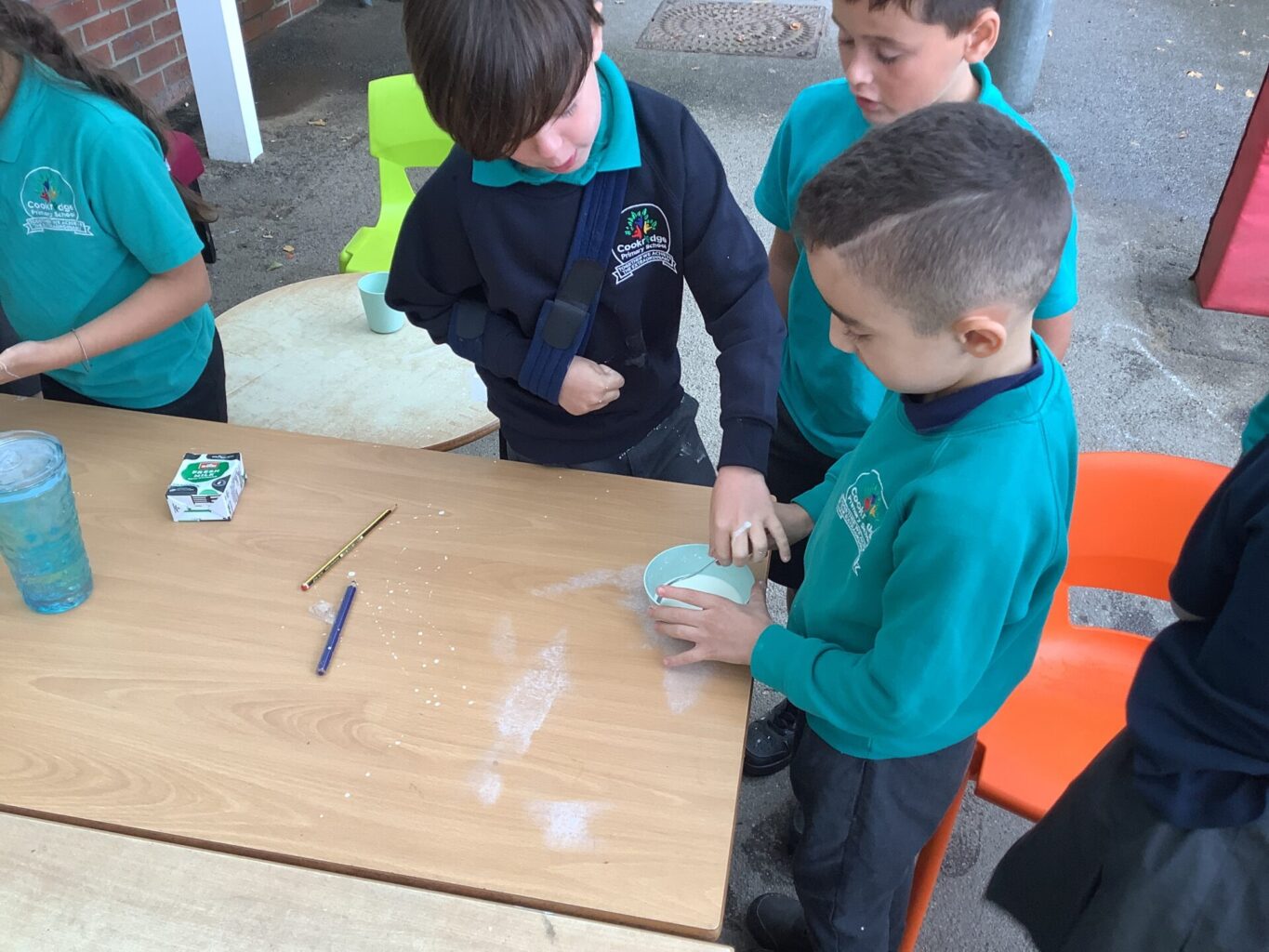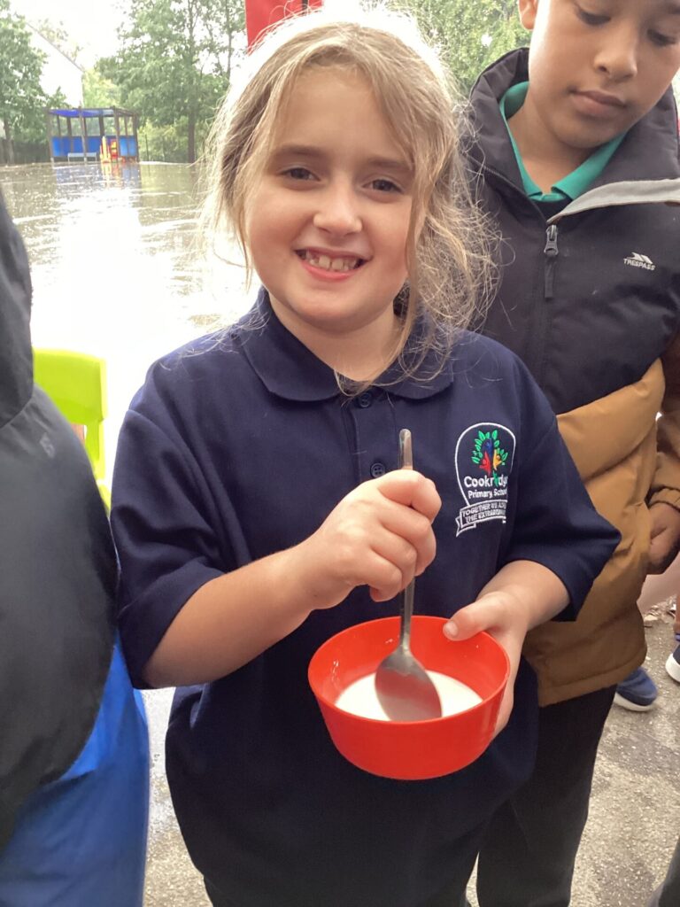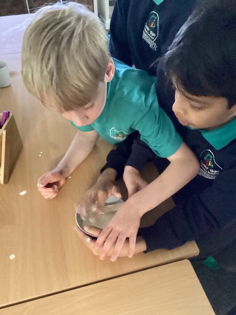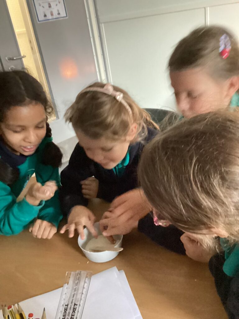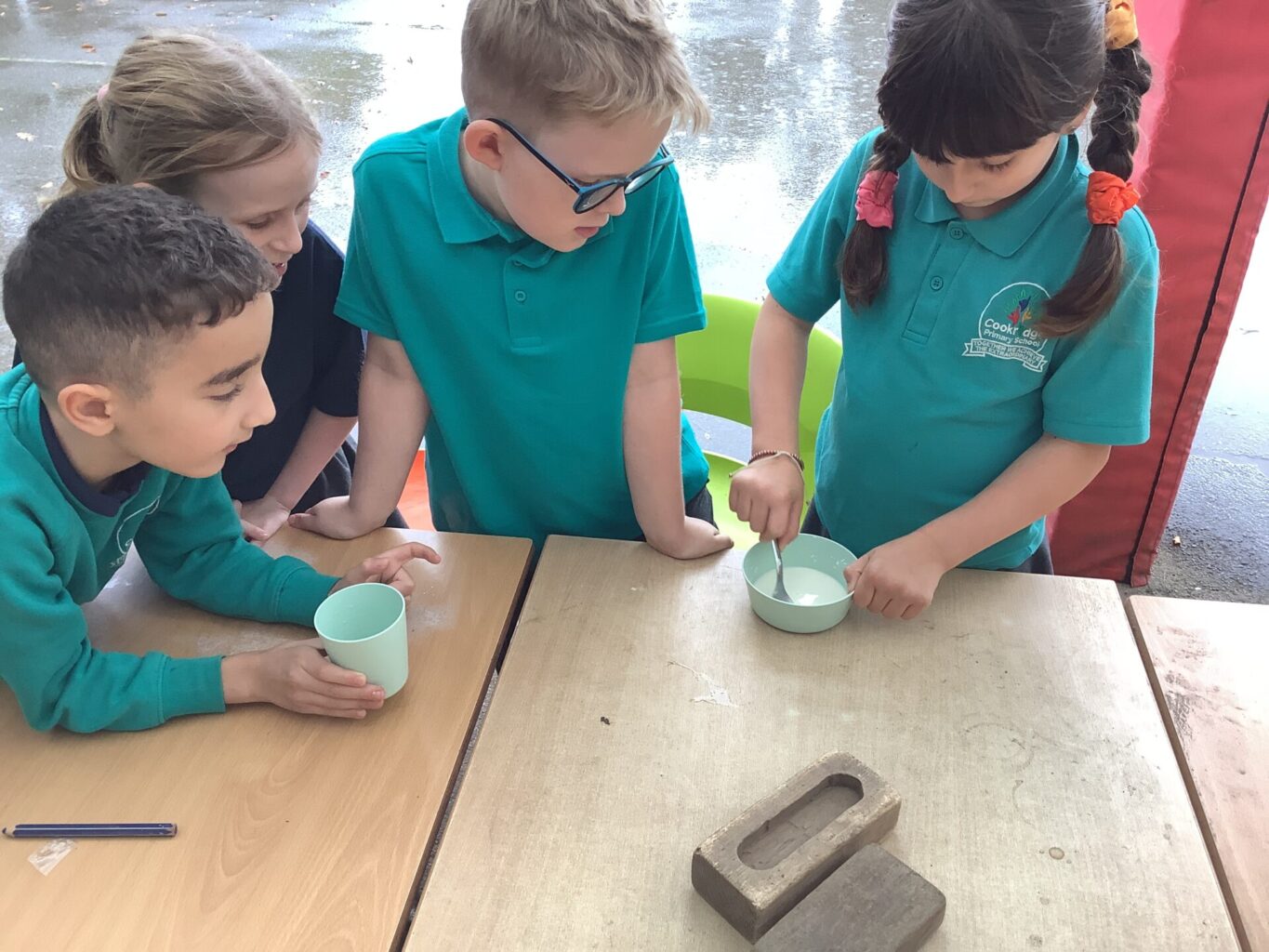 Today in science, we thought carefully about how to conduct an experiment. First, we considered what makes something an experiment, and learnt that it is to test something, record what happens, and use your observations to answer a question. We followed careful instructions to set up our own practical experiment by investigating whether cornflour and water make a solid or a liquid. We realised that the mixture could both be a solid and a liquid. This was because it is a ‘non-Newtonian liquid’ which means that the same material may appear more thick or runny in different situations – depending on the force or pressure applied to it.