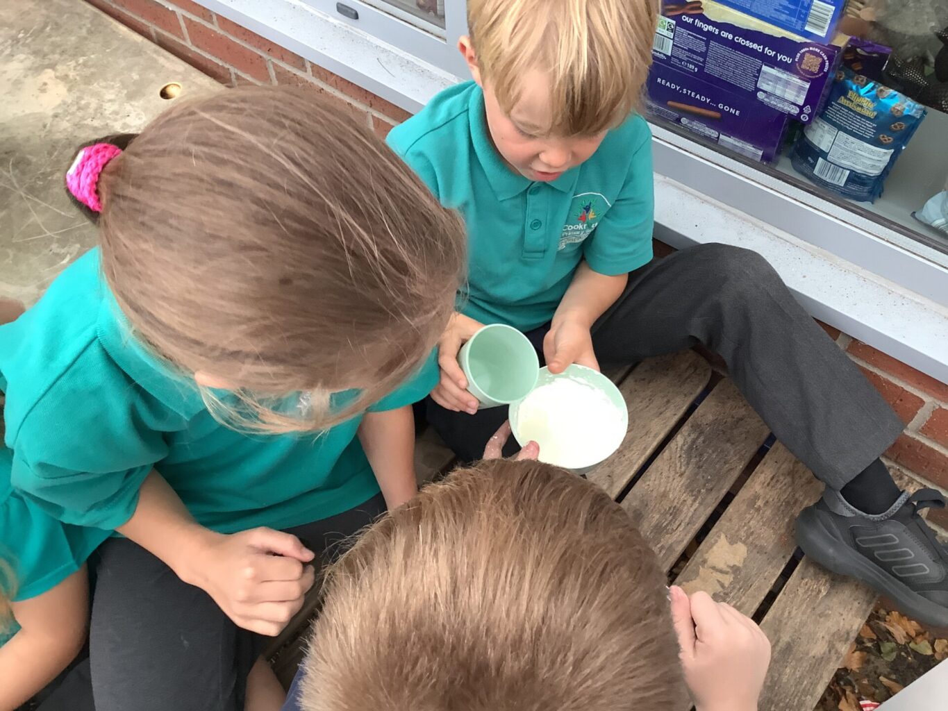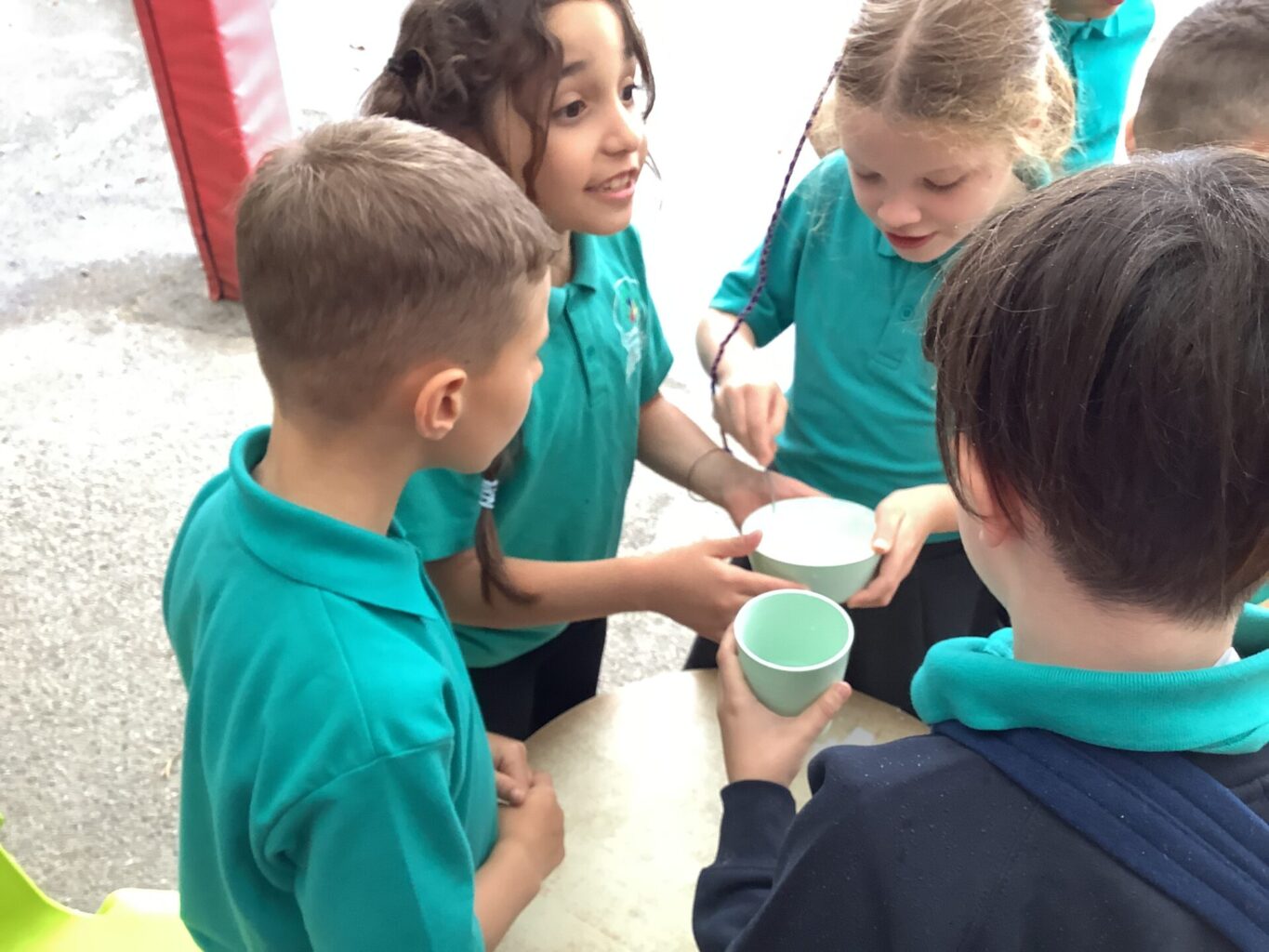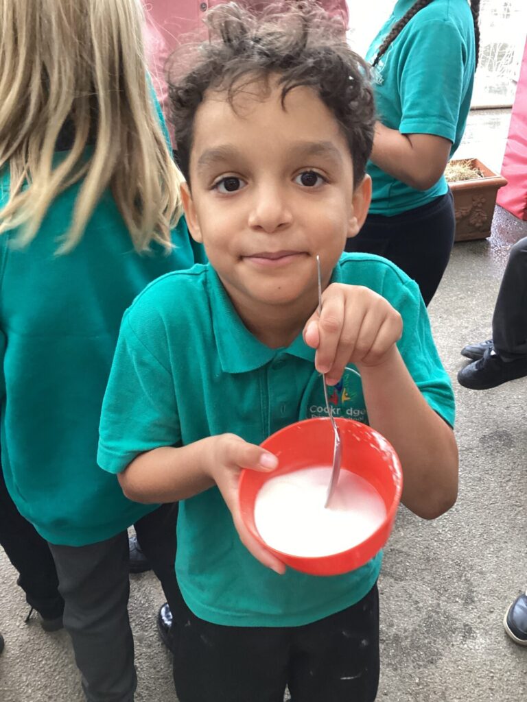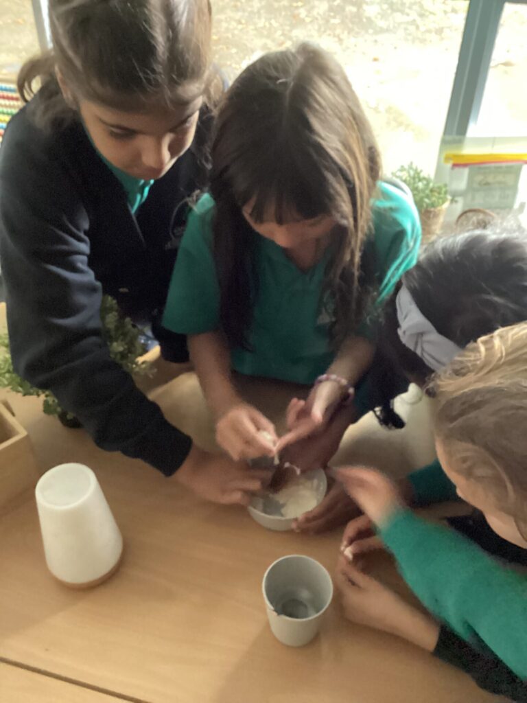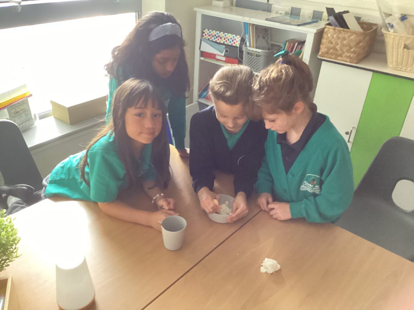 Today in science, we thought carefully about how to conduct an experiment. First, we considered what makes something an experiment, and learnt that it is to test something, record what happens, and use your observations to answer a question. We followed careful instructions to set up our own practical experiment by investigating whether cornflour and water make a solid or a liquid. We realised that the mixture could both be a solid and a liquid. This was because it is a ‘non-Newtonian liquid’ which means that the same material may appear more thick or runny in different situations – depending on the force or pressure applied to it.