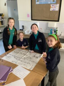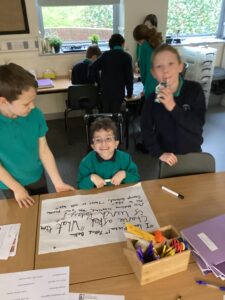 Today we worked in groups to practise using the correct punctuation in direct speech. We were given a set of reporting clauses along with speech, and first we had to match the speech with the most appropriate reporting clause. After sticking these on to sugar paper, we had to add in speech marks, commas and other punctuation to complete the sentences. Then, we practised changing the position of the reported clause, and thinking about what happened to the punctuation when we do this.