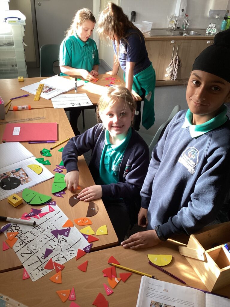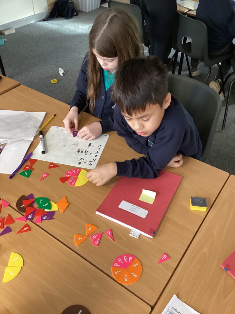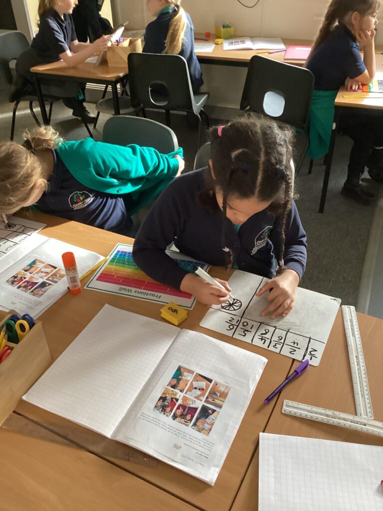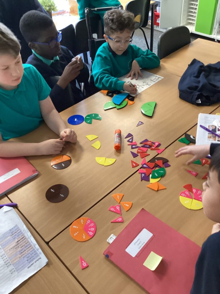 Today, we used a range of pictorial representations to investigate equivalent fractions and identify relationships between fractions with different denominators. We matched lots of different pictorial representations of fractions, writing the fraction which was represented. Then, we looked for and discussed links between fraction families. We used our times tables knowledge to notice the links between multiples in both the numerator and denominator of the fractions, helping us understand equivalent fractions.