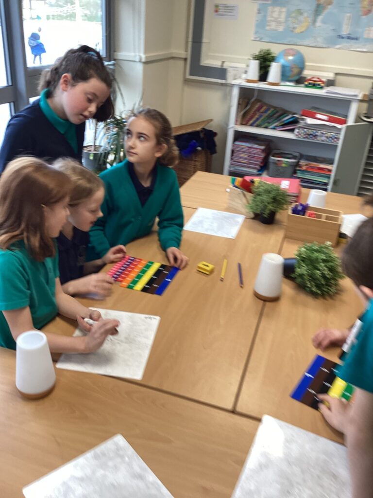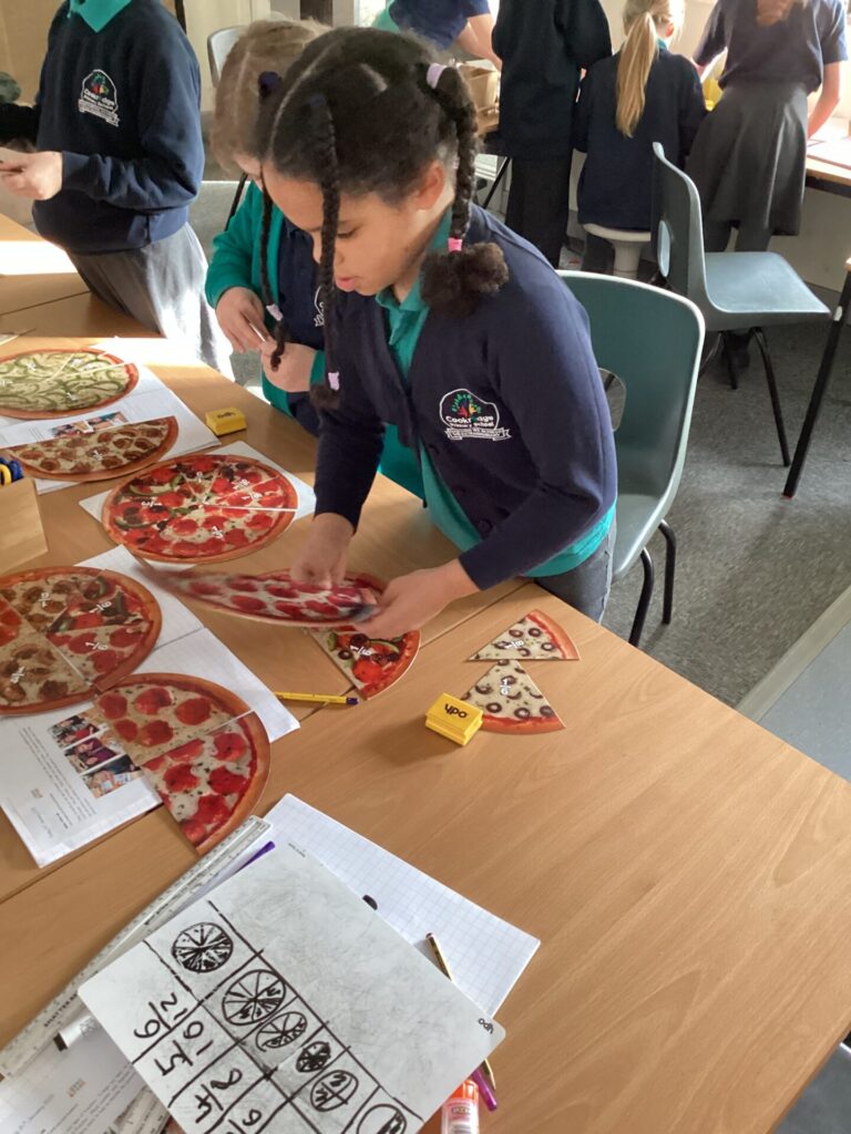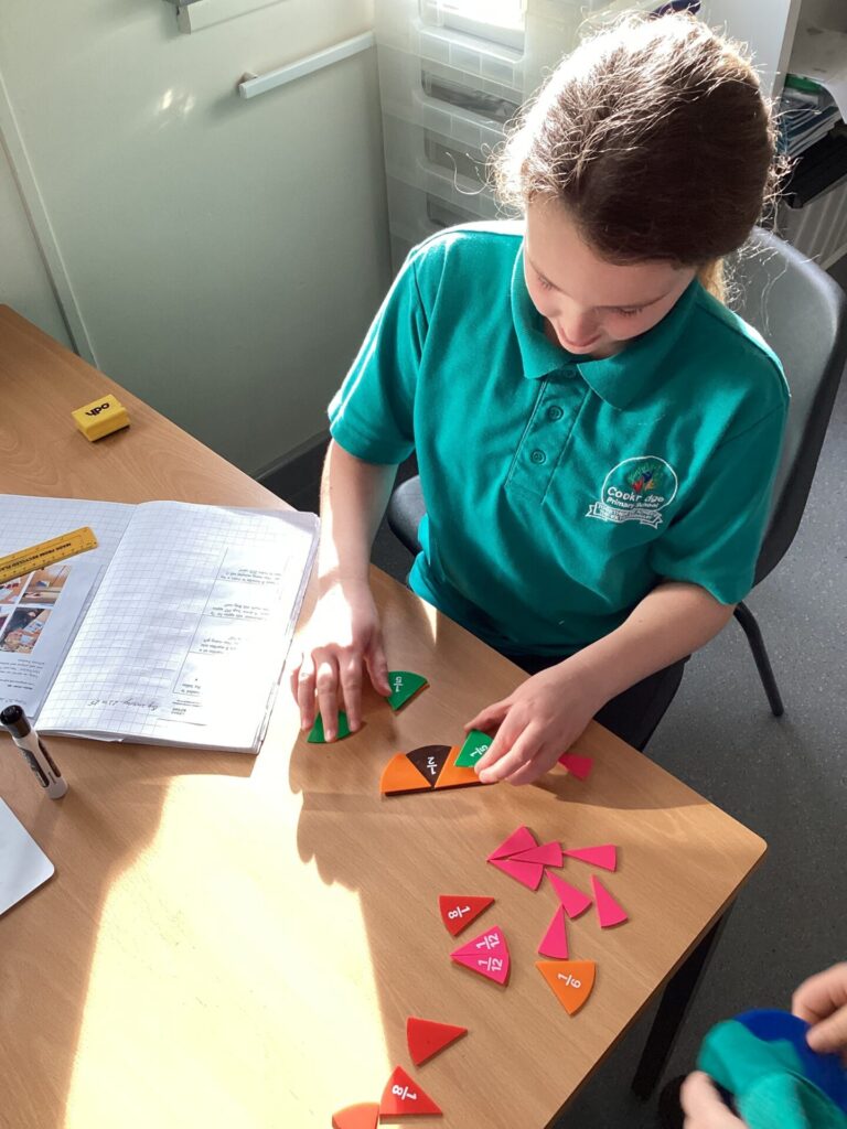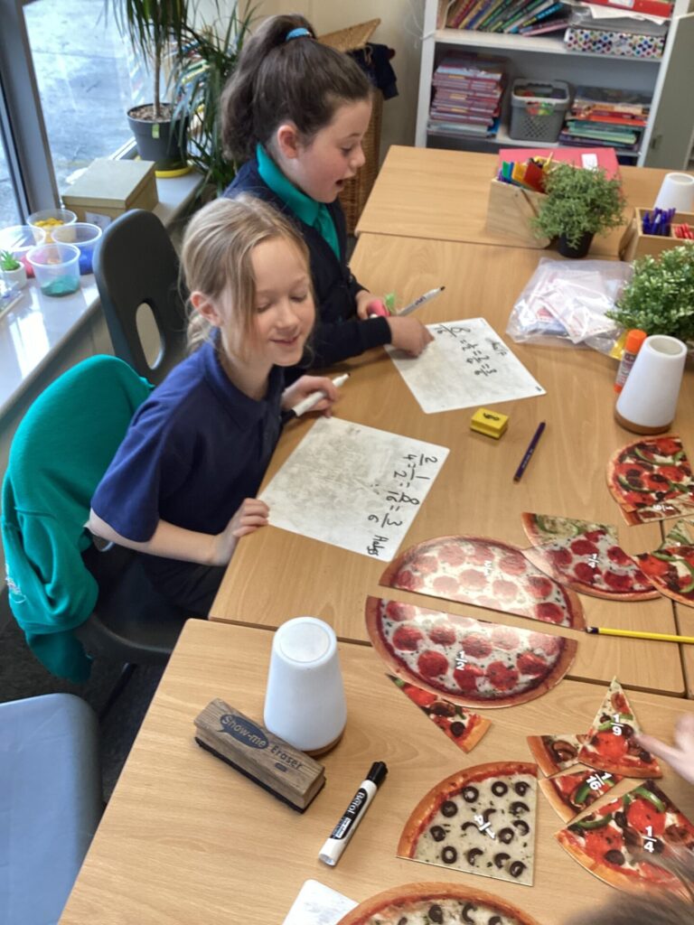 Today, we used a range of pictorial representations to investigate equivalent fractions and identify relationships between fractions with different denominators. We matched lots of different pictorial representations of fractions, writing the fraction which was represented. Then, we looked for and discussed links between fraction families. We used our times tables knowledge to notice the links between multiples in both the numerator and denominator of the fractions, helping us understand equivalent fractions.