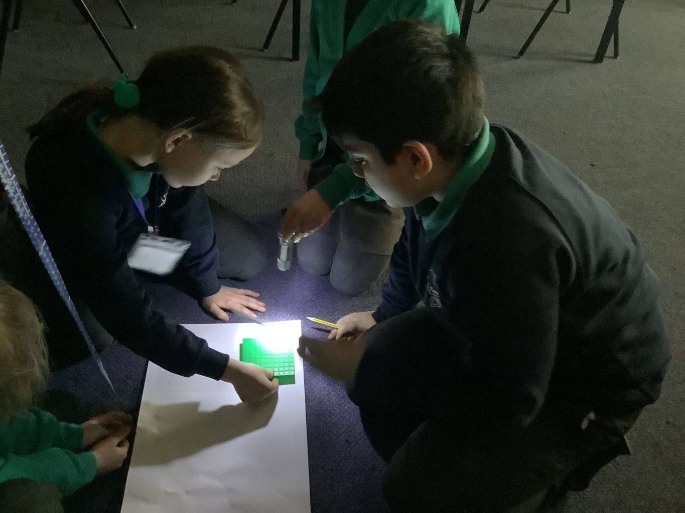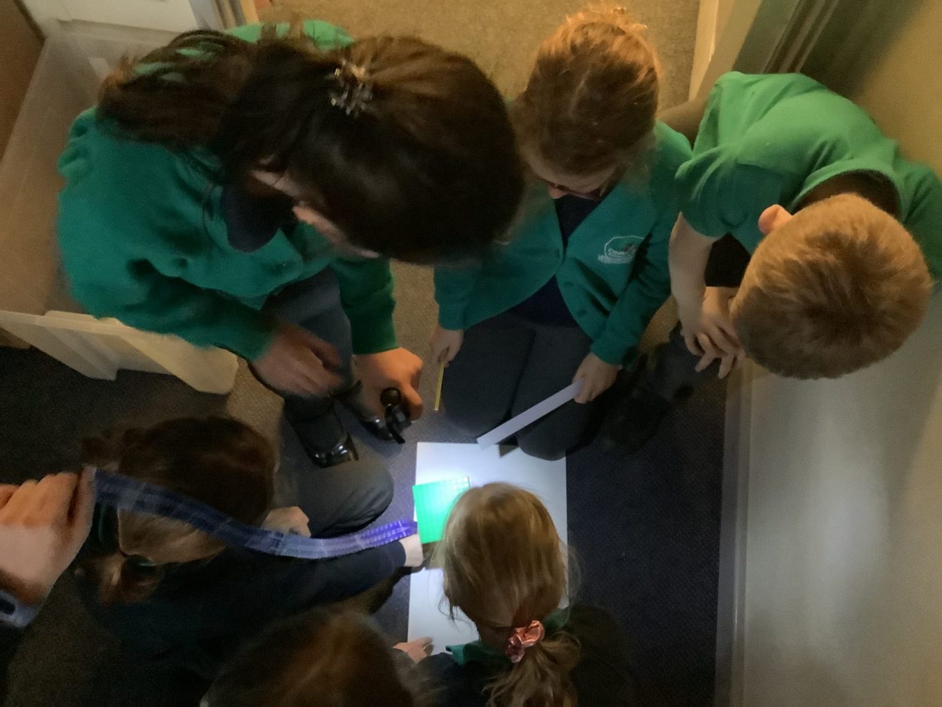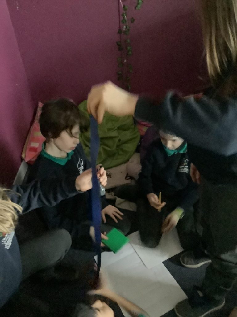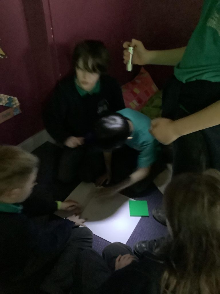 Yesterday, in science, we investigated how shadows are formed and how their shape and size can change. We started by experimenting with a torch and various objects, to see what we noticed about shadows. We found that some objects cast very interesting shadows, for example a water bottle. We also noticed that moving the light source made the shadow move.