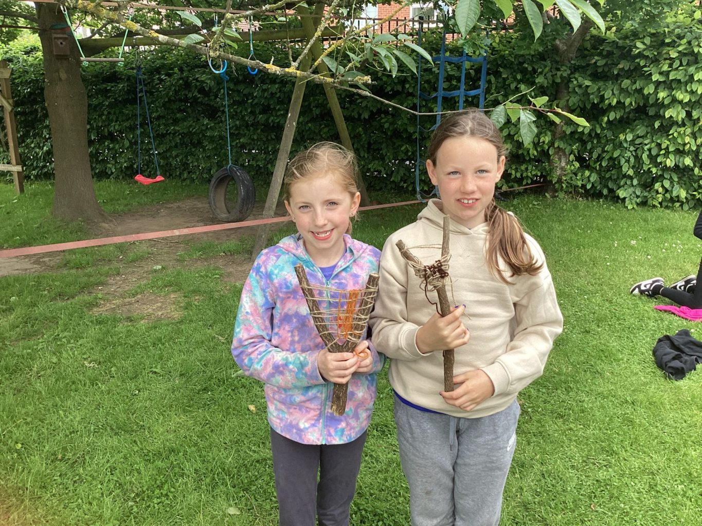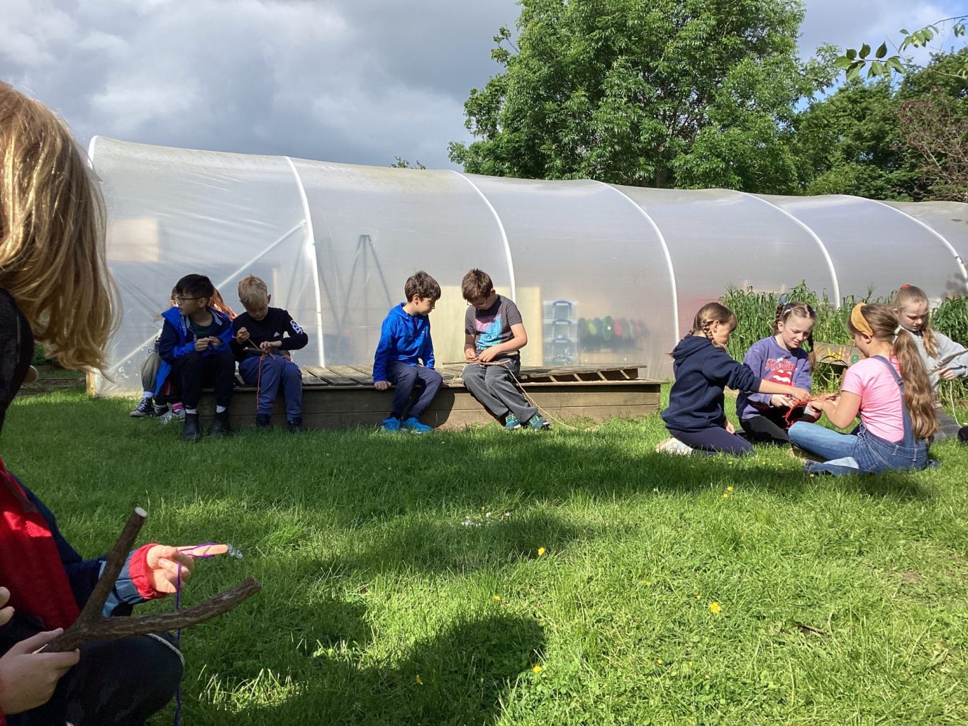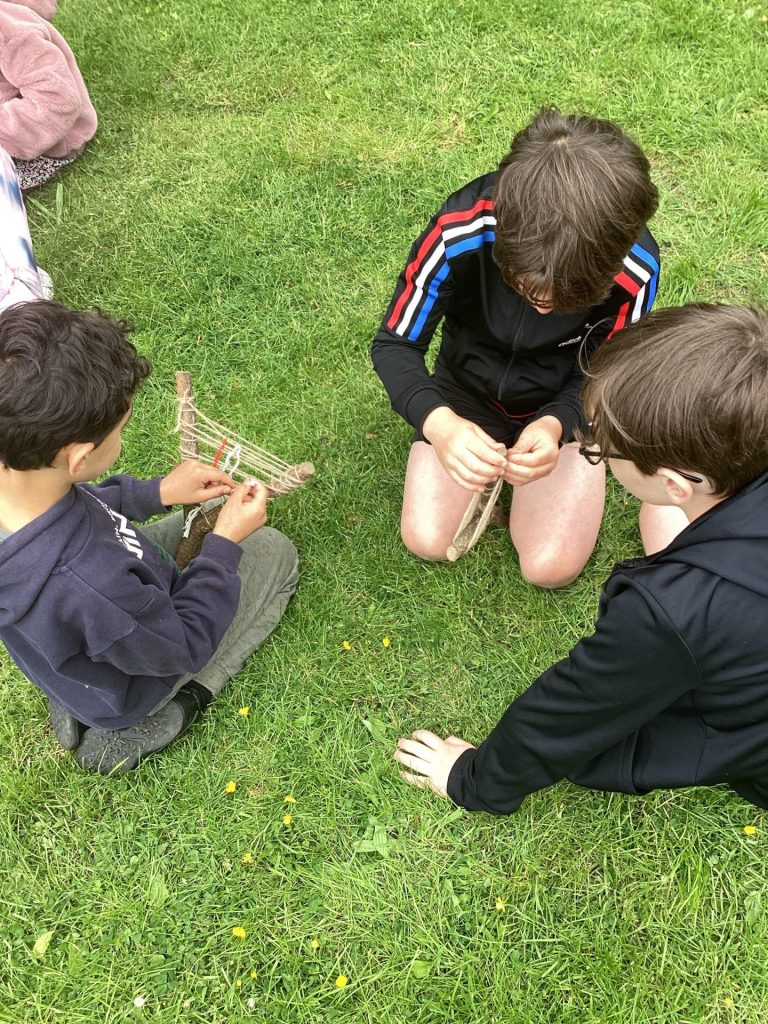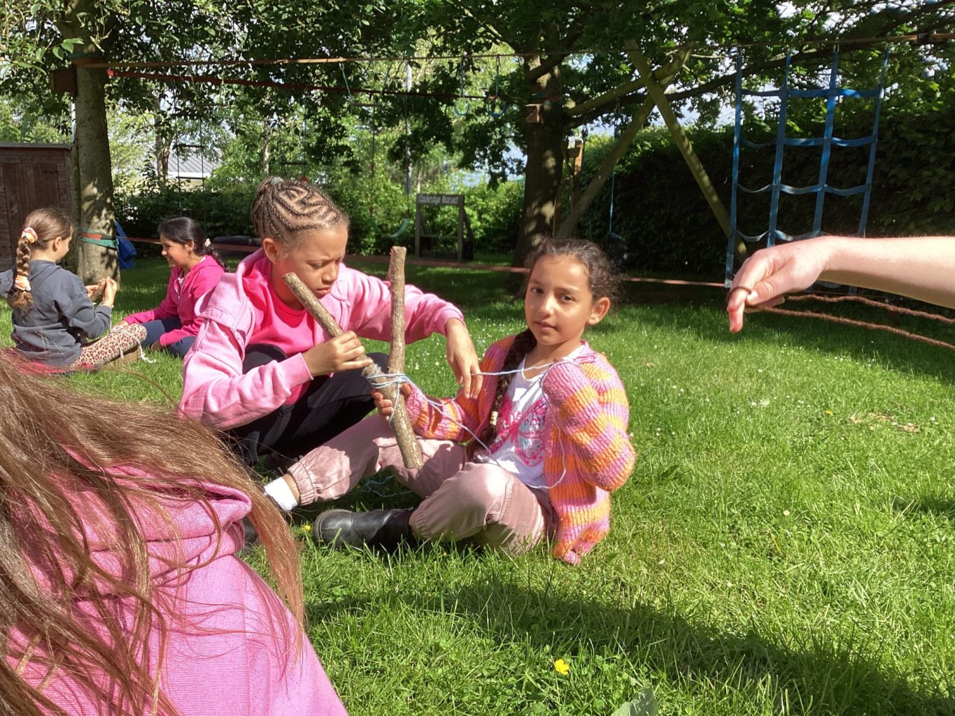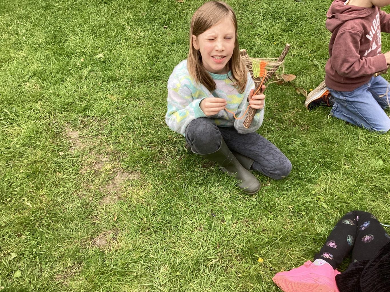 In forest school, we practised weaving. First we had to make our looms using twine and wrapping it around the sticks. Then, we had to weaved the material in between the looms. It was quite tricky, but we enjoyed being outside and using our resilience and perseverance to have a go.