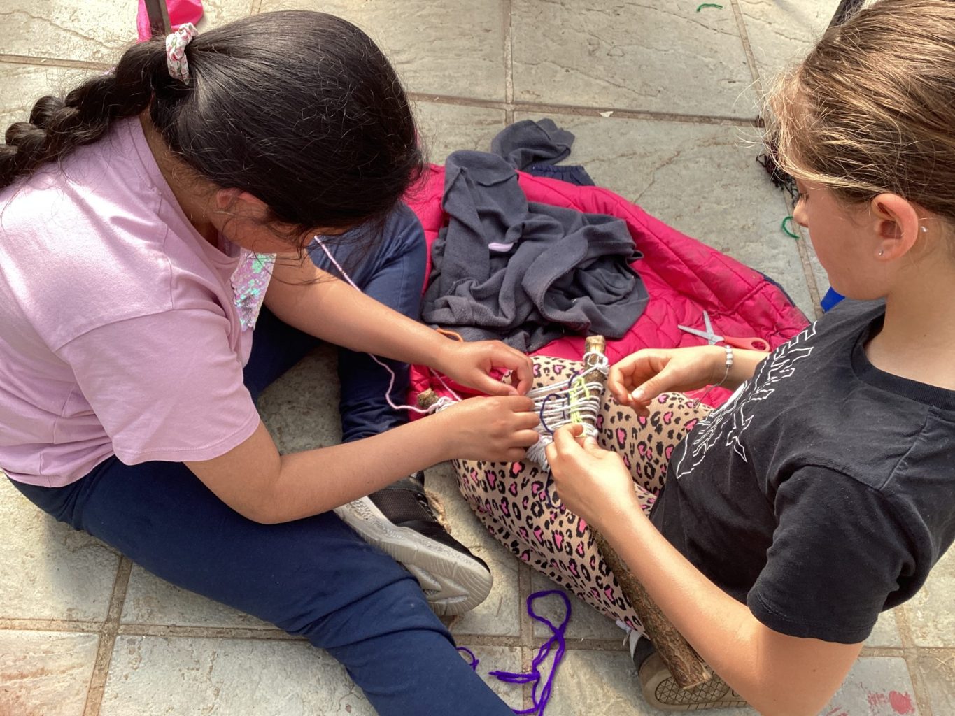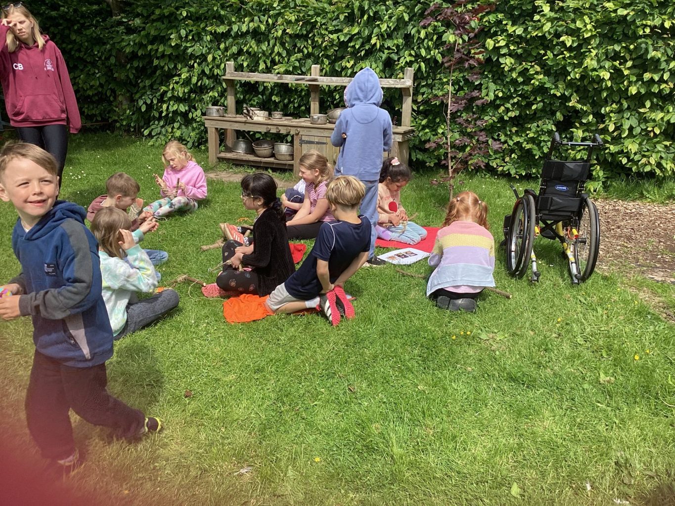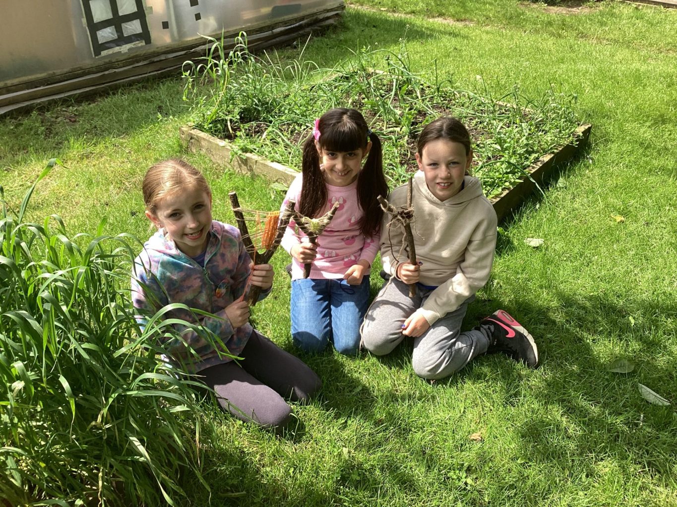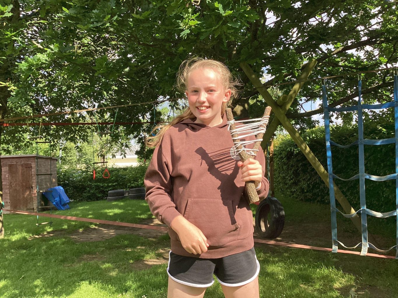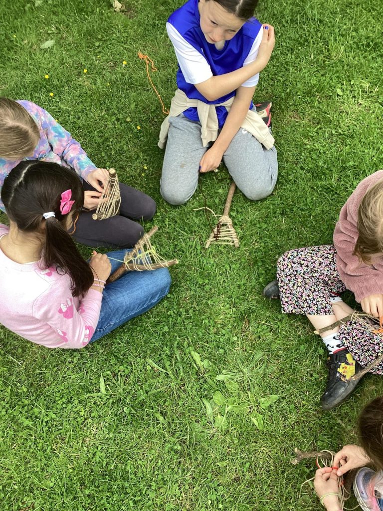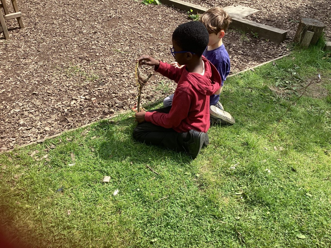 In forest school, we practised weaving. First we had to make our looms using twine and wrapping it around the sticks. Then, we had to weaved the material in between the looms. It was quite tricky, but we enjoyed being outside and using our resilience and perseverance to have a go.