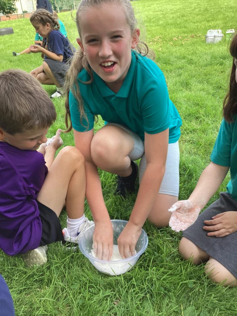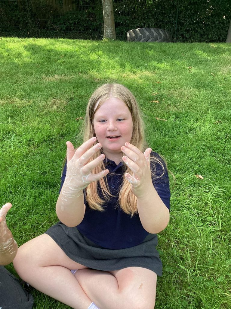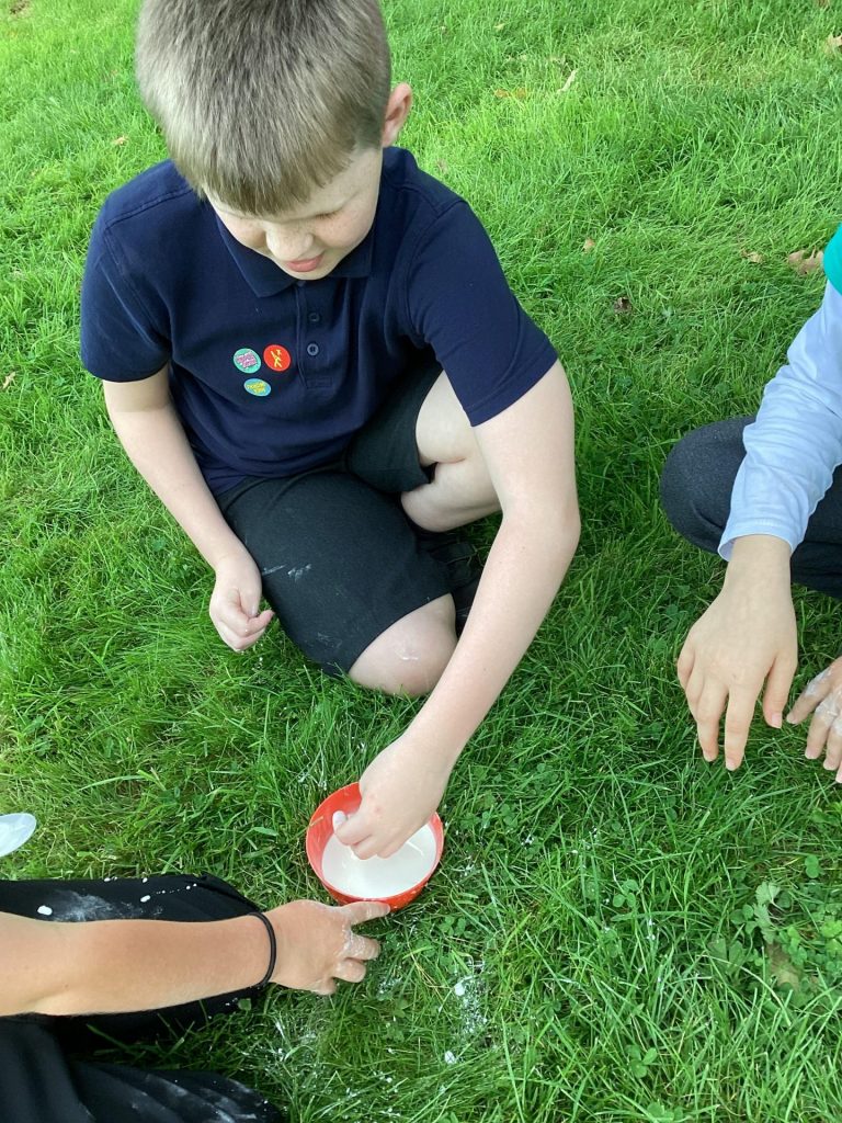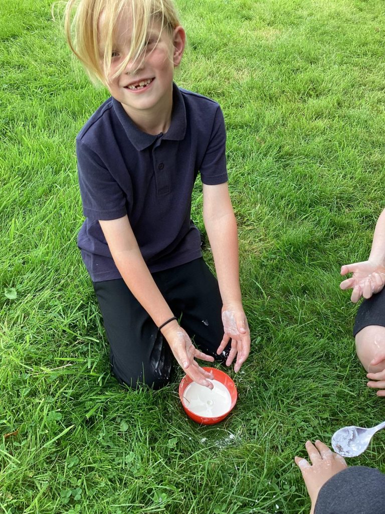 In science, we thought carefully about how to conduct an experiment. First, we considered what makes something an experiment, and learnt that it is to test something, record what happens, and use your observations to answer a question. We followed careful instructions to set up our own practical experiment by investigating whether cornflour and water make a solid or a liquid. We realised that the mixture could both be a solid and a liquid. This was because it is a ‘non-Newtonian liquid’ which means that the same material may appear more thick or runny in different situations – depending on the force or pressure applied to it.