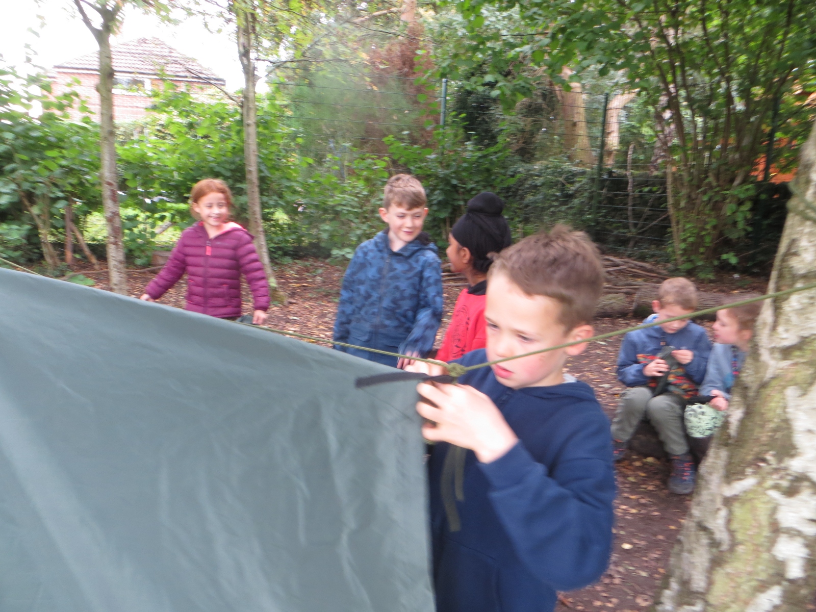 Today, LKS2 we have put their knot knowledge to the test by creating shelters using Bowline and Prusick knots. Teams were given a shelter building kit box which contained a tarp, tent pegs, paracord and a float line rope. After a crash course in how to erect the shelter correctly, children worked together and problem solved continuously to build a shelter that could keep them dry if it rained and could fit all members of the group inside. Afterwards, we reviewed and reflected on the session and discussed ways to improve our shelters next time.