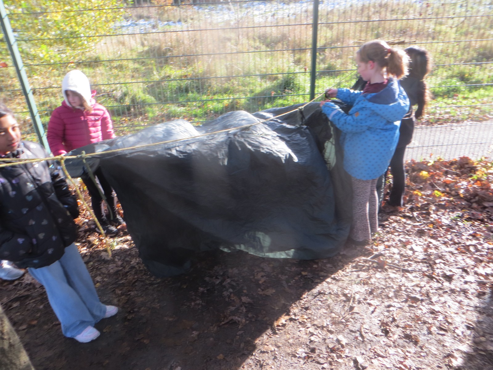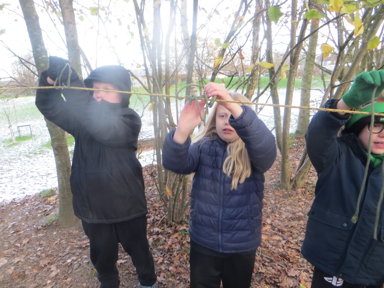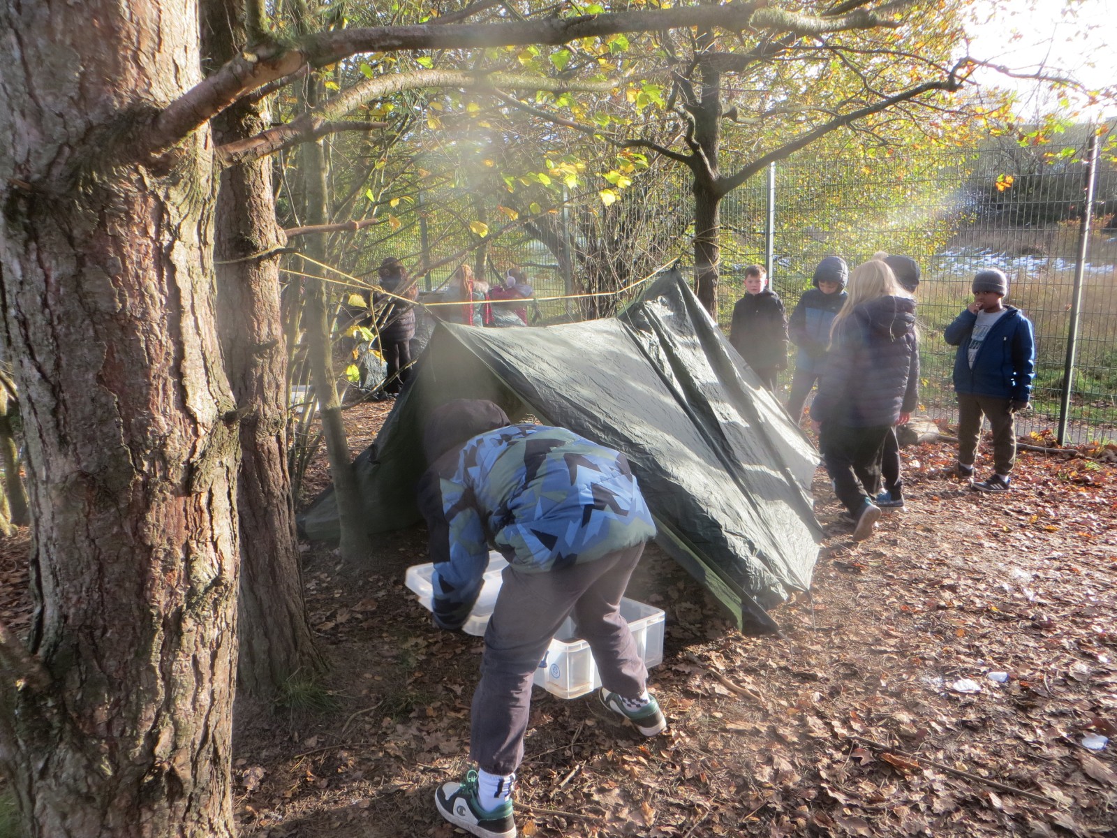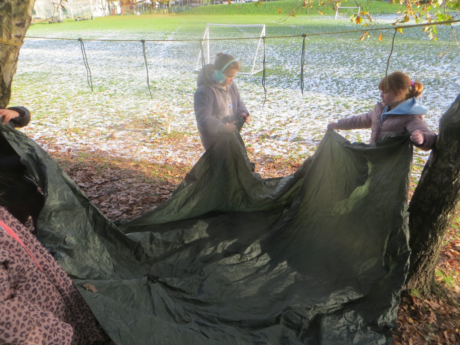 Today, in a bitterly cold wind, pupils in LKS2 completed their series of sessions using knots to make shelters. The lesson began in the classroom where pupils had a quick reminder and practice of the Bowling Knot as well as tying the other end of the rope to keep it taught. Next, pupils reviewed their last session where they celebrated what went well and offered advice and tips on what, and how, certain things could be improved. Afterwards, classes ventured outside to create their shelter in teams of their own choosing. As they went along, they learnt the importance of problem solving, working methodically and how teamwork, communication and respect for each other were just as important as the skills needed in tying knots and erecting a shelter.