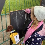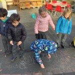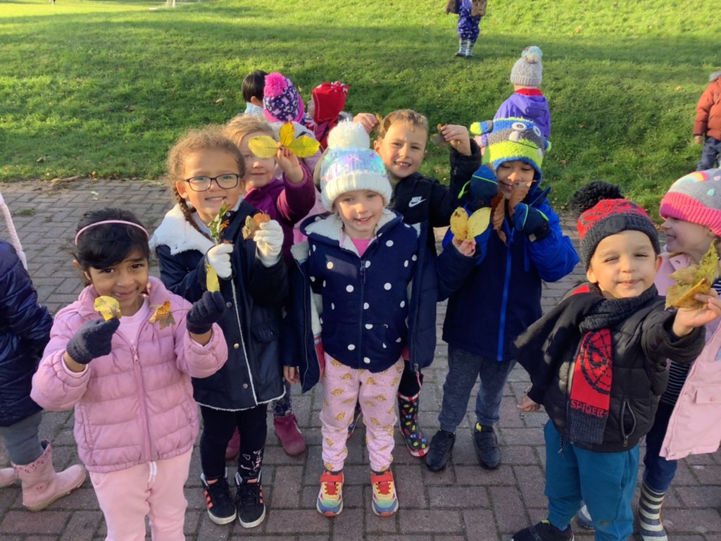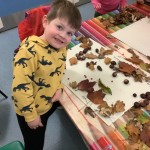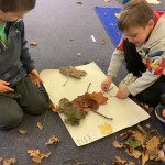 Thursday was our Forest Schools session and we all enjoyed a glorious sunny day in the school gardens. We took full advantage of the beautiful autumn colours to search for leaves of differing colours, sizes and shapes. We counted, compared and examined these leaves, and examined trees closely to locate where each leaf had fallen from. We took a mountain of specially chosen leaves back to the classroom to create some marvelous ‘transient’ artworks using these natural materials.