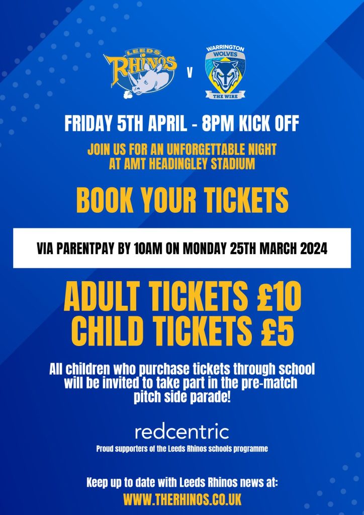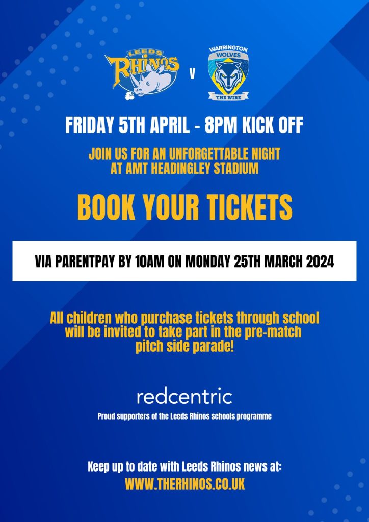 As part of our partnership, and as a thank you for all the great work that the children have been doing this year, Leeds Rhinos would like to offer children and their families an amazing opportunity to attend a match at AMT Headingley Stadium at a special discounted schools rate. This offer is a fantastic offer and is better than any offer around. It will be an amazing opportunity for children to experience a live sporting event with the atmosphere and enthusiasm of supporters around them.