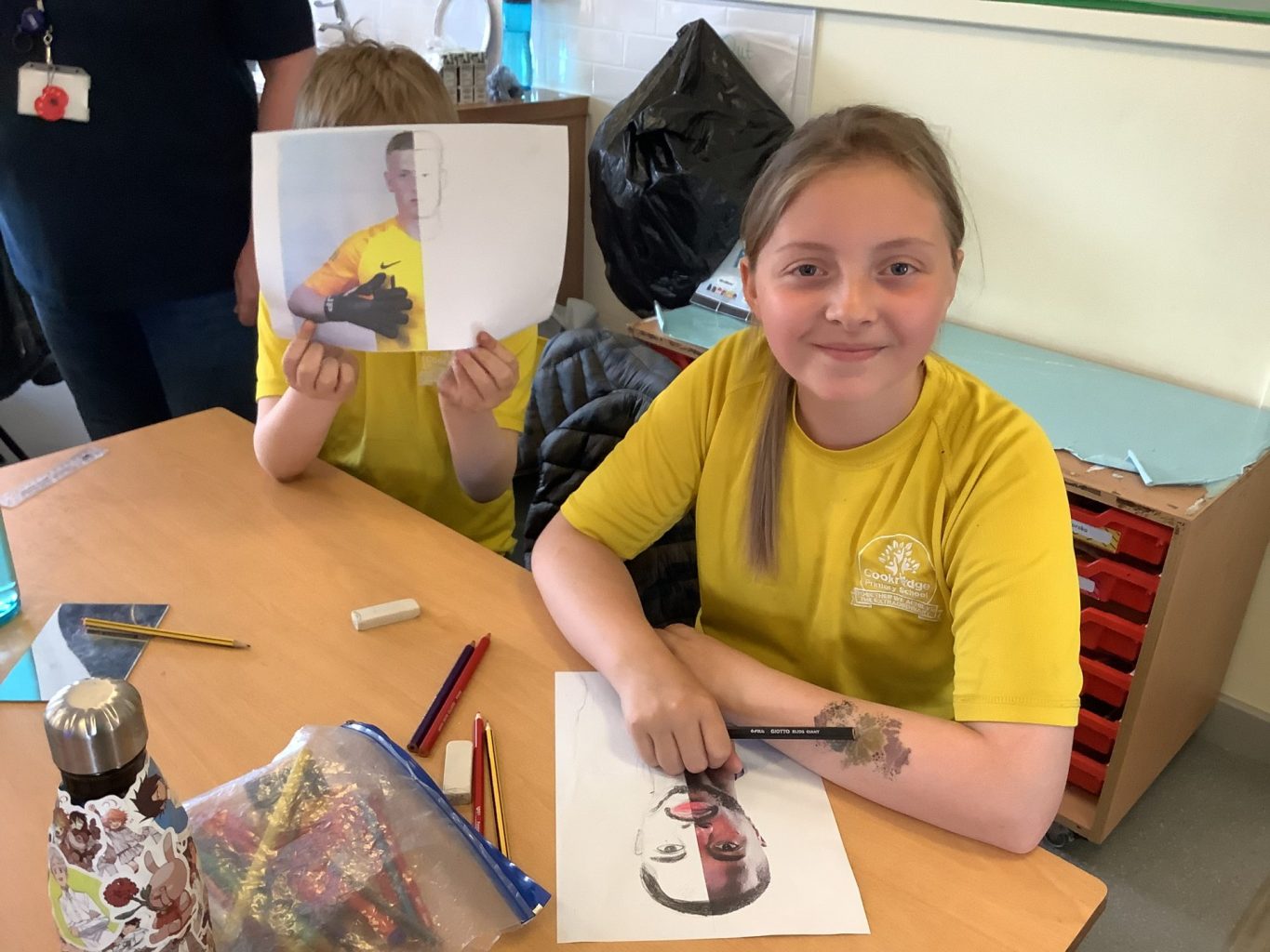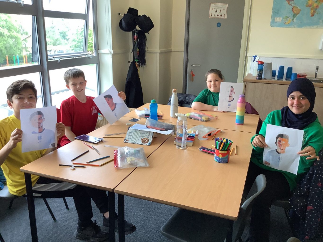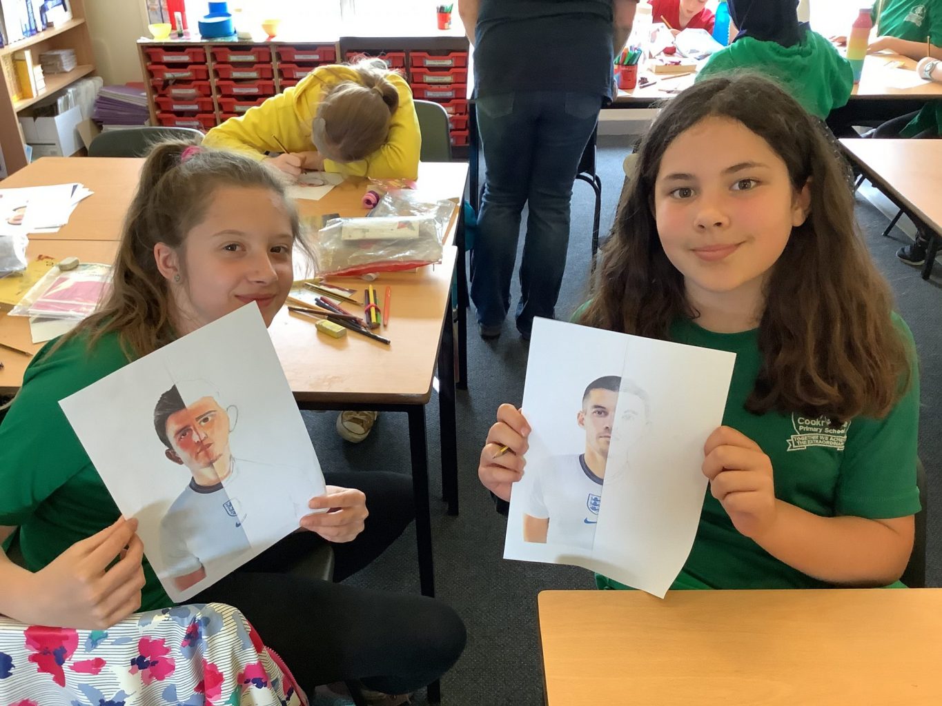 Today UKS2 enjoyed a varied and exciting day in PPA. In PE, the children had their first rounders lesson. Focusing on the key skills of throwing, fielding and batting, the children then took part in some small sided games. In music, the children used boom whackers to play some of their favourite songs. Finally in art, the children were sketching the England football team, following their emphatic victory against Croatia. After being given half the player’s face, the children used mirrors to sketch the rest.