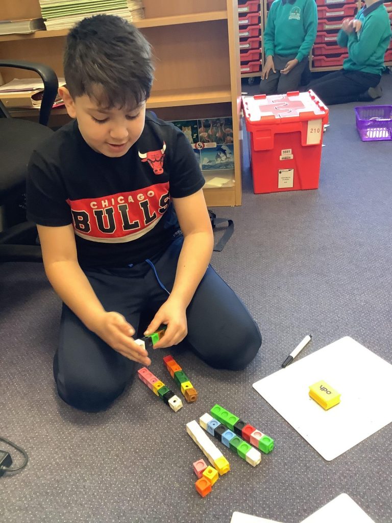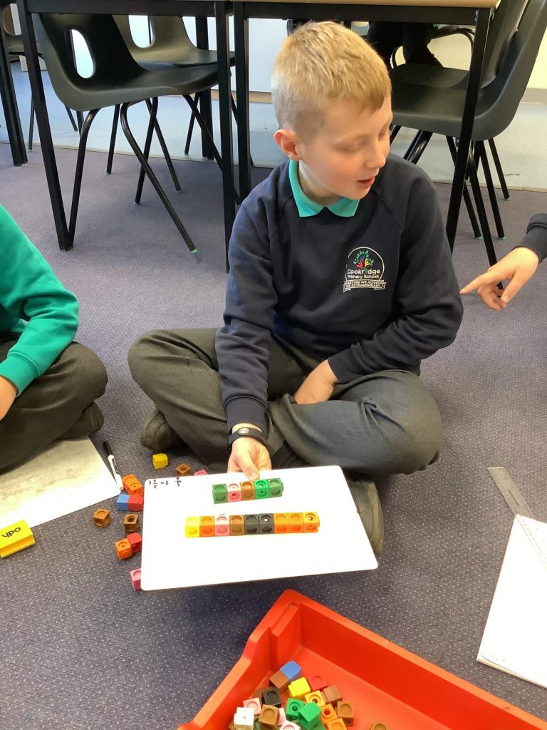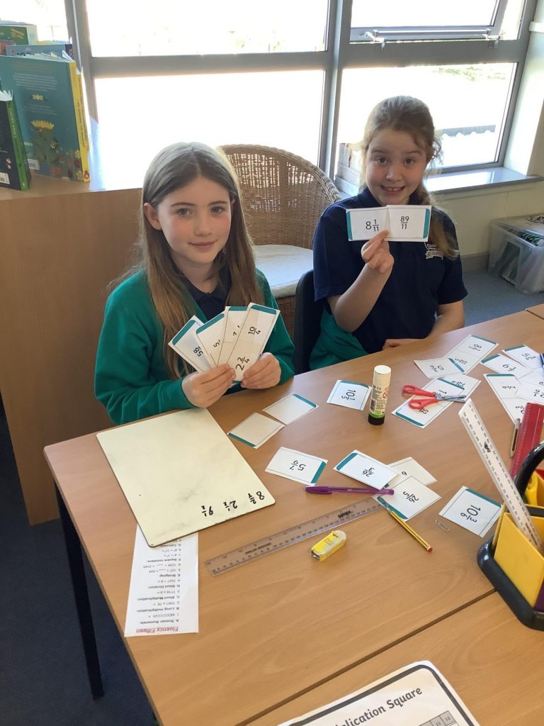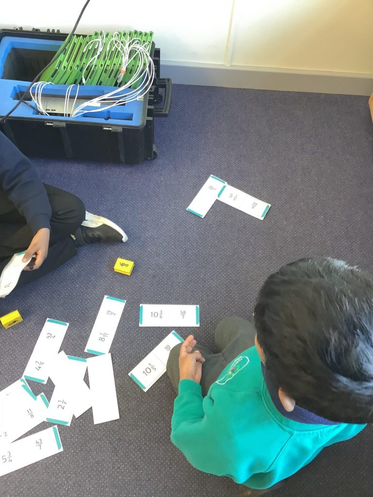 Blue group practised converting between mixed numbers and improper fractions by playing dominoes. Using their whiteboards for working out, and their partners to help address misconceptions; the children practised the skills we learnt before Easter.