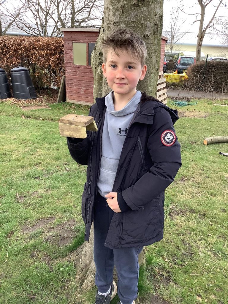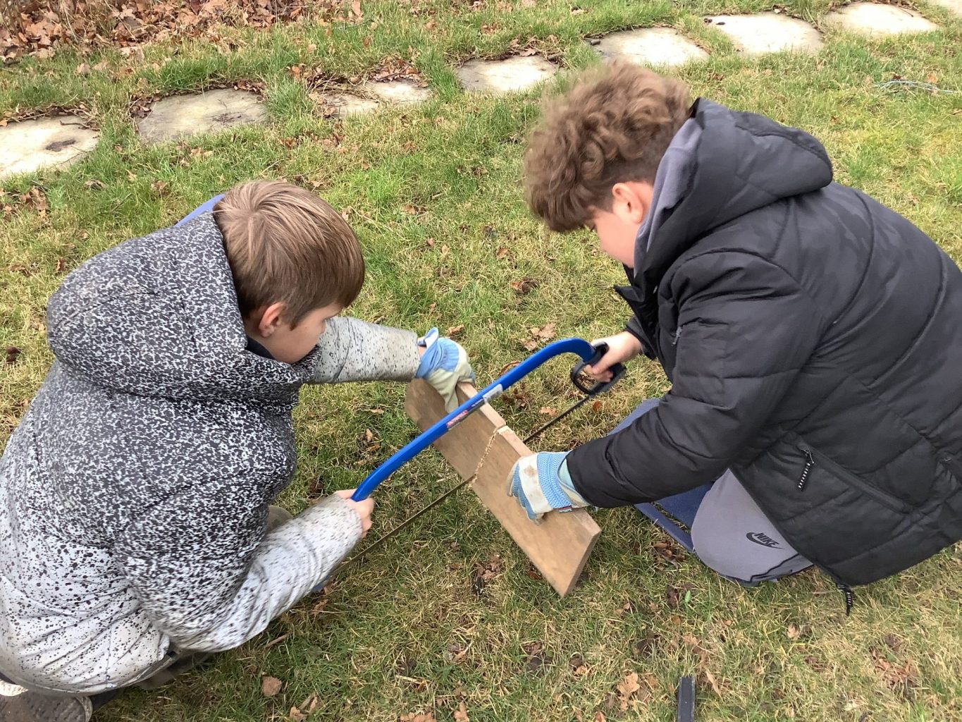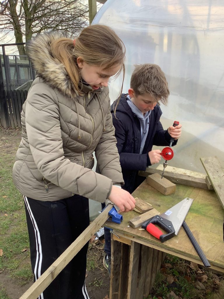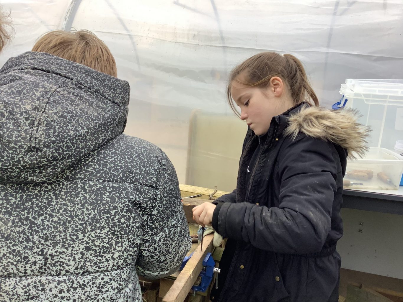 Class 9 went out into the garden and practised their skills with the tools. This included using bow saws, saws, palm drills, whittling knives and hammering nails. The children will use these skills to create their bird box later this term!