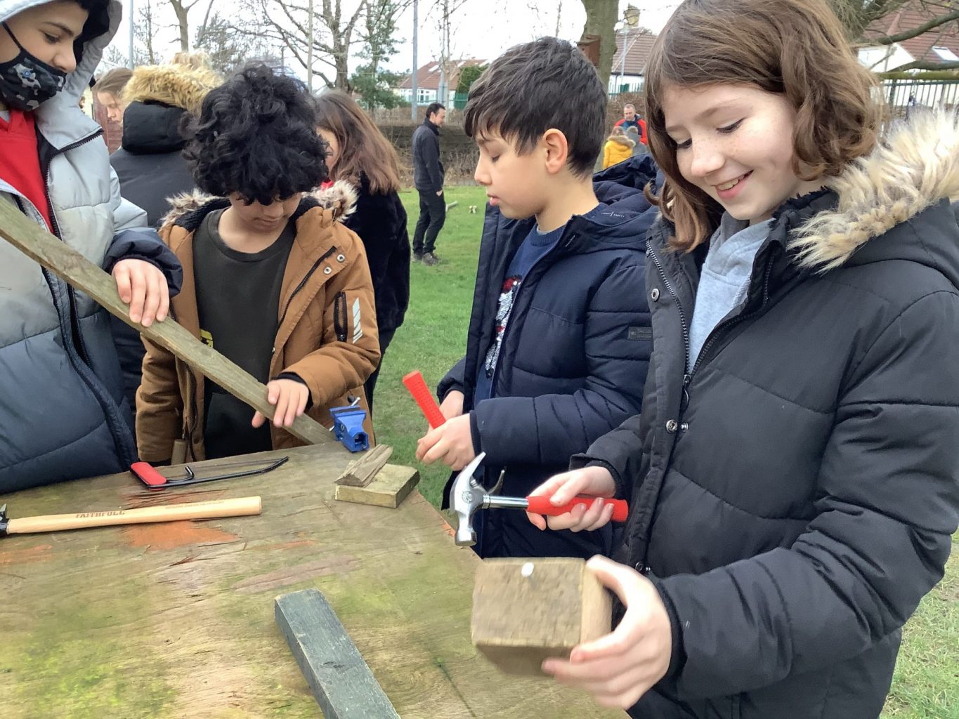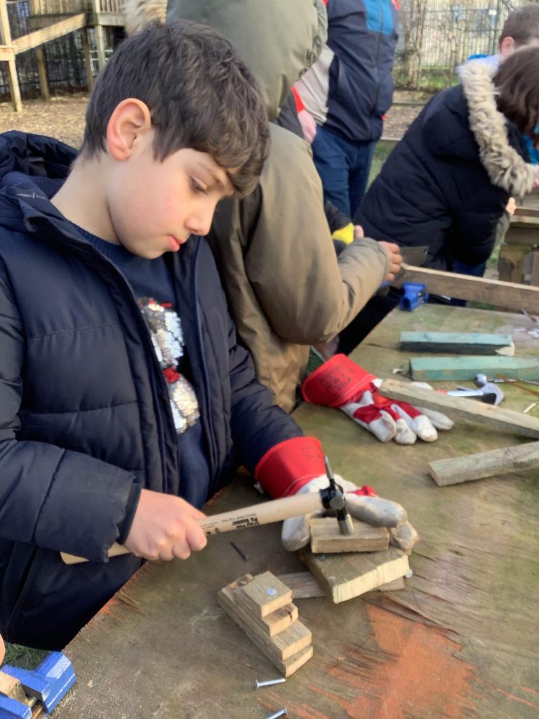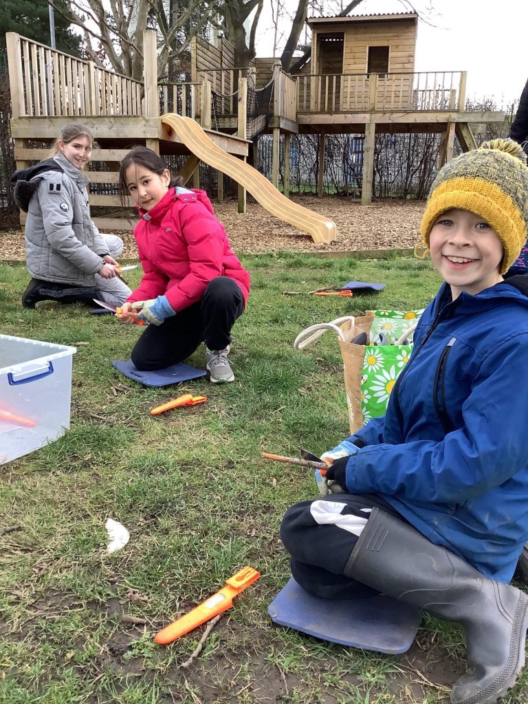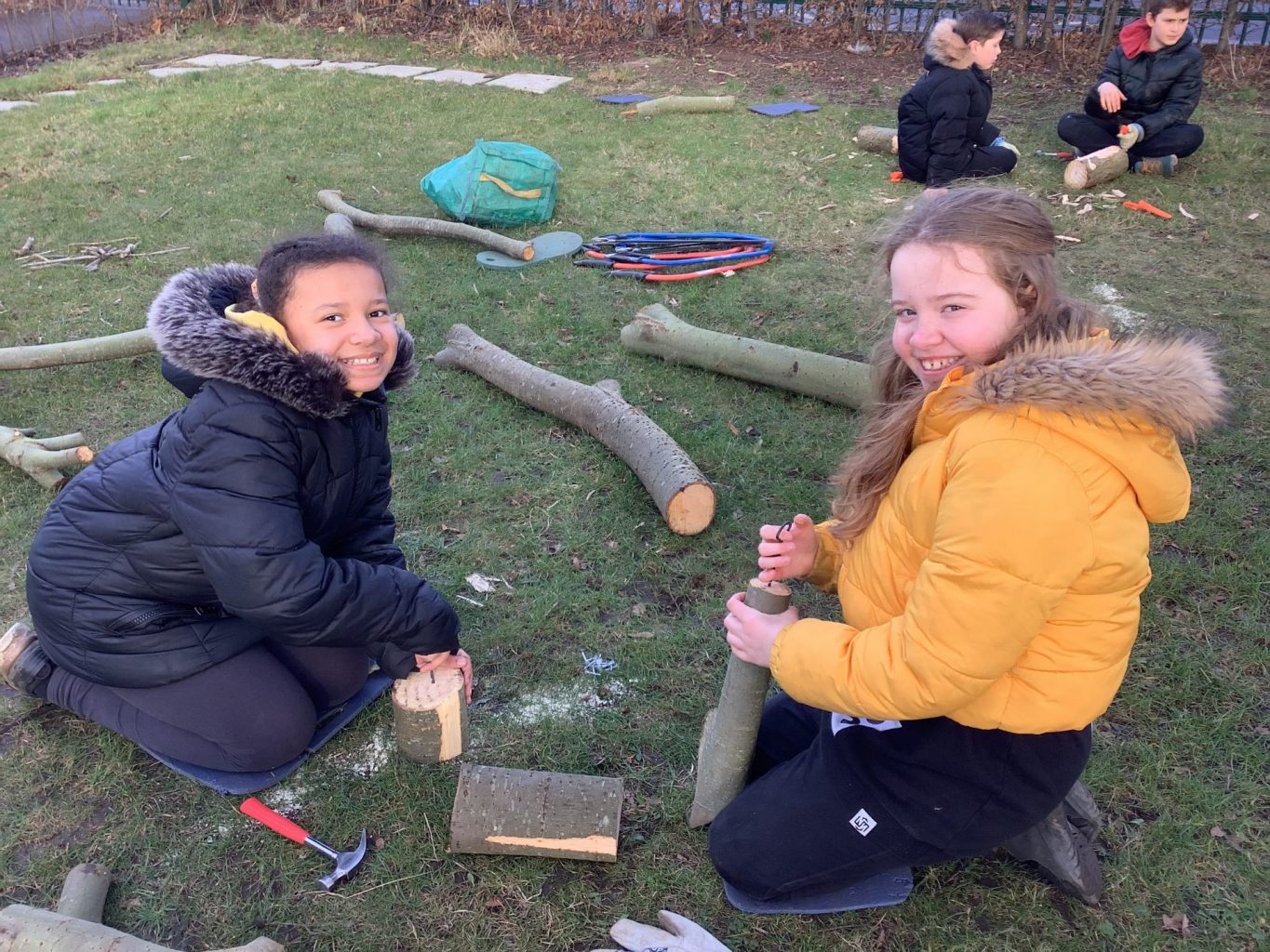 Class 9 went out into the garden and practised their skills with the tools. This included using bow saws, saws, palm drills, whittling knives and hammering nails. The children will use these skills to create their bird box later this term!