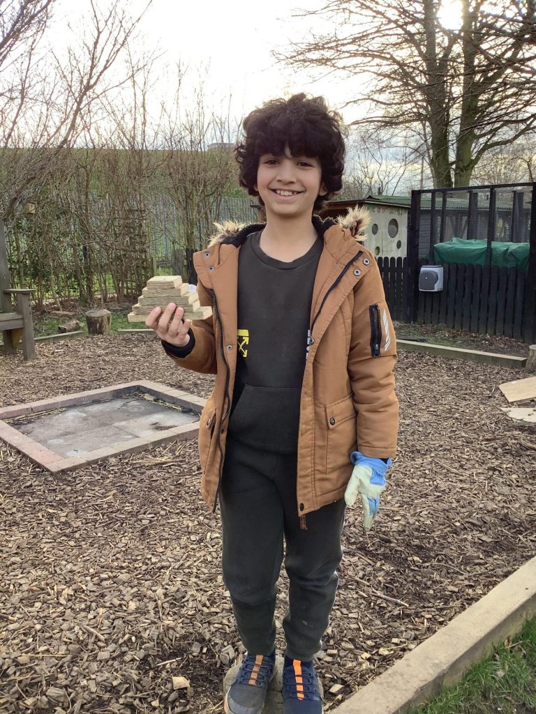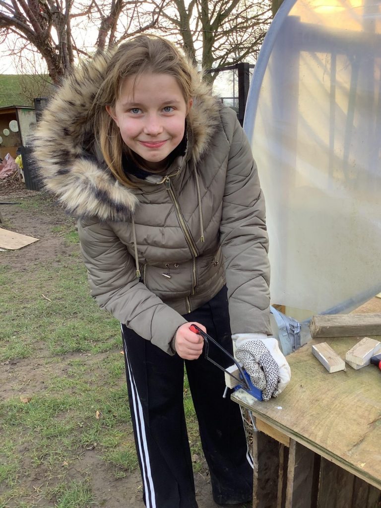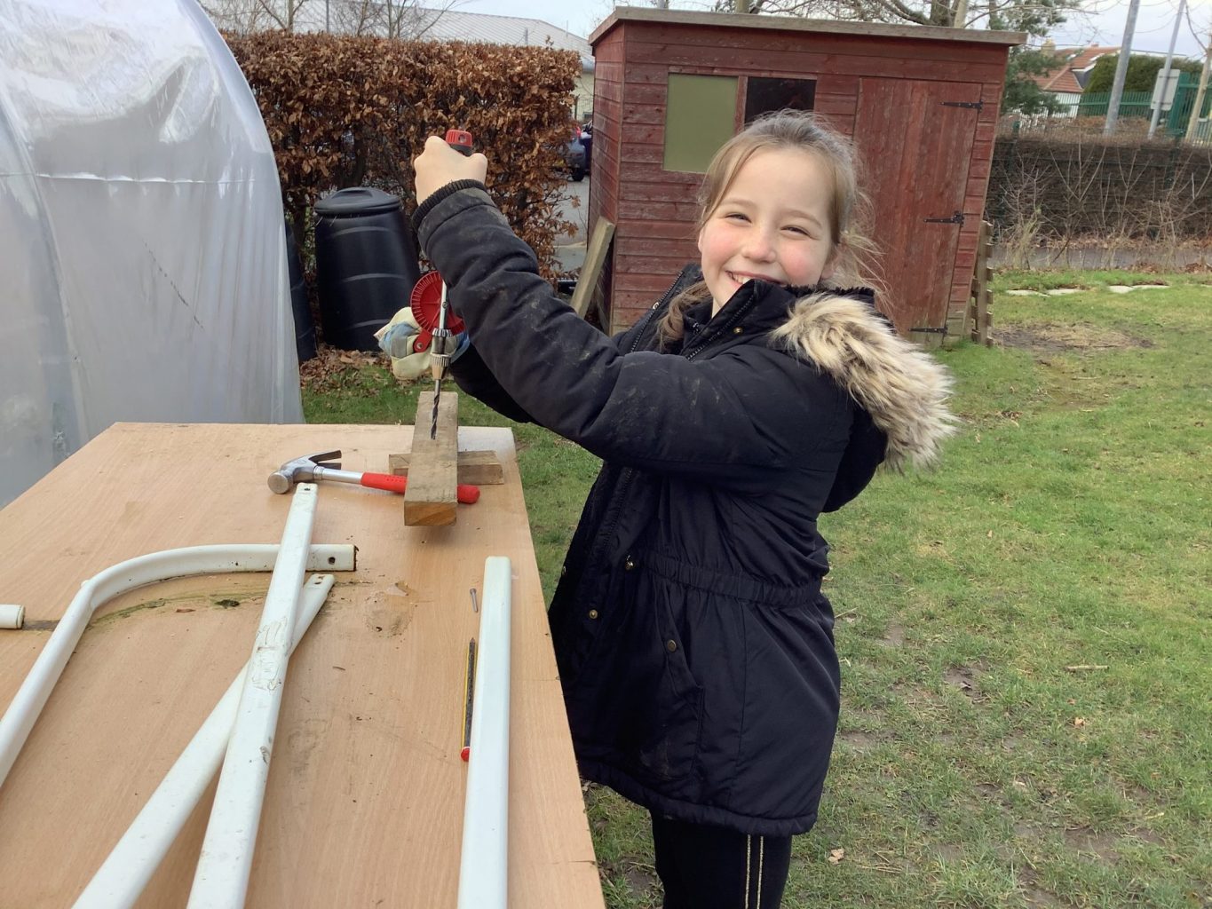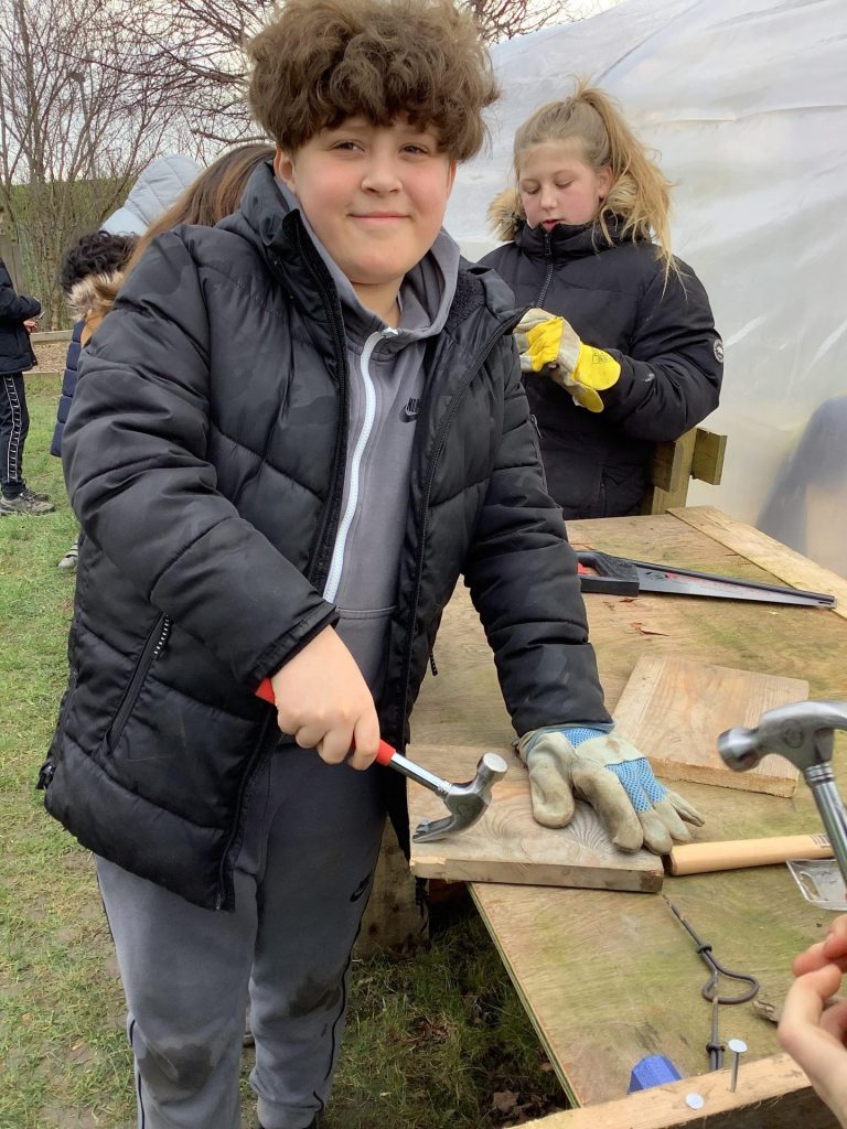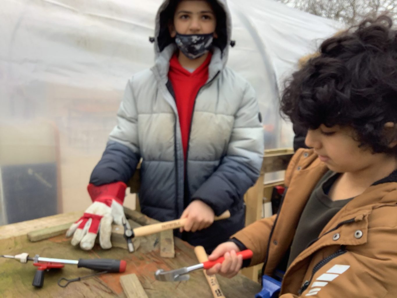 Class 9 went out into the garden and practised their skills with the tools. This included using bow saws, saws, palm drills, whittling knives and hammering nails. The children will use these skills to create their bird box later this term!